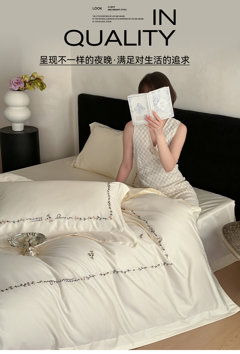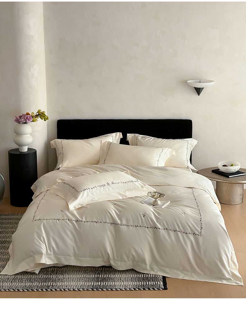 商品名称:名品优仓 2026新款长绒棉50s全棉纯棉刺绣宽边款四件套-花园密语 花园蜜语-奶芋色