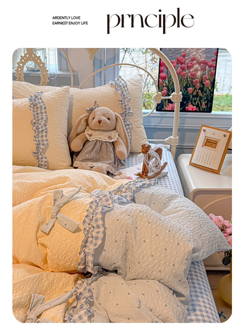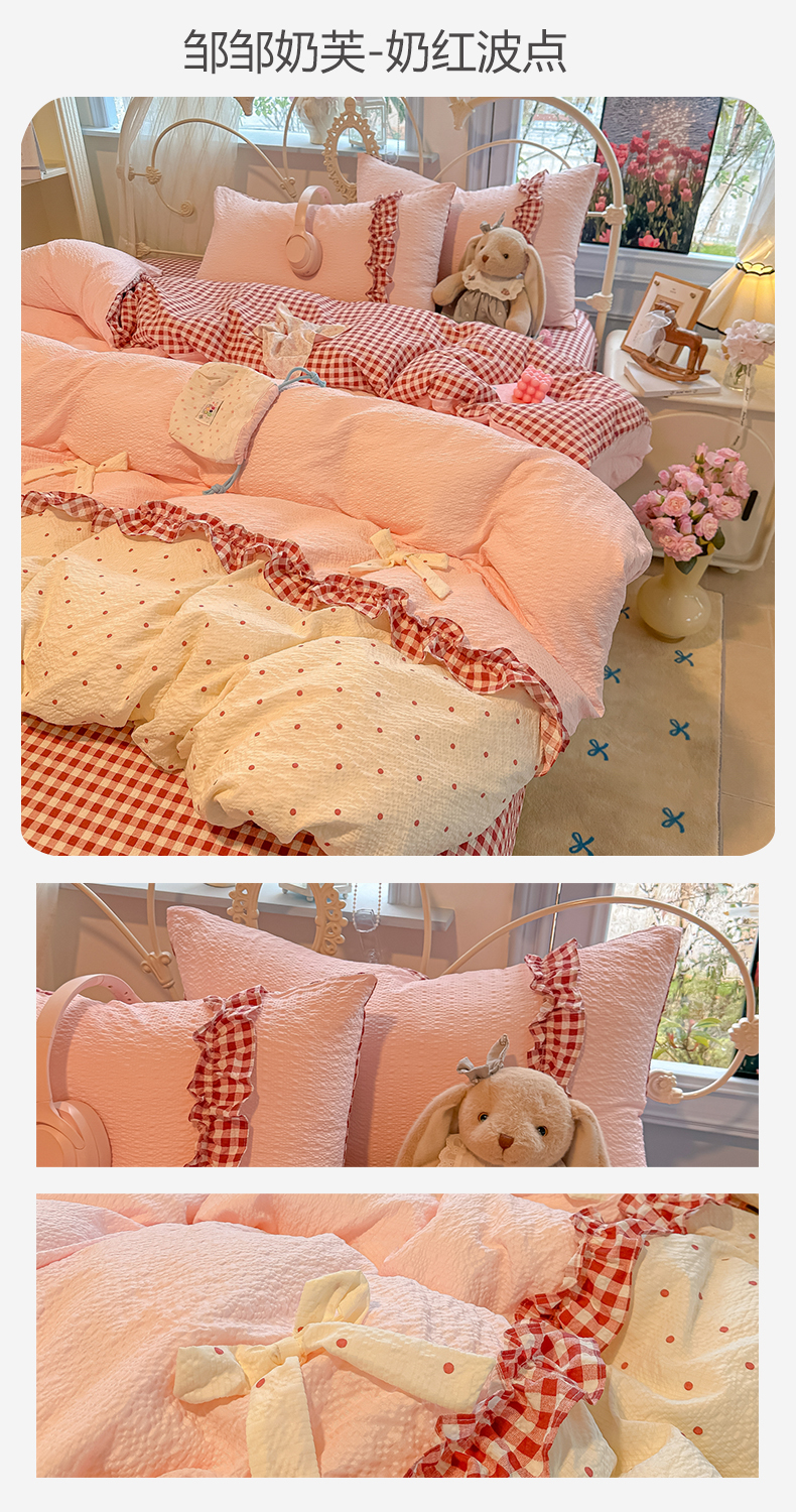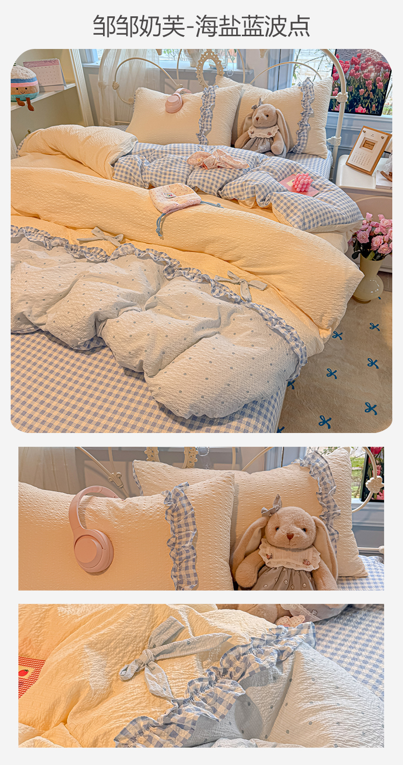 (总)子钦家纺 2026春夏新款提花泡芙棉蝴蝶结拼角工艺床单床笠四件套-缪斯之恋,缪斯之恋-海盐蓝,缪斯之恋-奶粉波点,缪斯之恋-奶红波点,缪斯之恋-奶灰波点