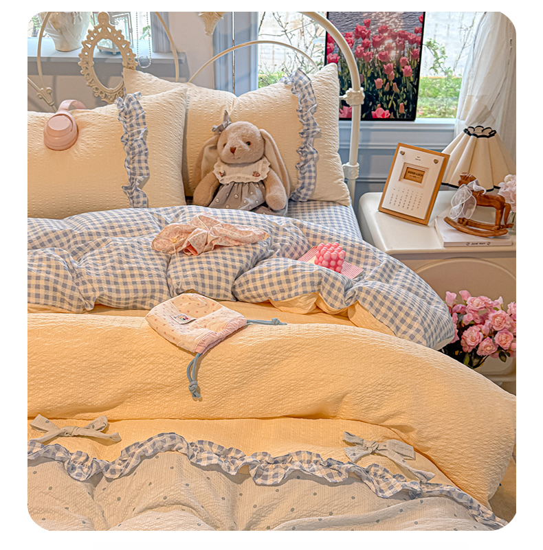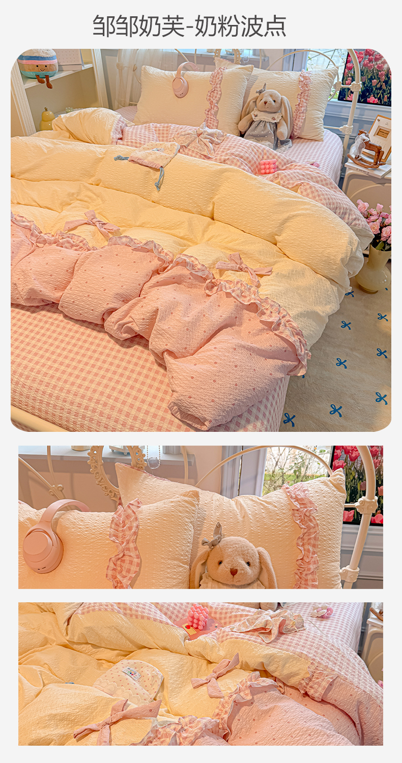 (总)子钦家纺 2026春夏新款提花泡芙棉甜系格子软乎乎的治愈床品花边蝴蝶结床单床笠四件套-邹邹奶芙