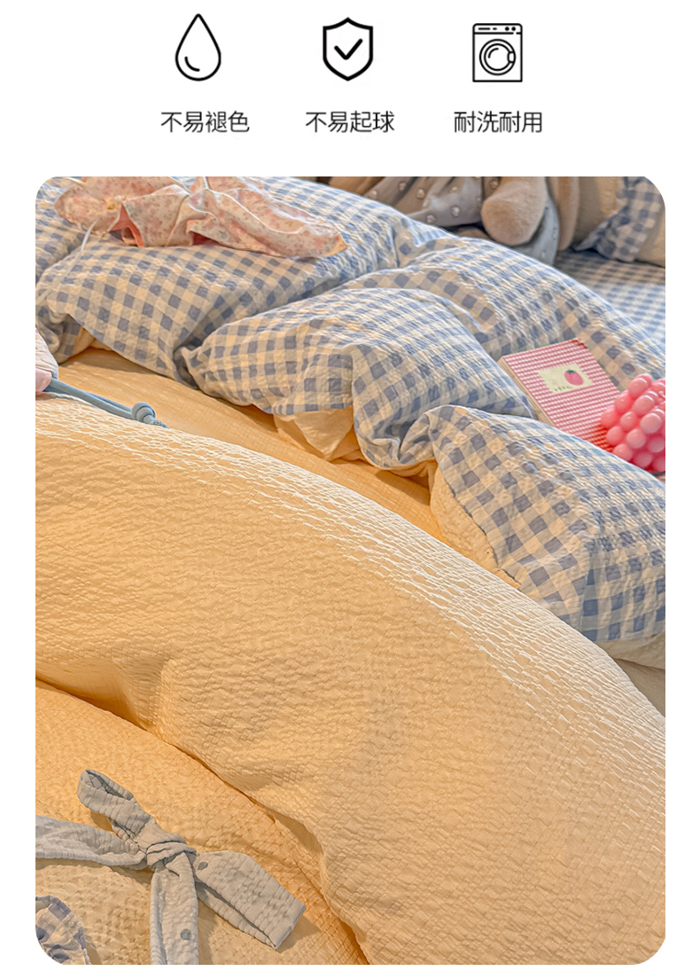 商品名称:(总)子钦家纺 2026春夏新款提花泡芙棉甜系格子软乎乎的治愈床品花边蝴蝶结床单床笠四件套-邹邹奶芙