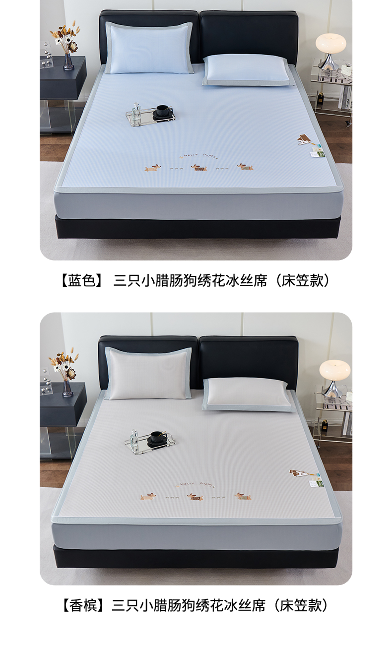 商品名称:小牛席业 2026新款腊肠狗绣花凉感冰丝席凉席席子-床笠款 腊肠狗-香槟