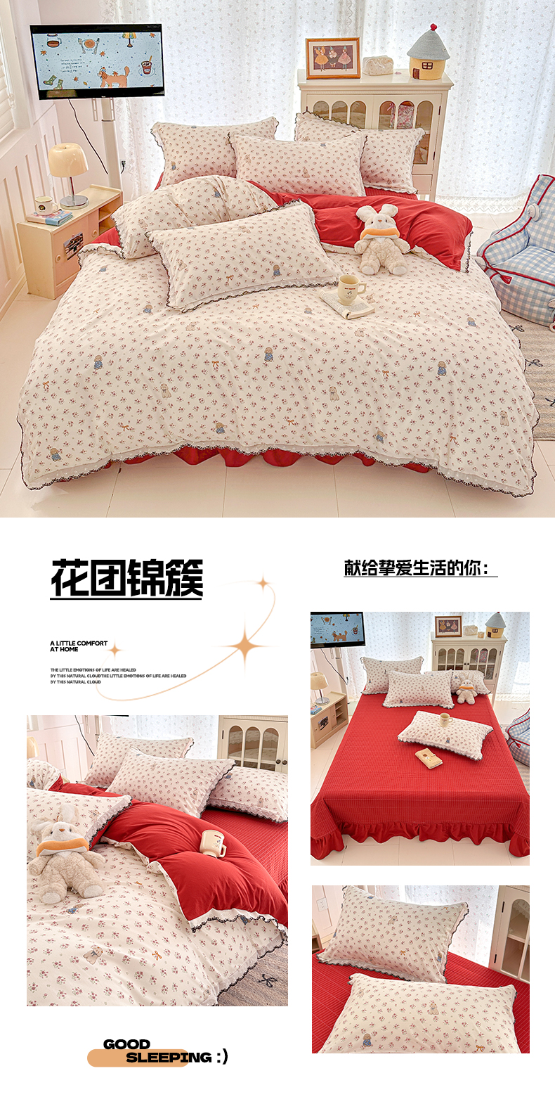 (总)莱米家纺 2026春夏新款亲肤花边全棉床盖四件套,春日小马,花团锦簇,花园小狗,苹果小熊,温柔蜜语-粉,温柔蜜语-蓝,小彩虹,紫韵