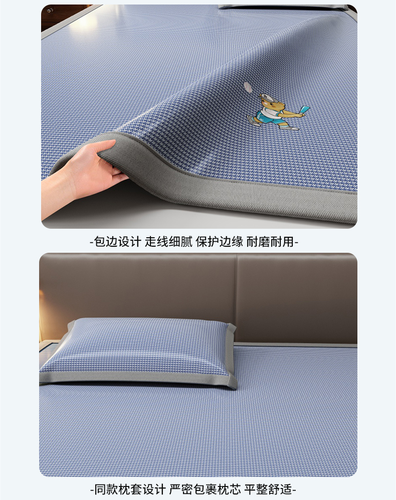 商品名称:人人爱家纺 2026新款提花冰丝凉席-棒球熊 棒球熊千鸟格蓝色