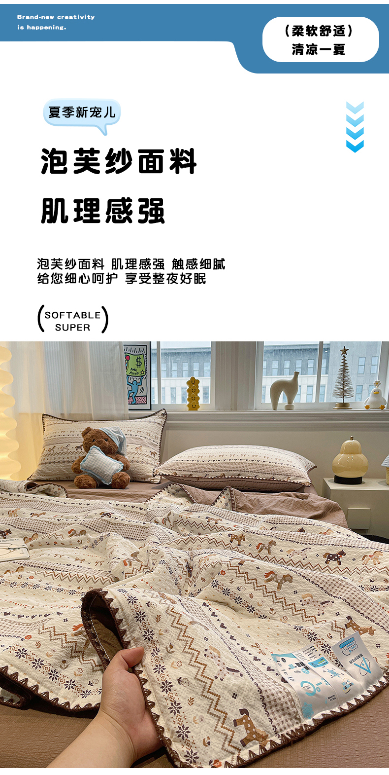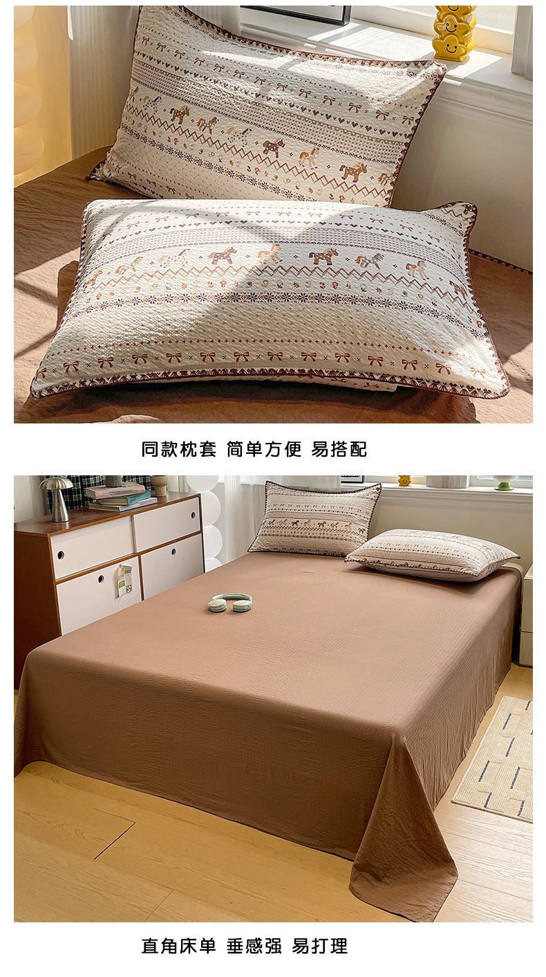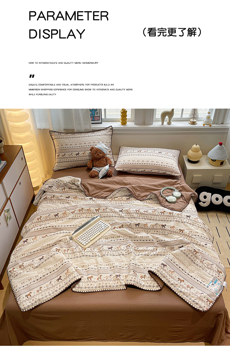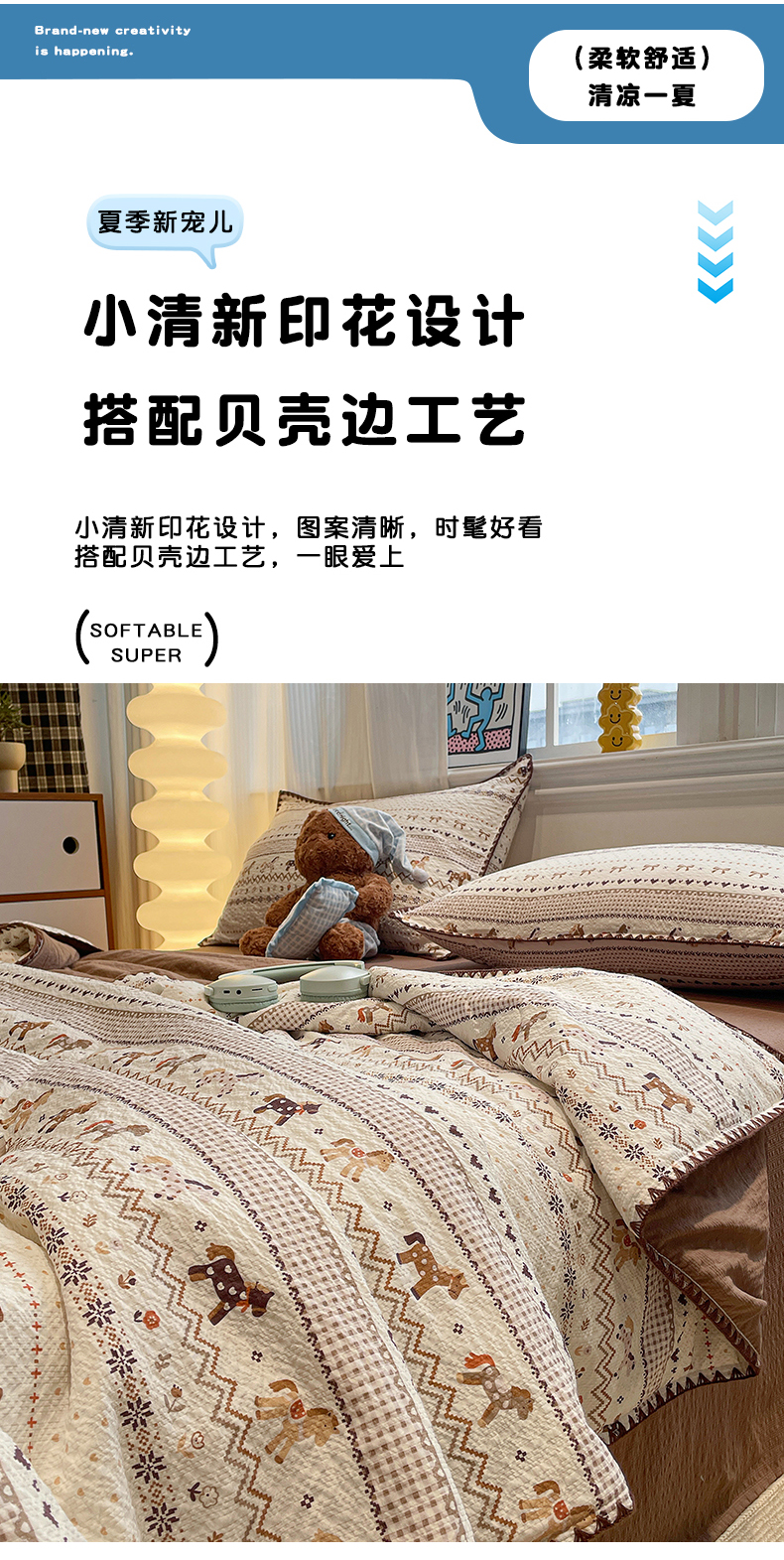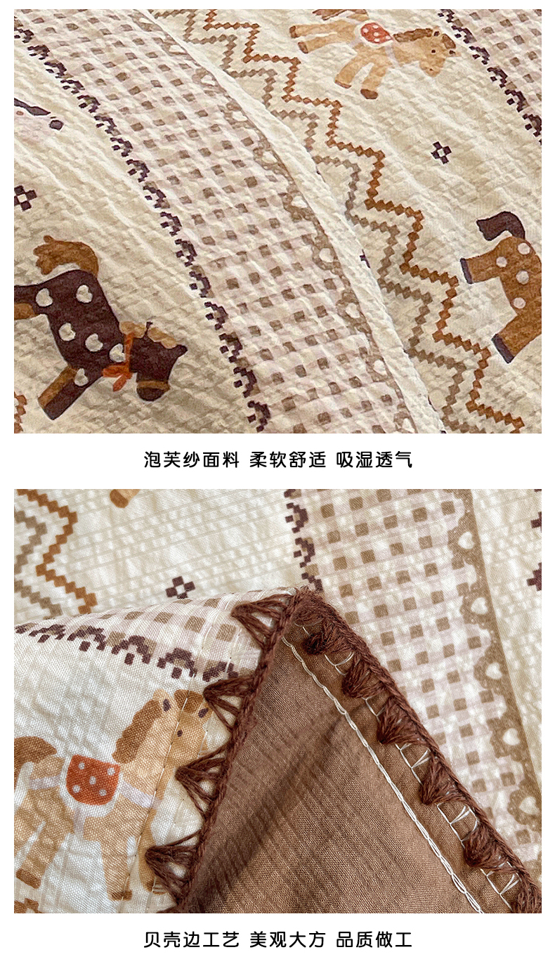 当前位置: 91家纺网 > 商品网购 > 床品套件 > 四件套 > 夏被四件套 > 奈颜 2026新款费尔岛云柔泡芙纱A类贝壳边夏被四件套-提供买家秀 栗色小马