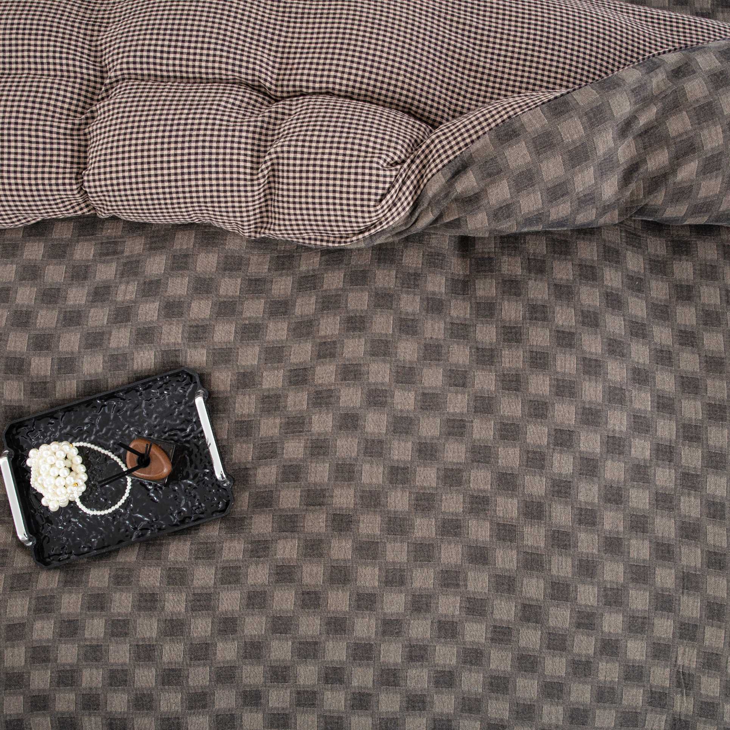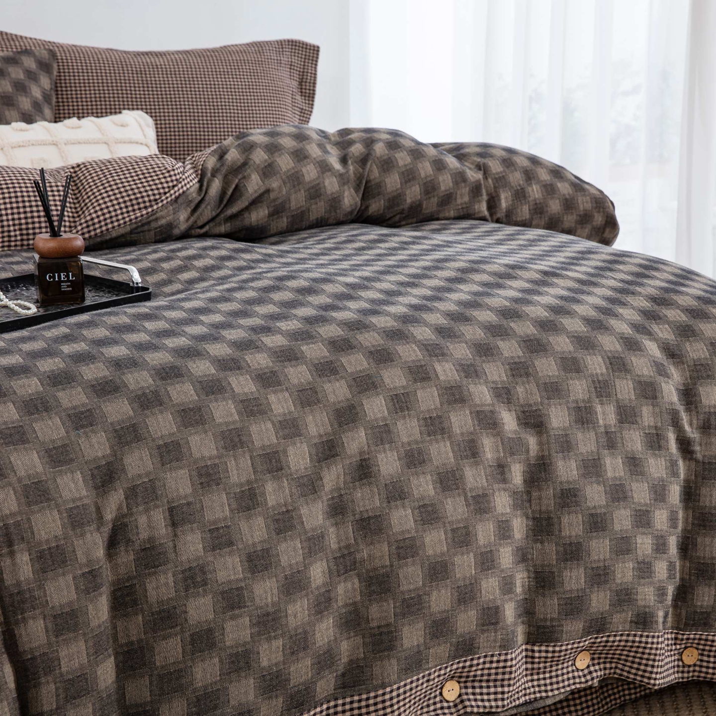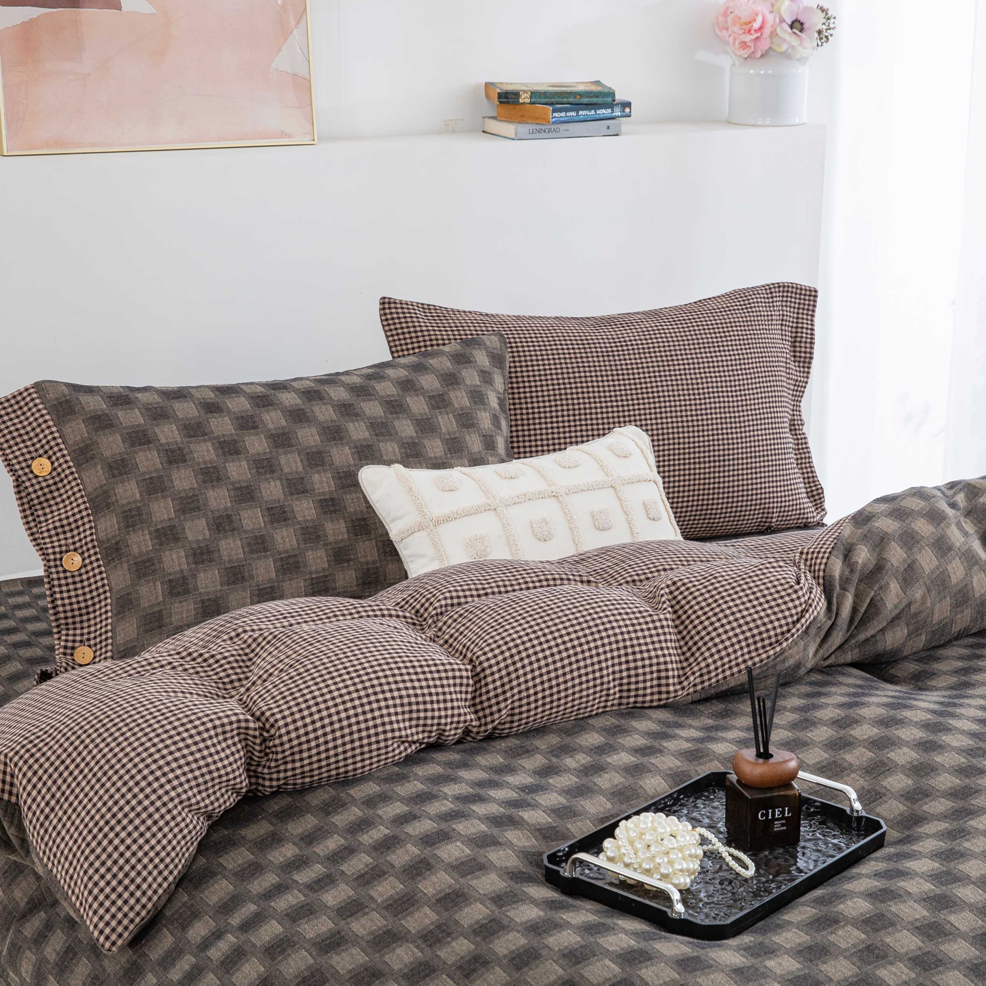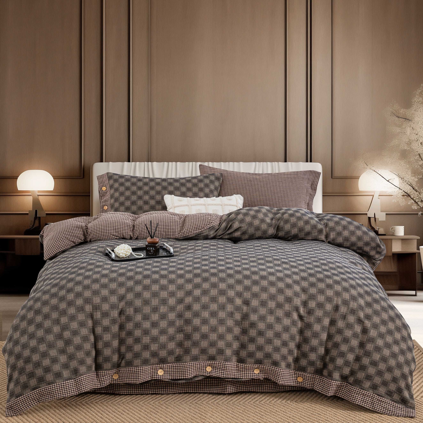 (总)仰望棉麻双层纱供应链 2026新款爱情马全棉色织提花双层纱纽扣款四件套,爱情马-棕