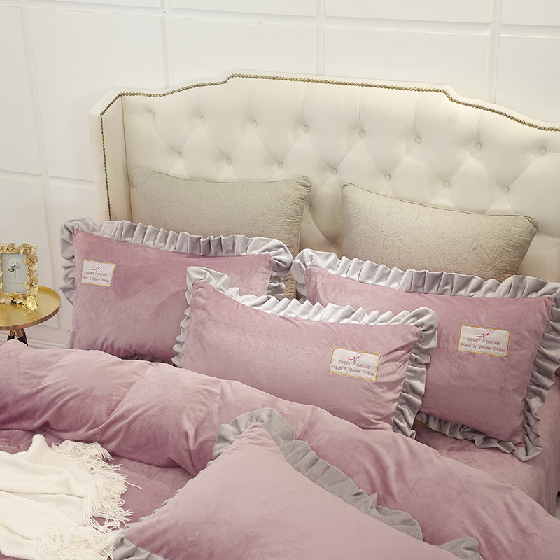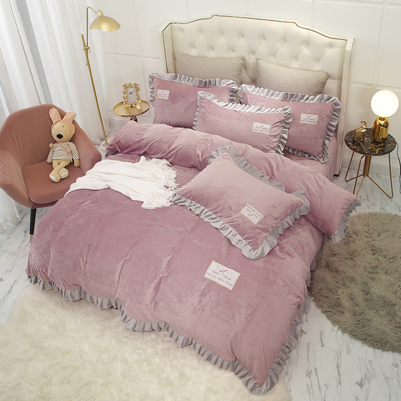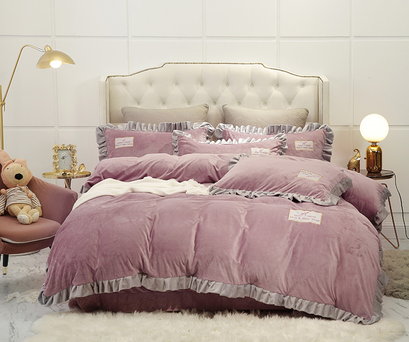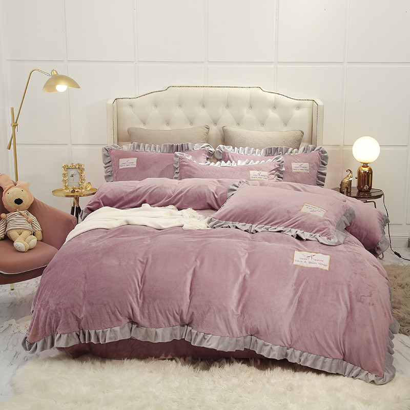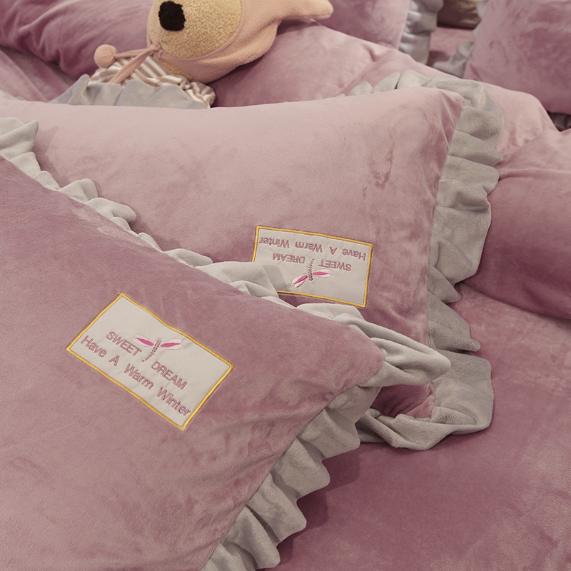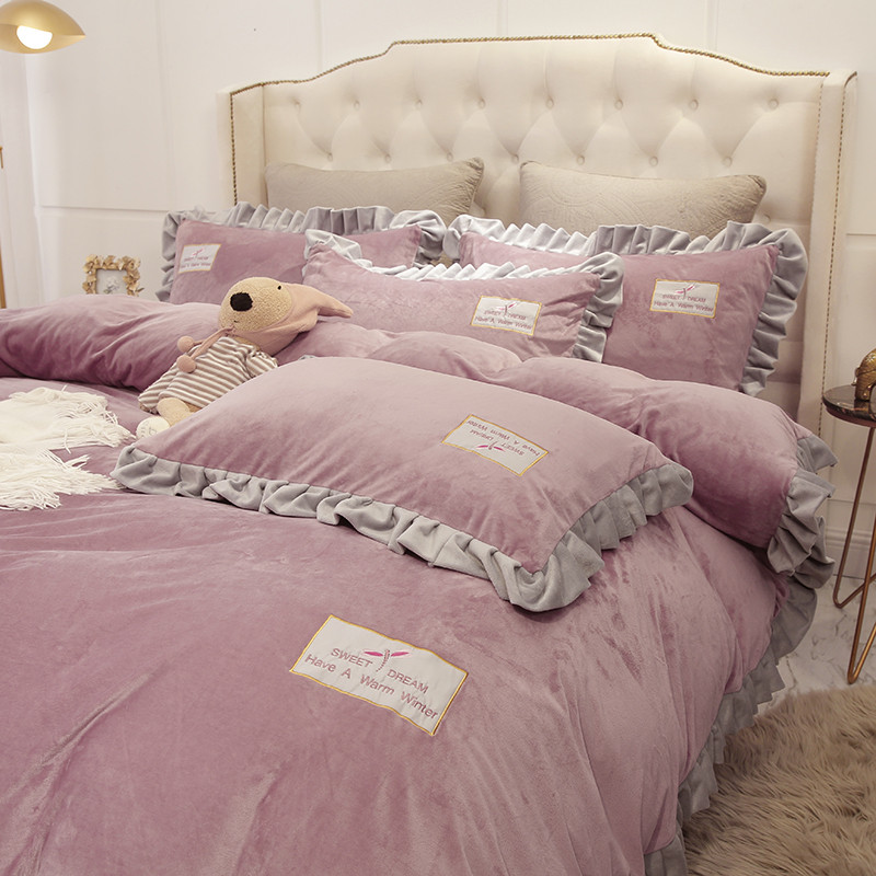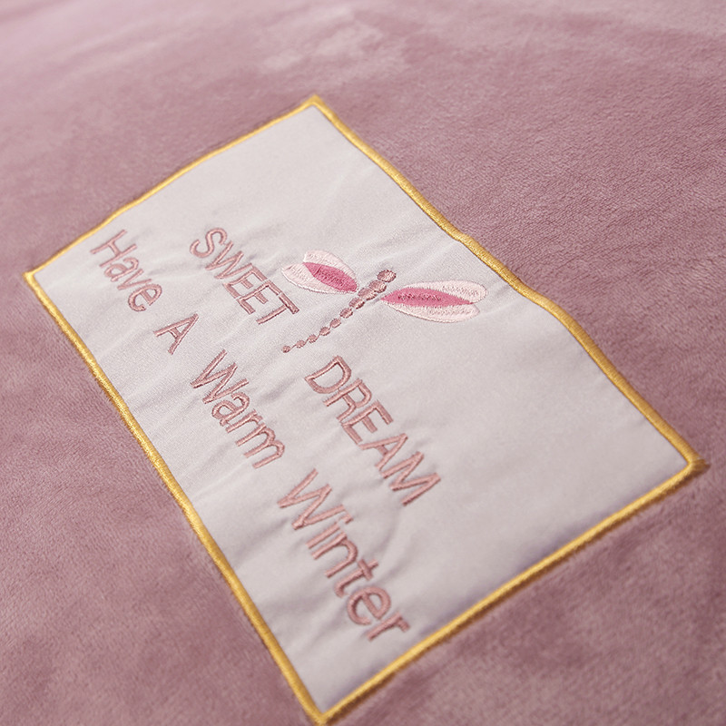 米奈 水晶绒贴布绣花四件套米可系列 紫粉