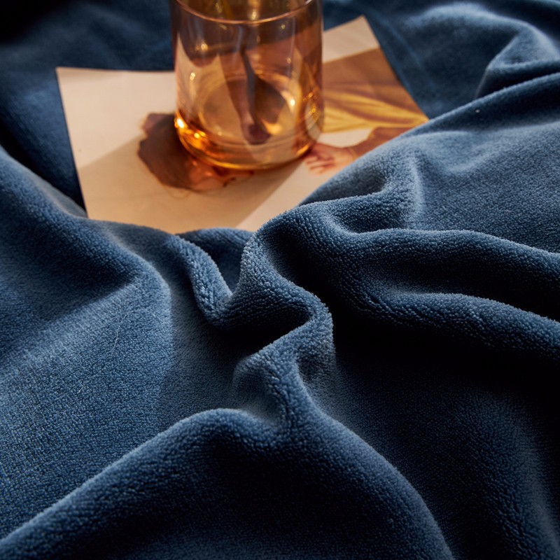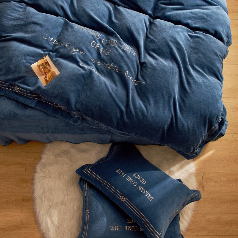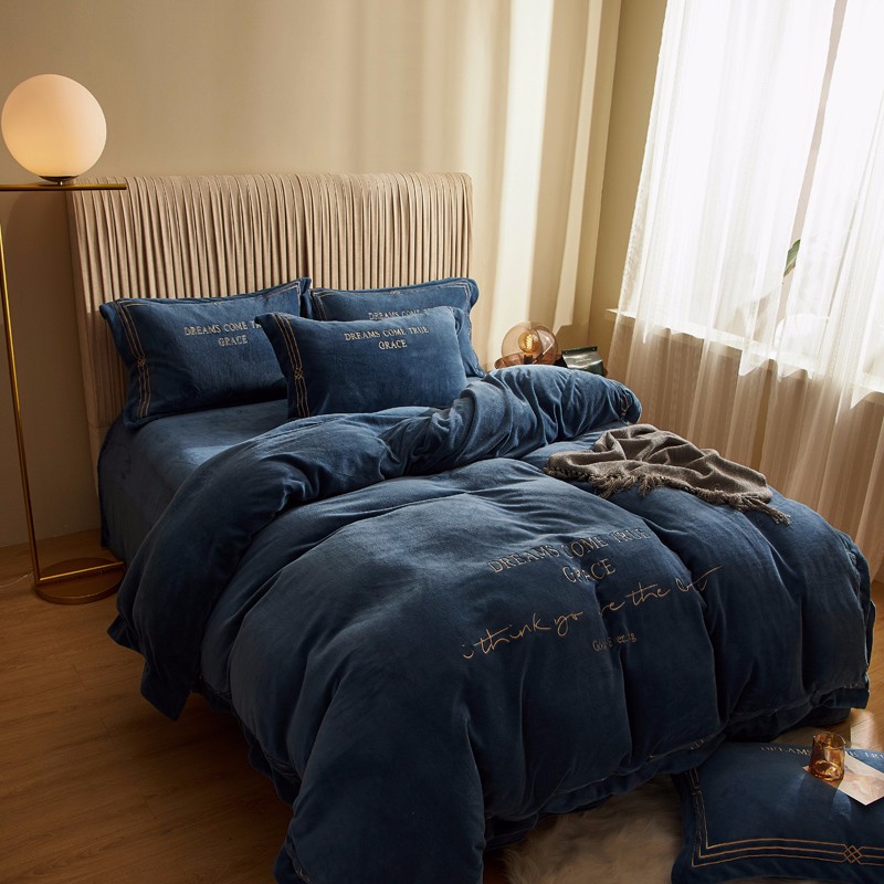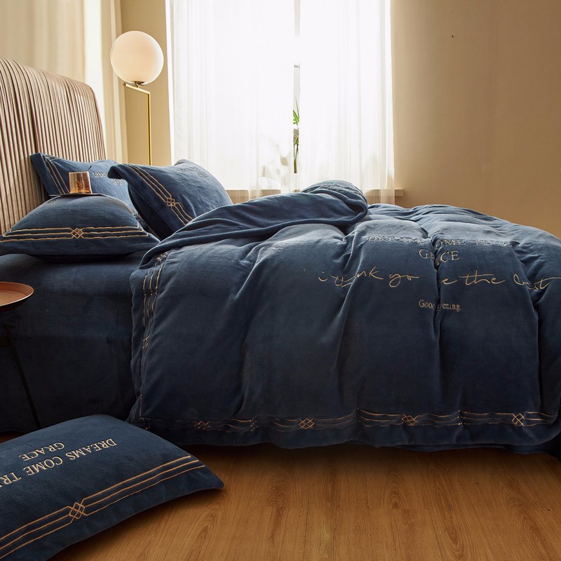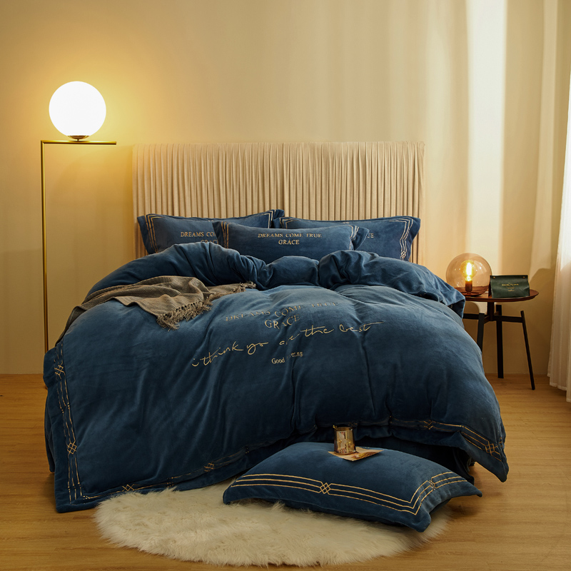 商品名称:米奈 2020新款水晶绒法莱绒牛奶绒绣边罗伊系列四件套 轻奢蓝