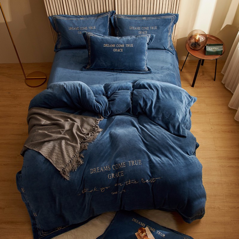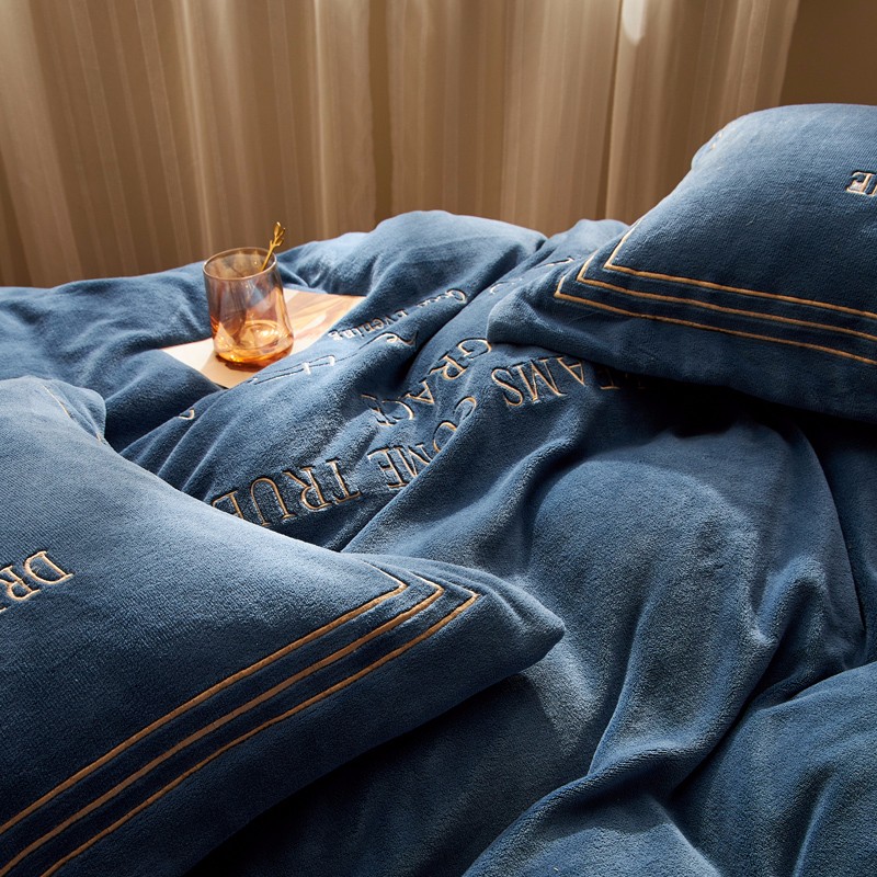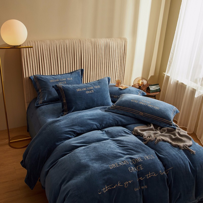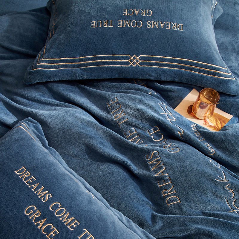 米奈 2020新款水晶绒法莱绒牛奶绒绣边罗伊系列四件套 轻奢蓝