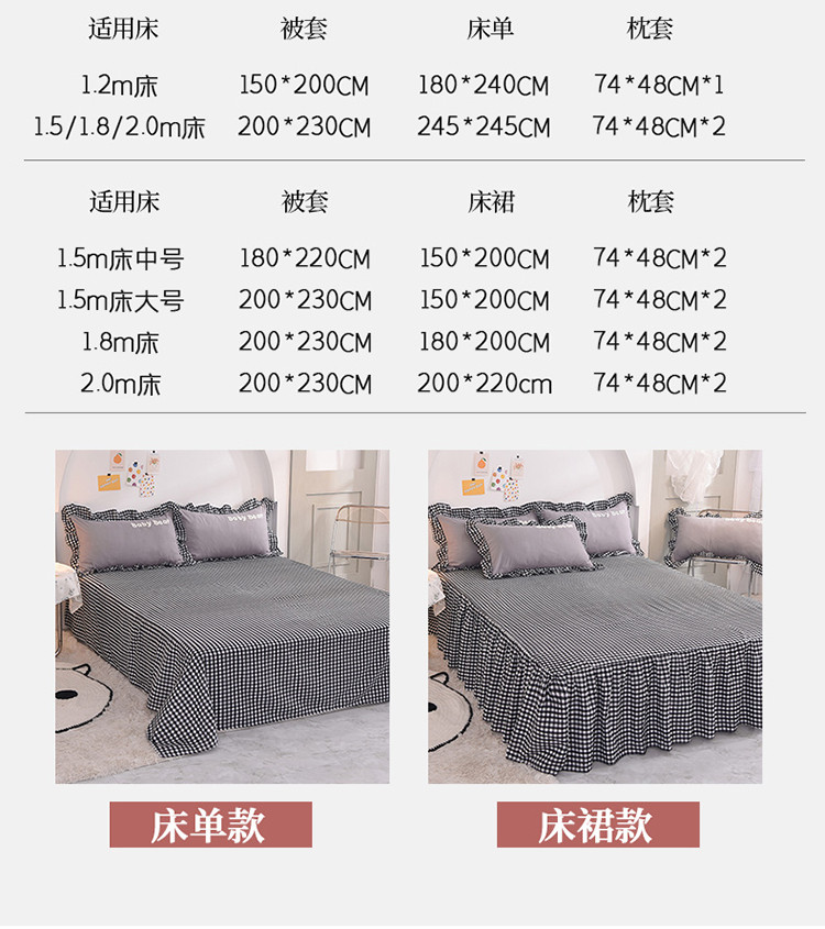1.5m床裙款四件套(被套150x200cm床裙150x200cm枕套48*74cm*2) | ¥80.00 |