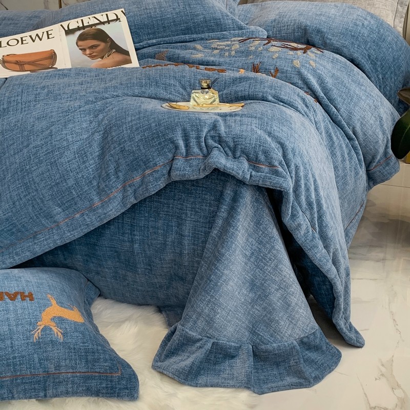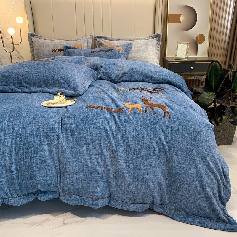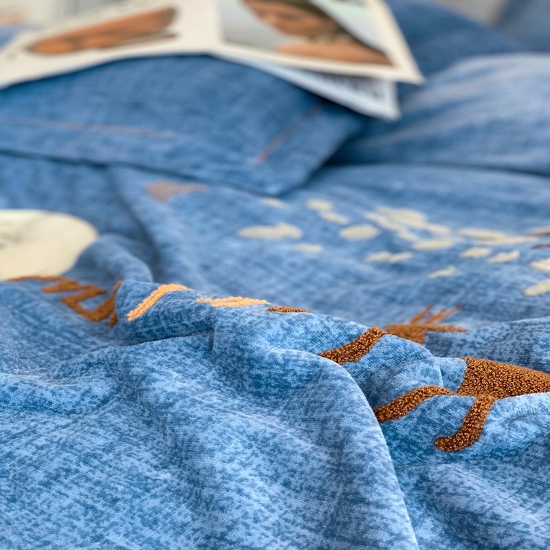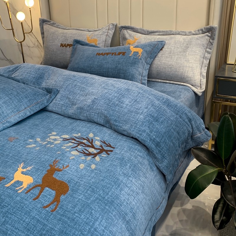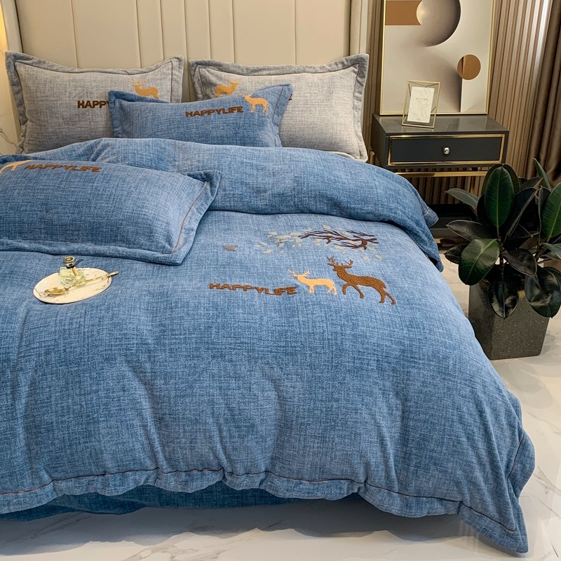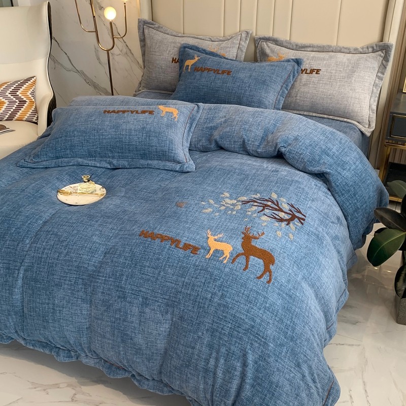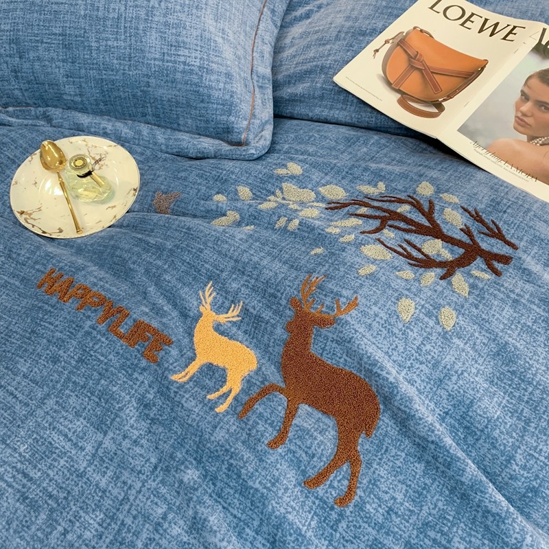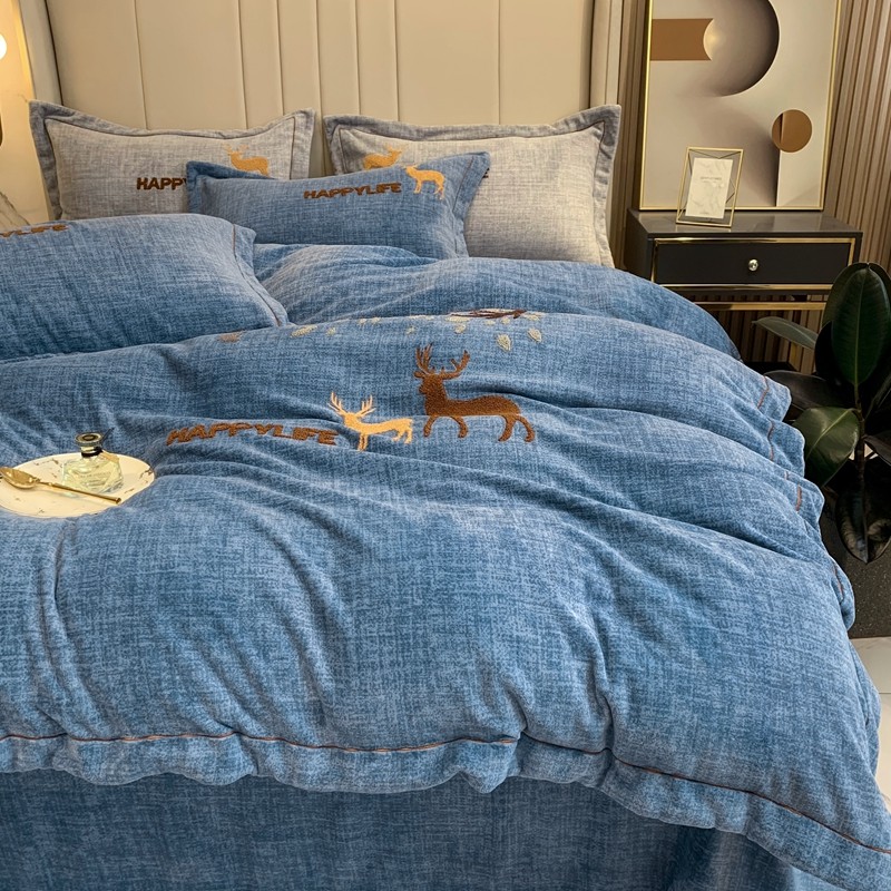 榻尚2021新款高克重婴肤绒牛奶绒毛巾绣高端四件套 蓝色小鹿