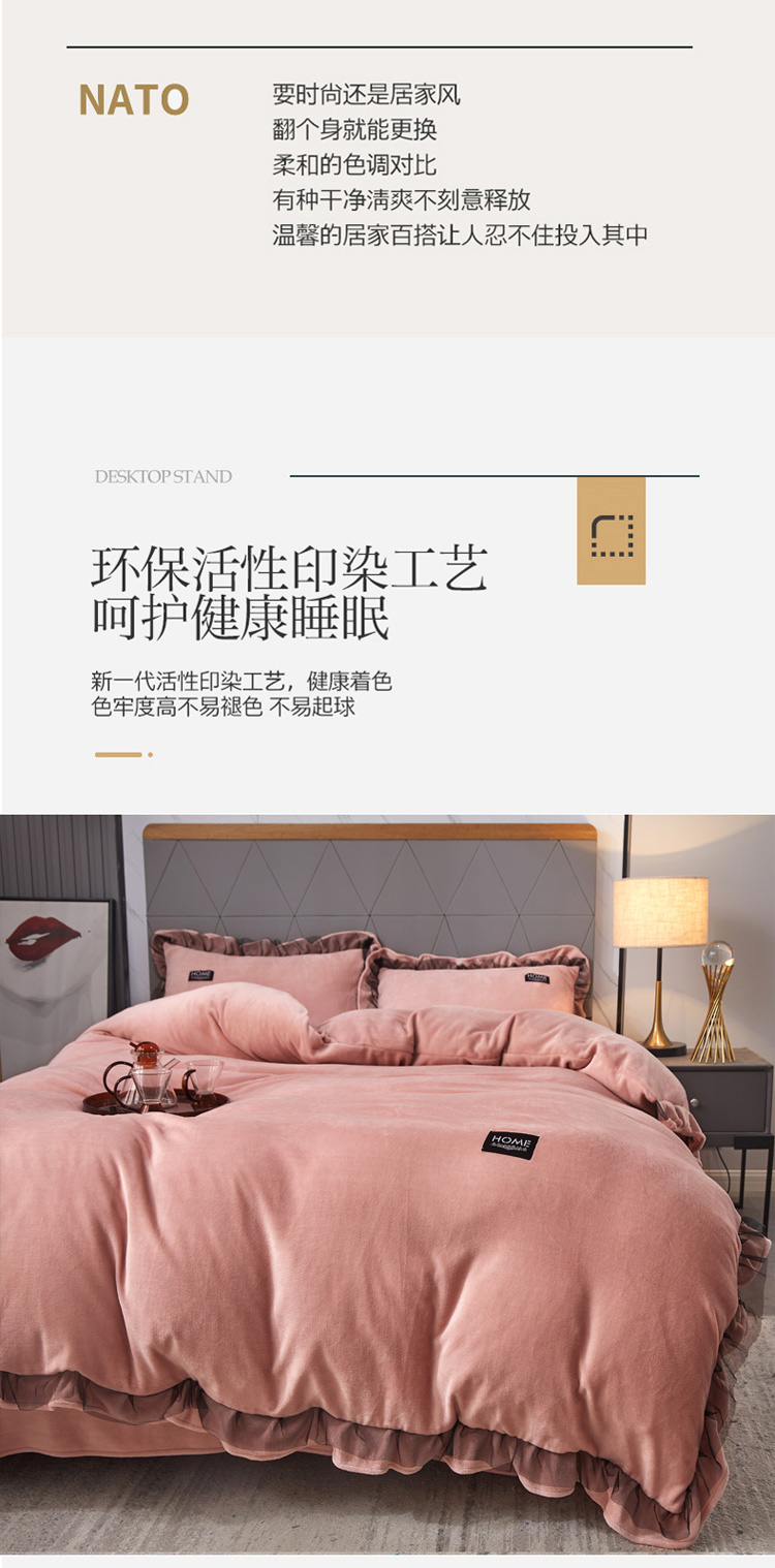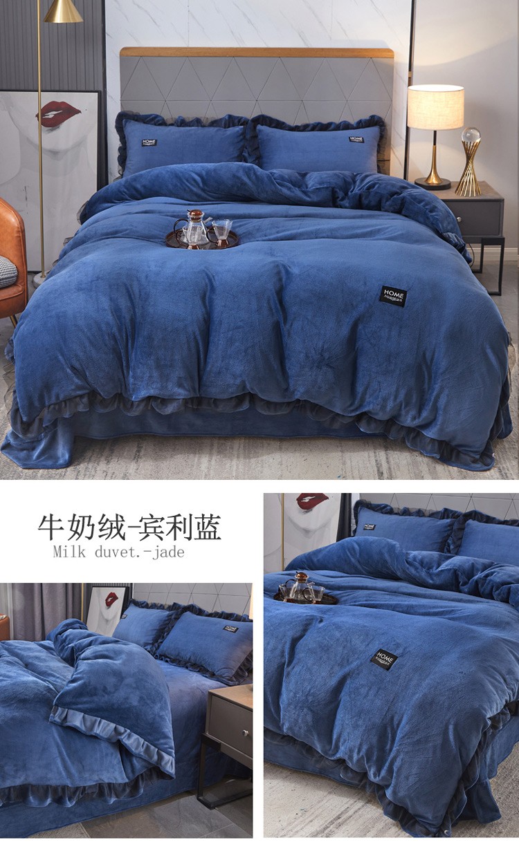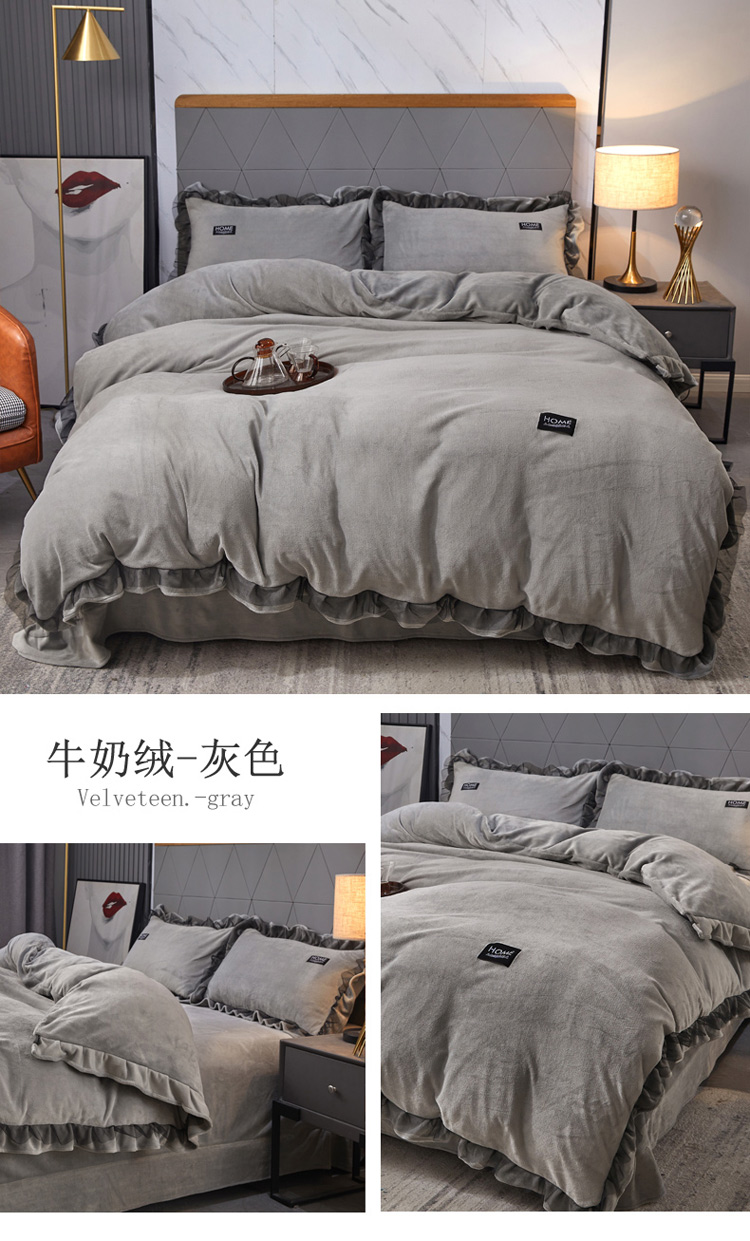 2023牛奶绒保暖四件套韩版蕾丝花边,紫色,松花绿,灰色,豆沙,宾利蓝