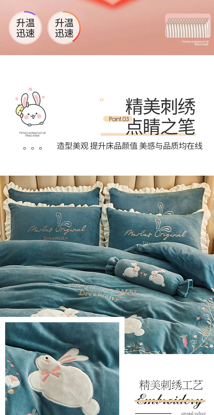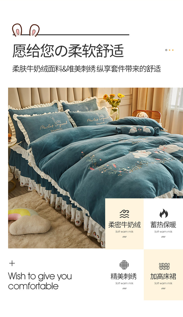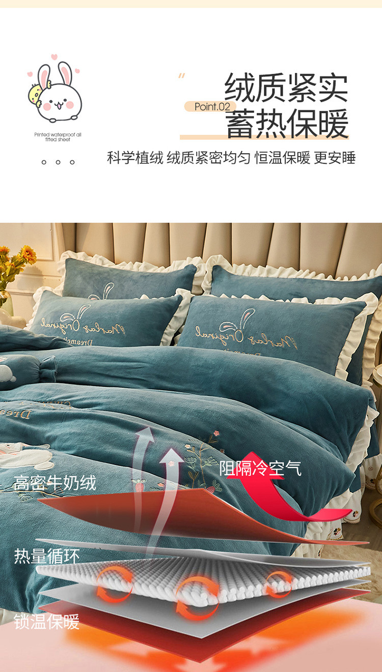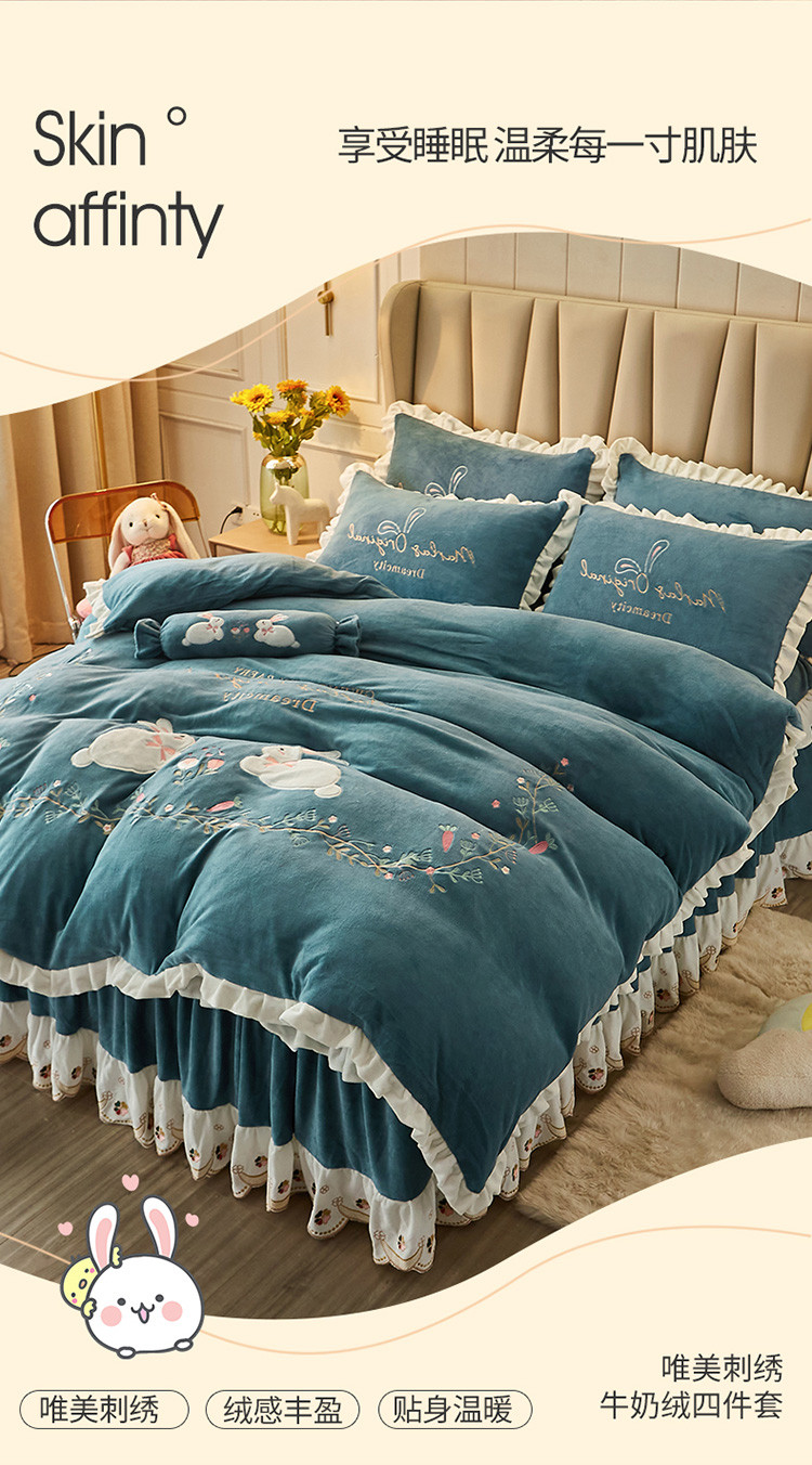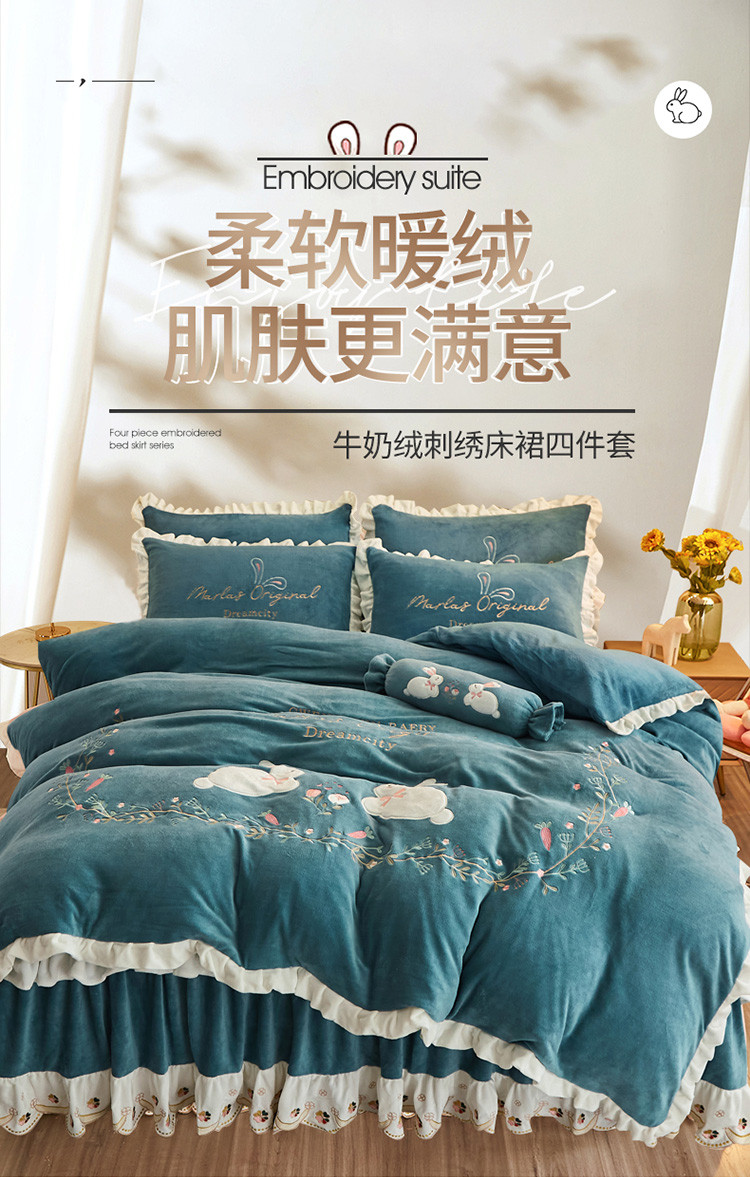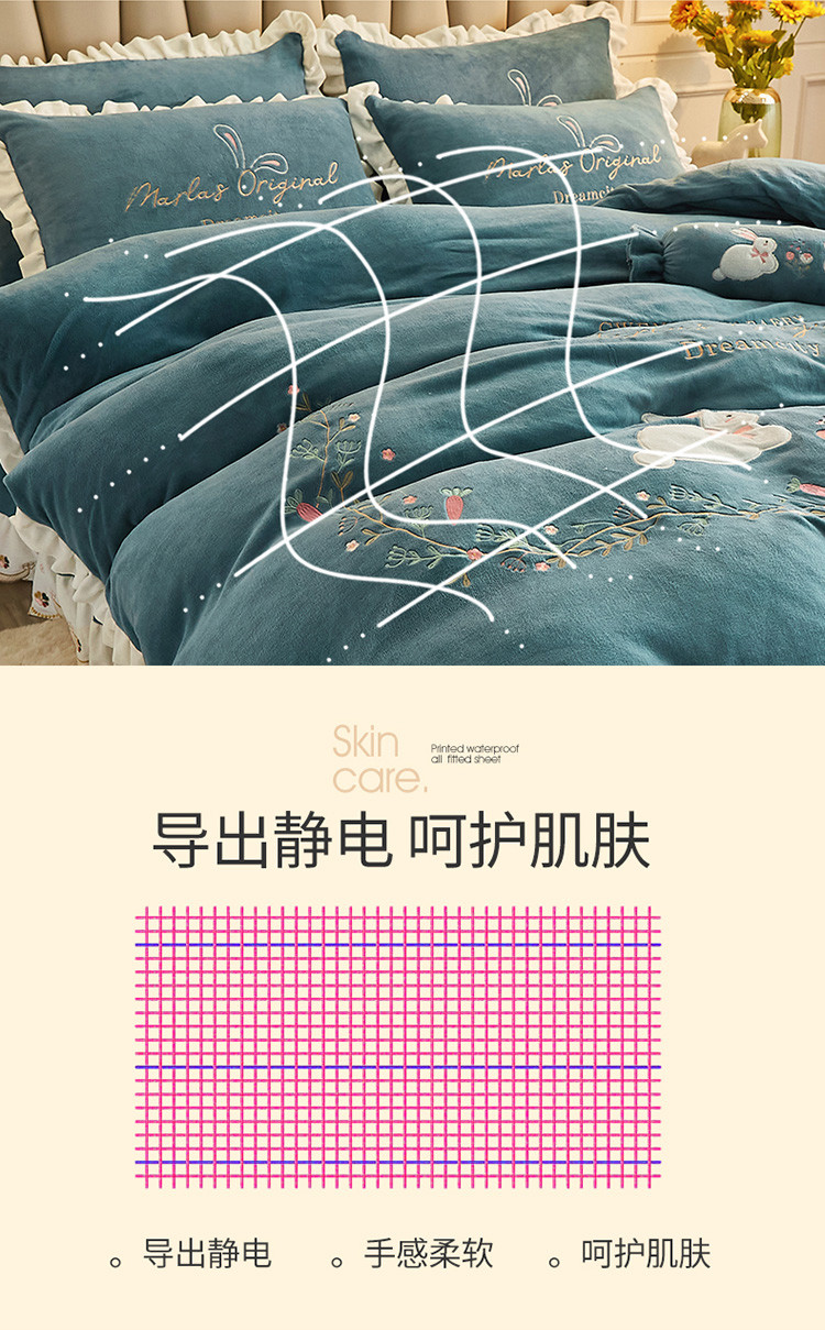 宜凡 2021新款牛奶绒绣花兔床裙四件套 萌萌兔-水绿