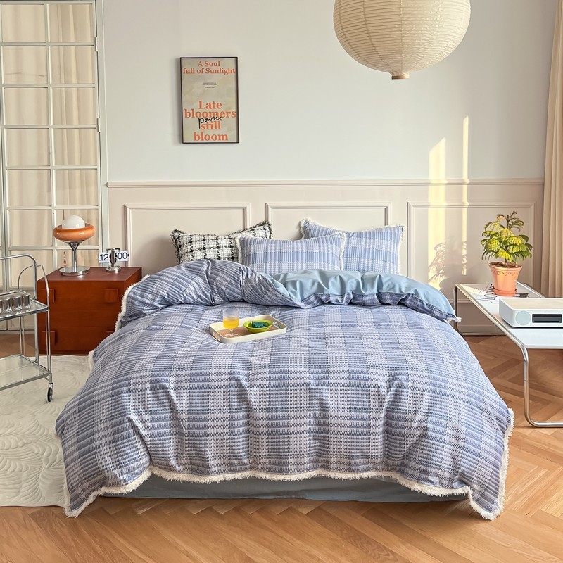 (总)昔可 2023新款全棉ins格子混搭系列四件套,ins简约绿格,粉蓝格,开心果格,学院格纹,粉绿格,海盐兰格,黄绿格,夏日蓝条,芝士黄条,紫芋泥芝士格