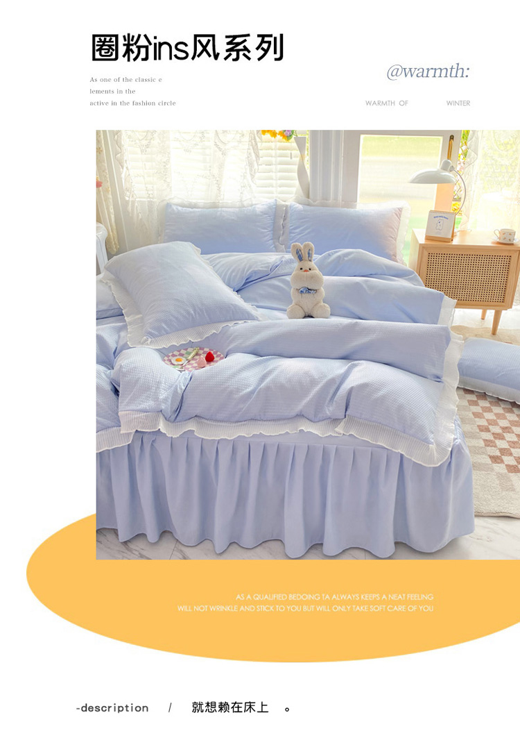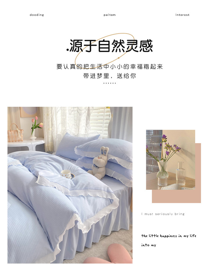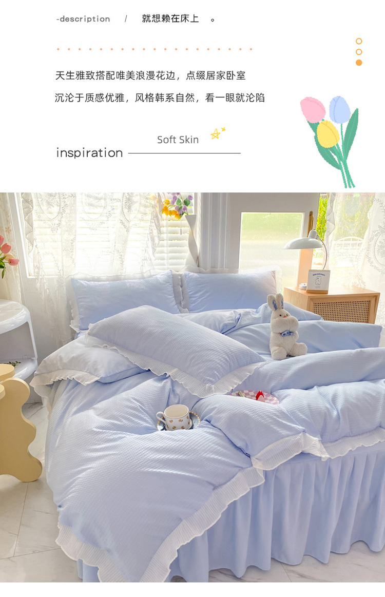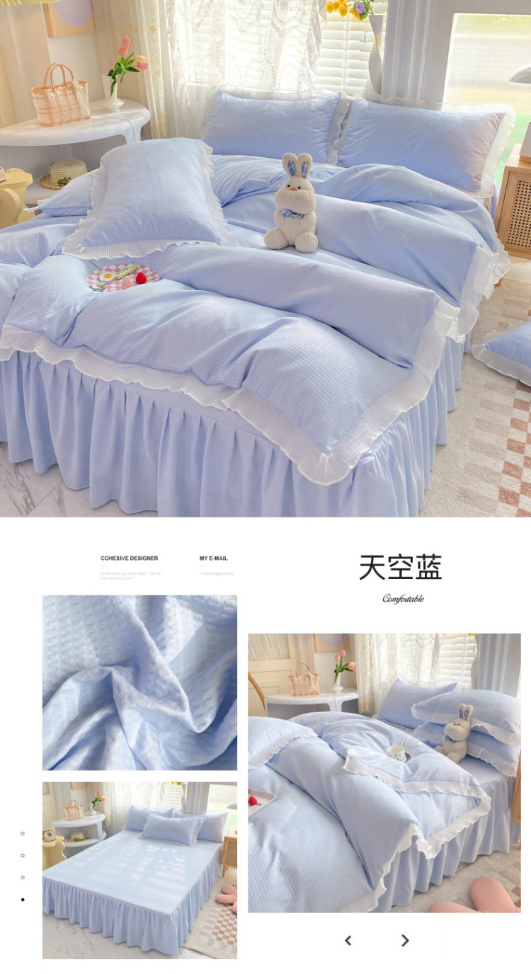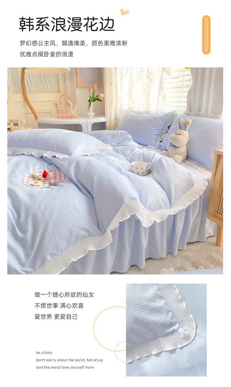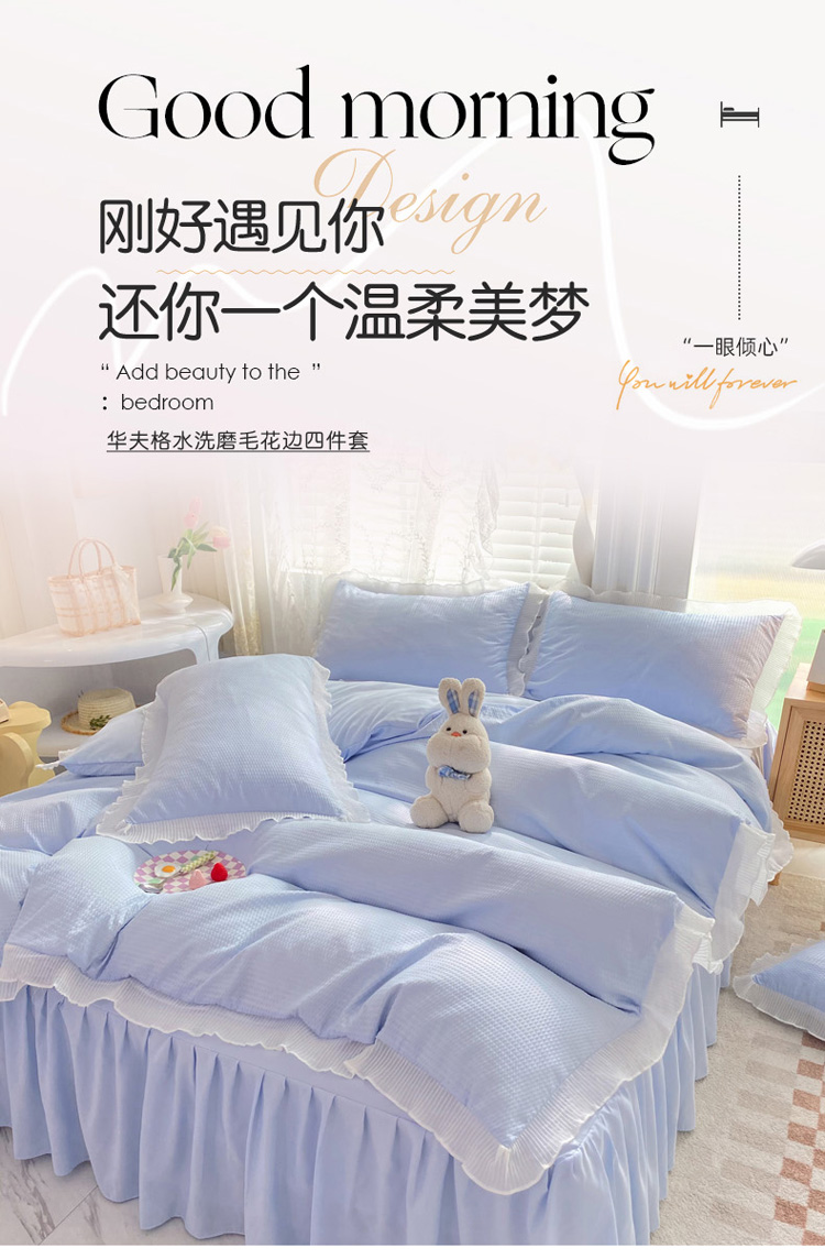 当前位置: 91家纺网 > 商品网购 > 床品套件 > 四件套 > 普通磨毛四件套 > 慕澄家纺 2022新款华夫格雪纺花边四件套 天空蓝