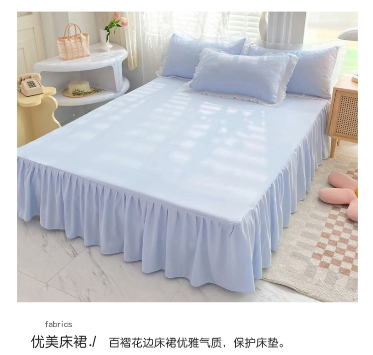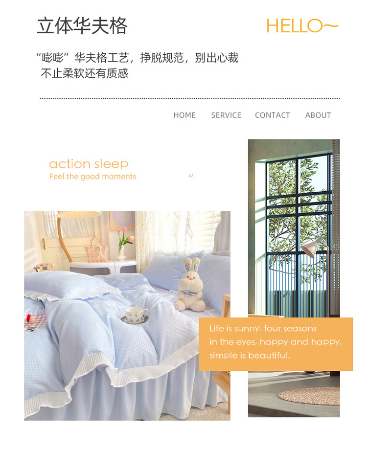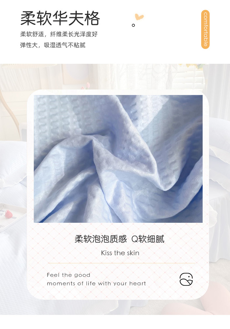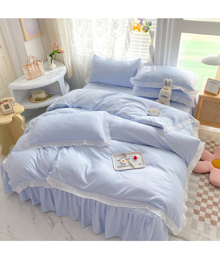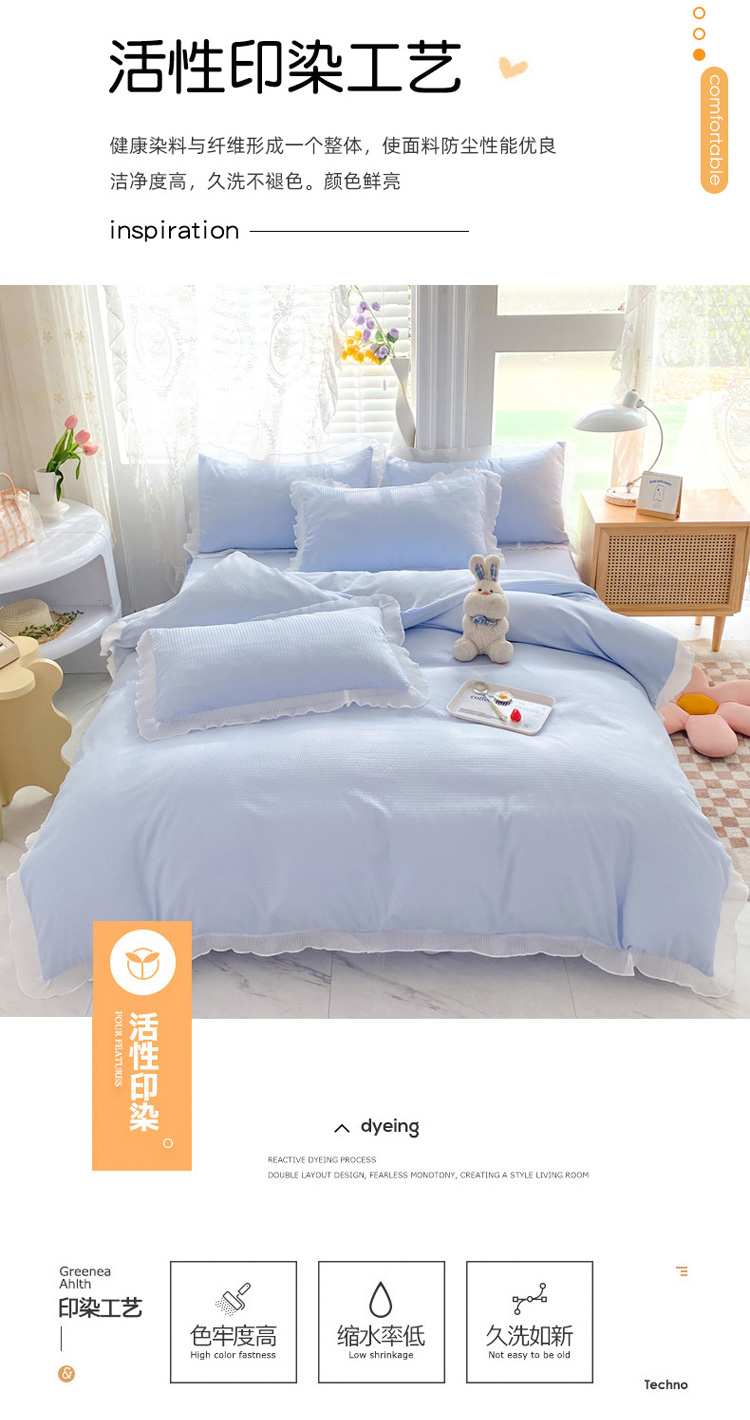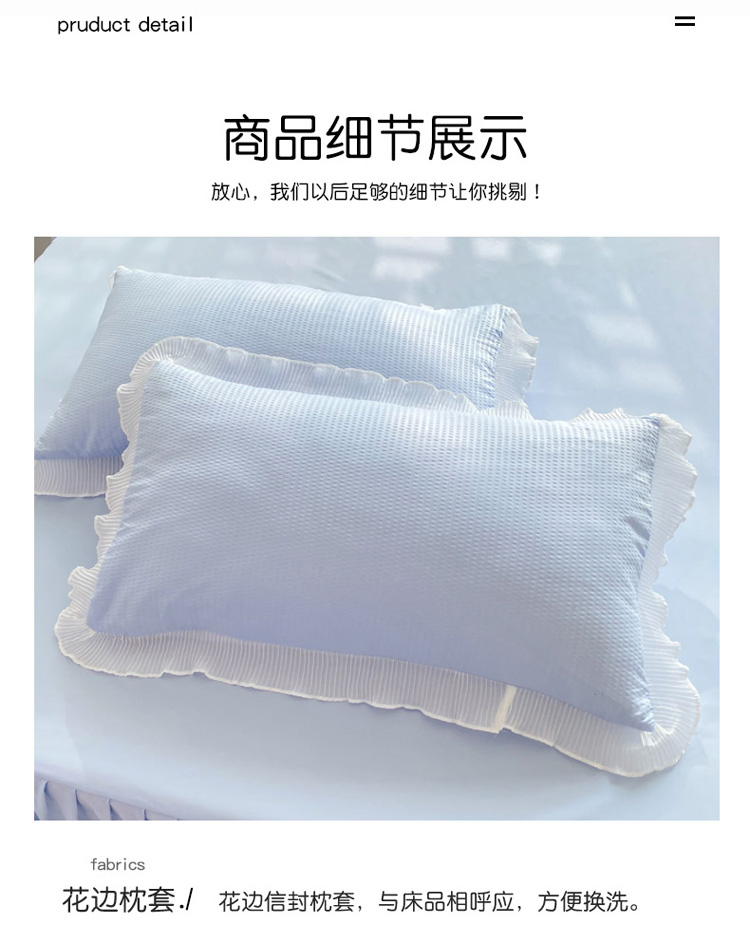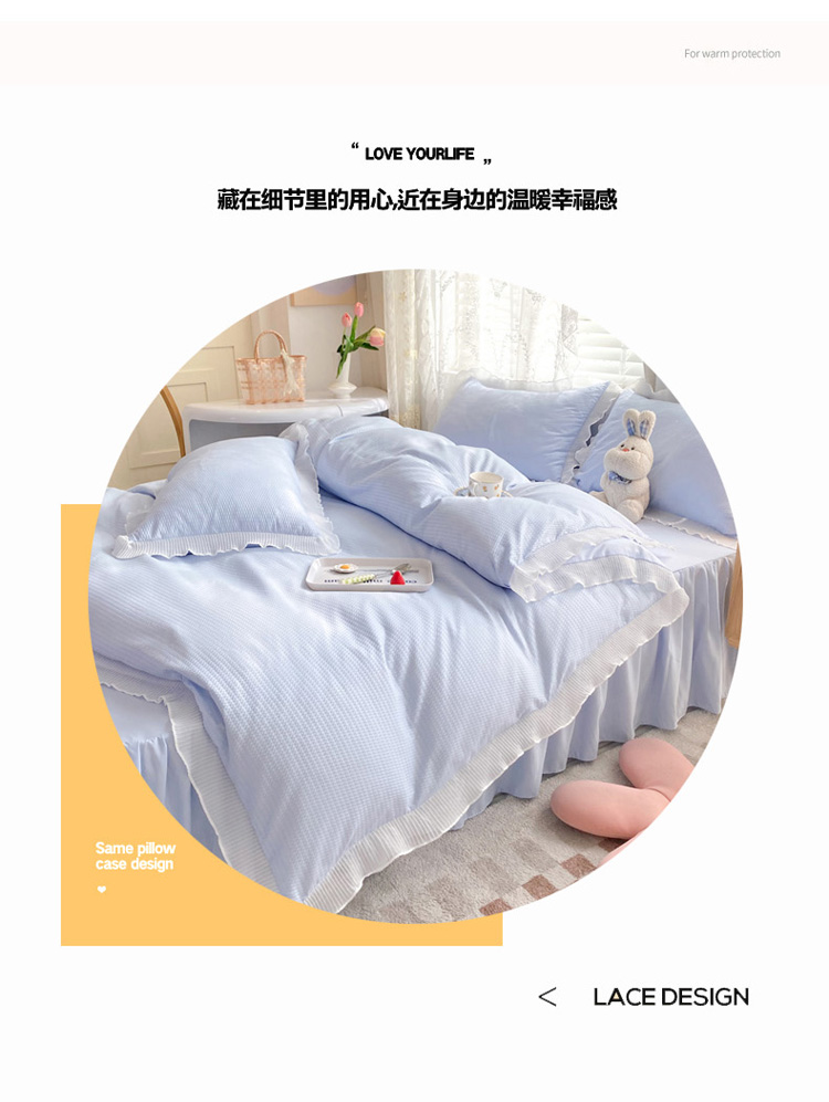当前位置: 91家纺网 > 商品网购 > 床品套件 > 四件套 > 普通磨毛四件套 > 慕澄家纺 2022新款华夫格雪纺花边四件套 天空蓝