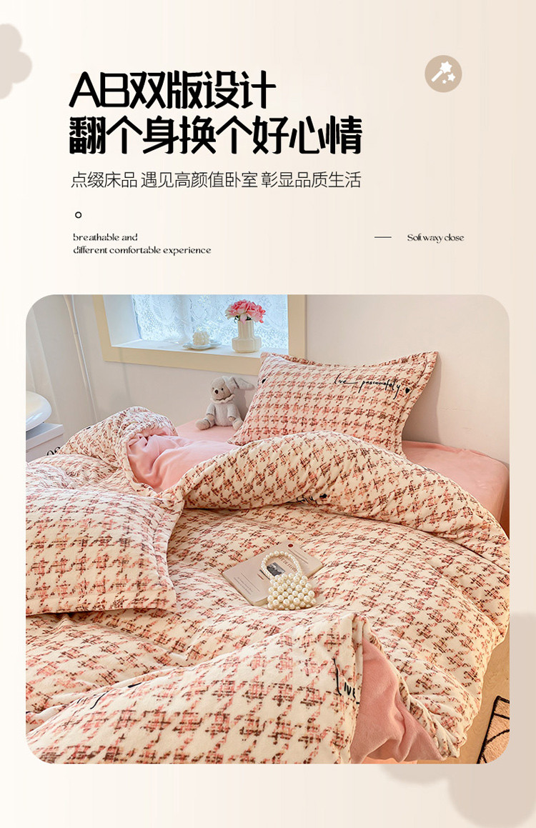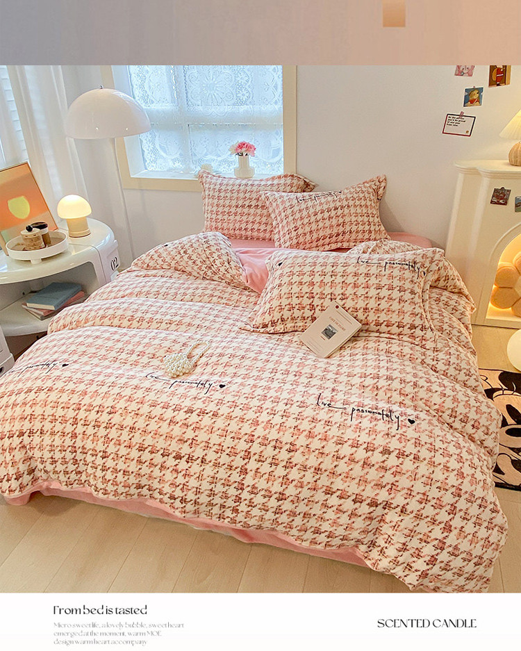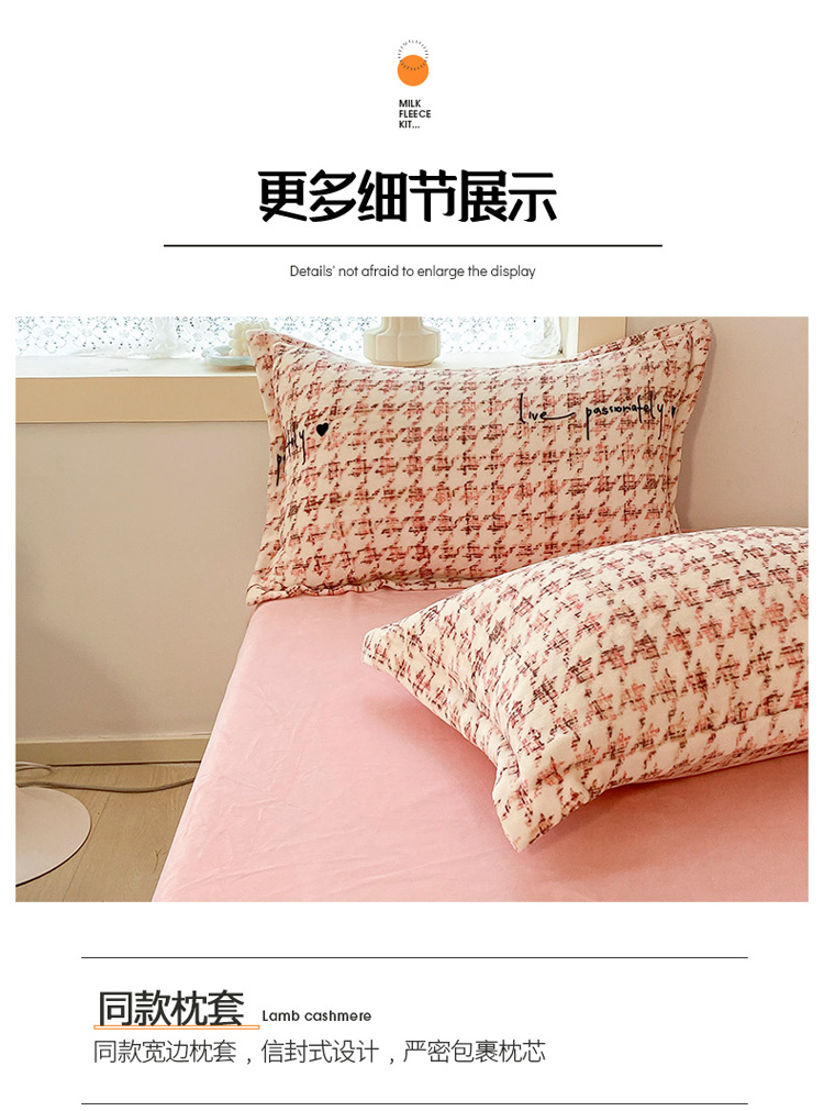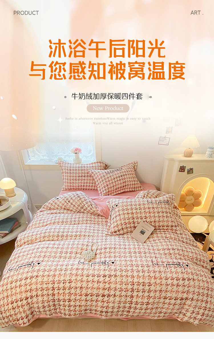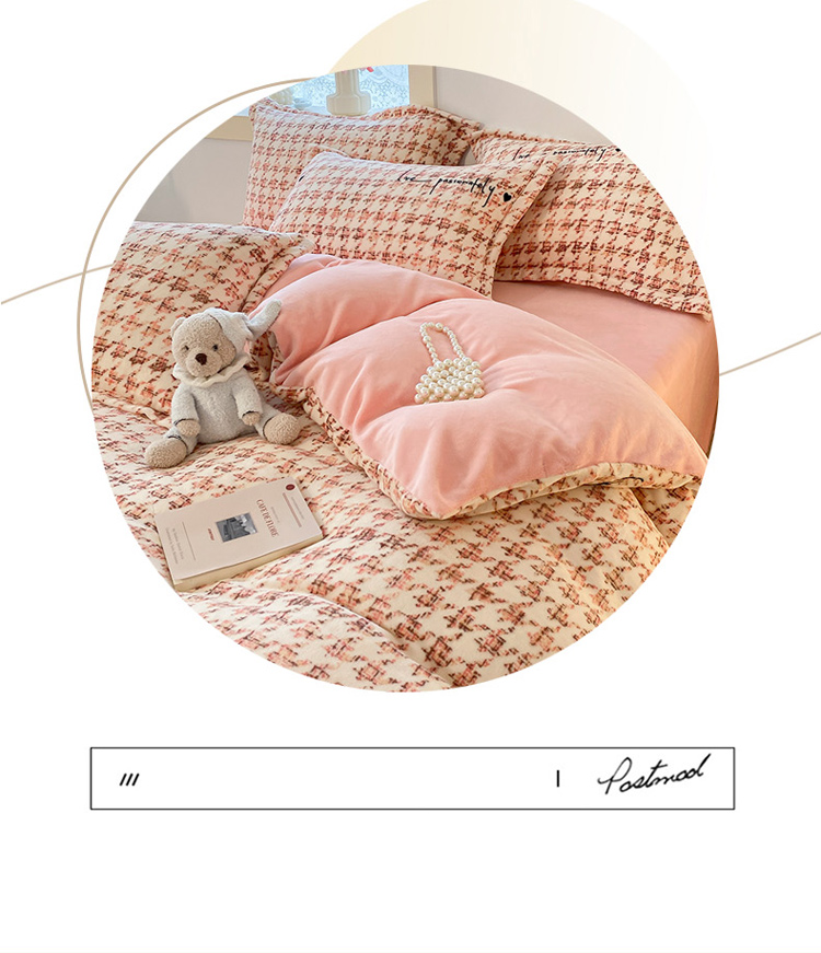 沐慕 2022新款牛奶绒四件套 千鸟格粉