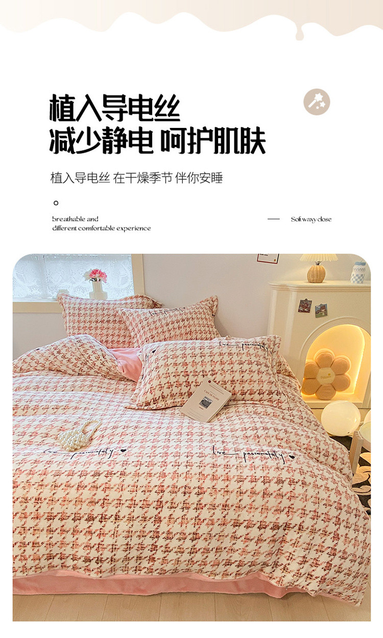 商品名称:沐慕 2022新款牛奶绒四件套 千鸟格粉