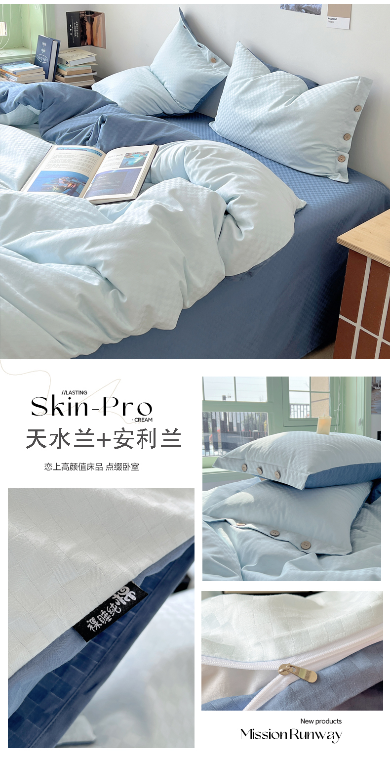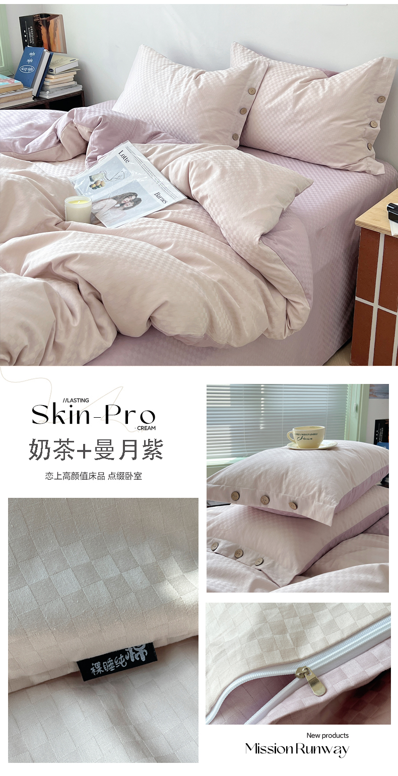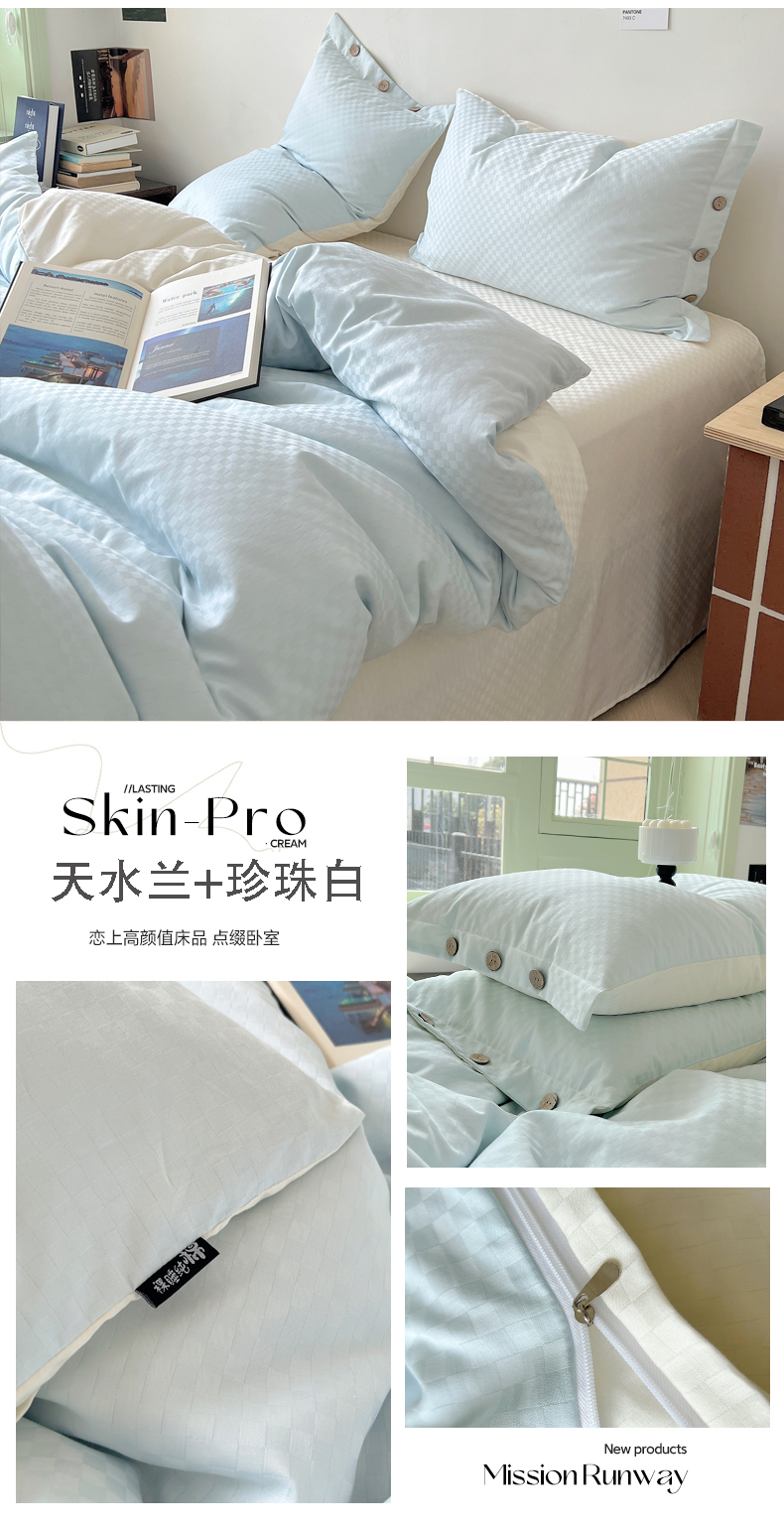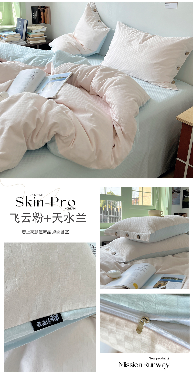 (总)三朵家纺 2026新款ins风全棉纯色双拼水洗棉四件套极简风系列,风青月白,焦糖曲奇,蓝韵雾纱,流光奶绿,抹茶奶黄,浅蓝芝士,香芋奶昔,烟墨灰,云纱可可
