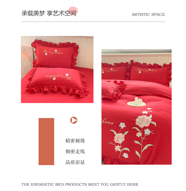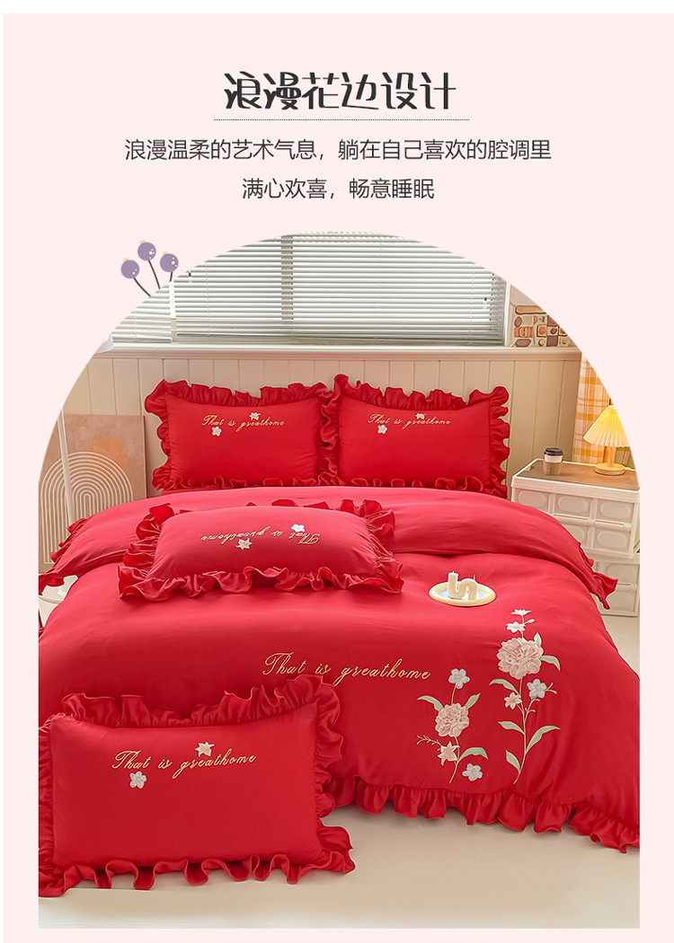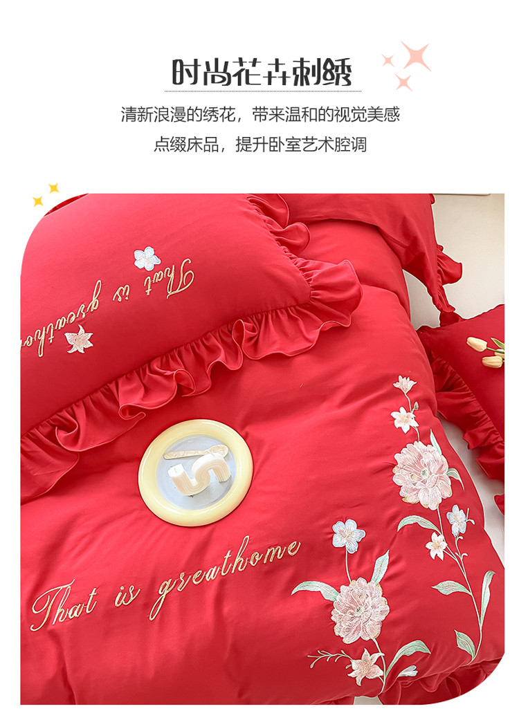 商品名称:富盛 2024新款水洗亲肤棉刺绣四件套公主风四件套-春暖花开 大红