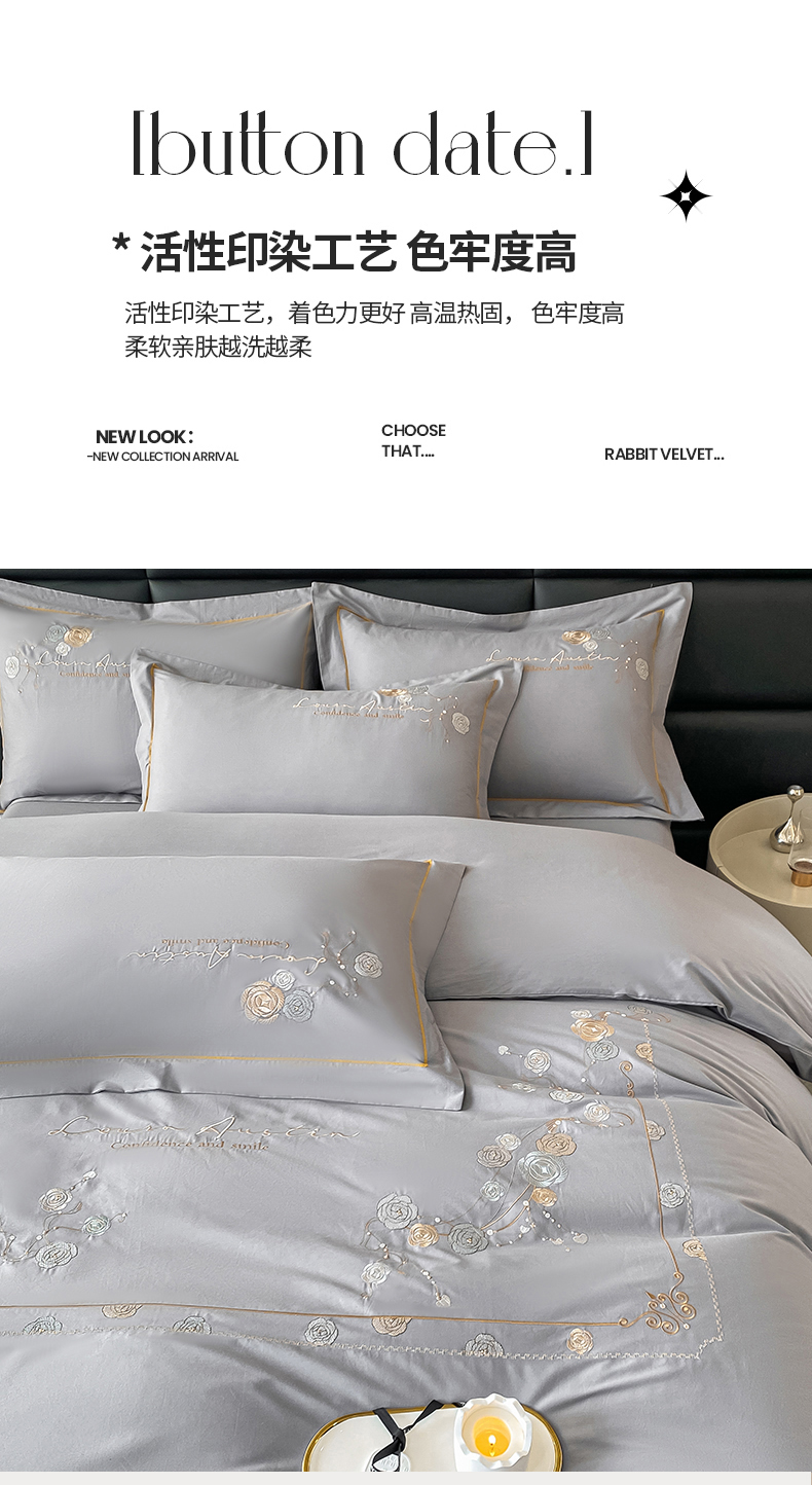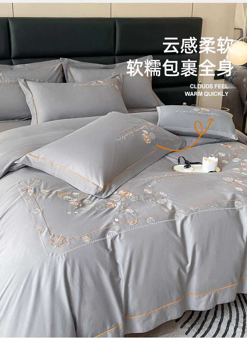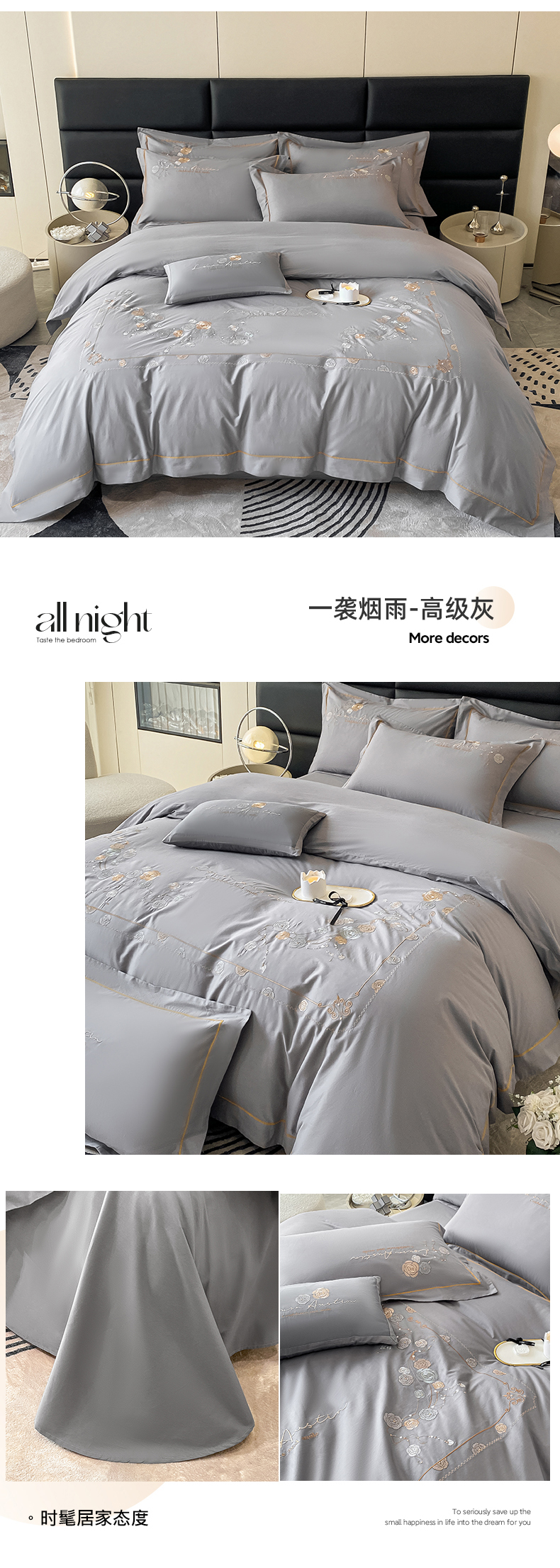 商品名称:绒世界2024新款全棉刺绣烟雨系列四件套 一袭烟雨-高级灰