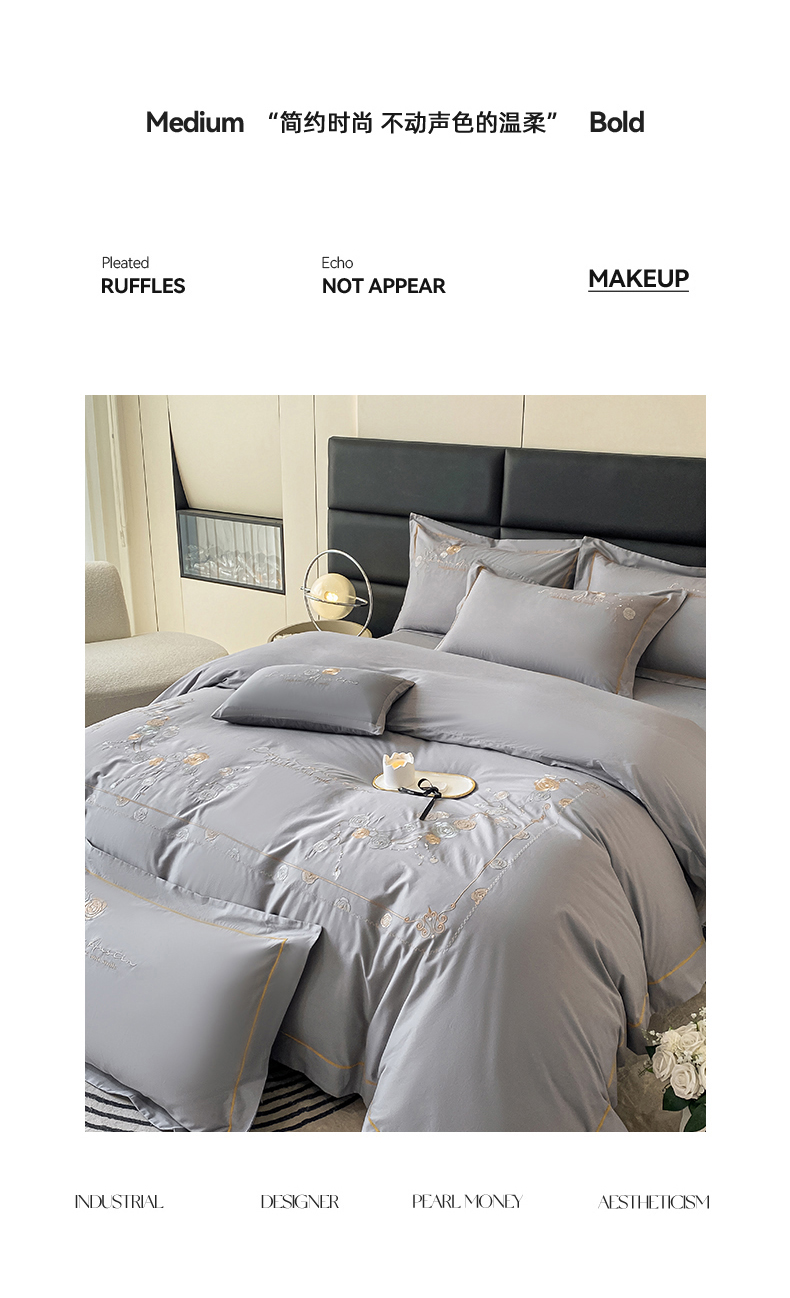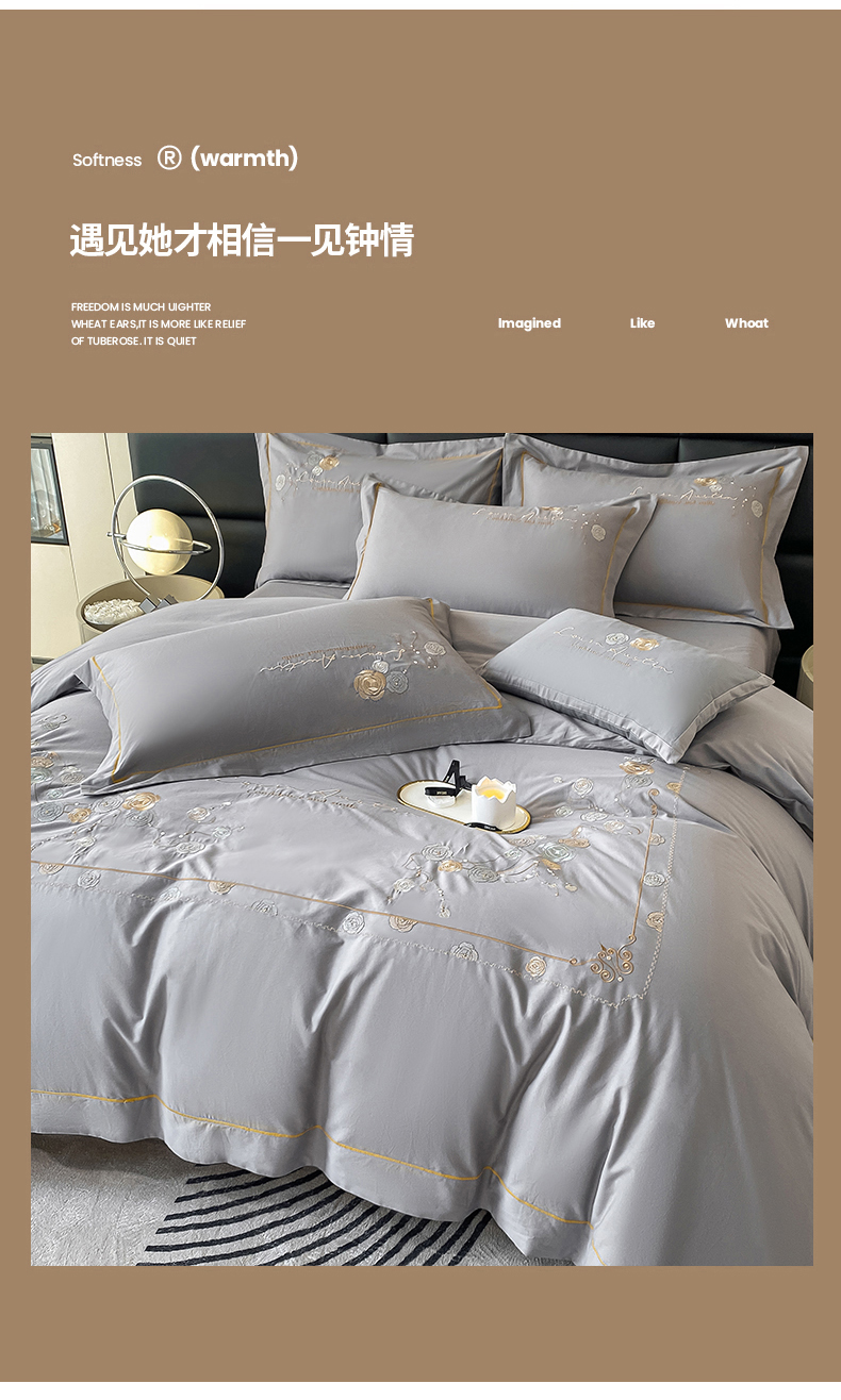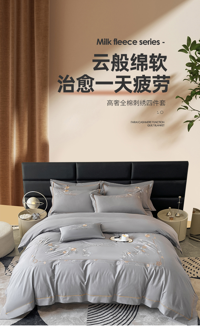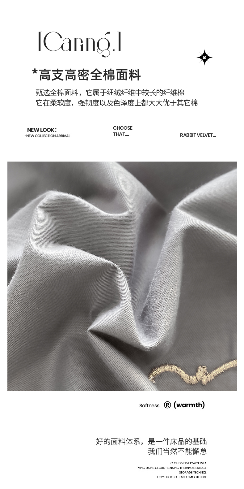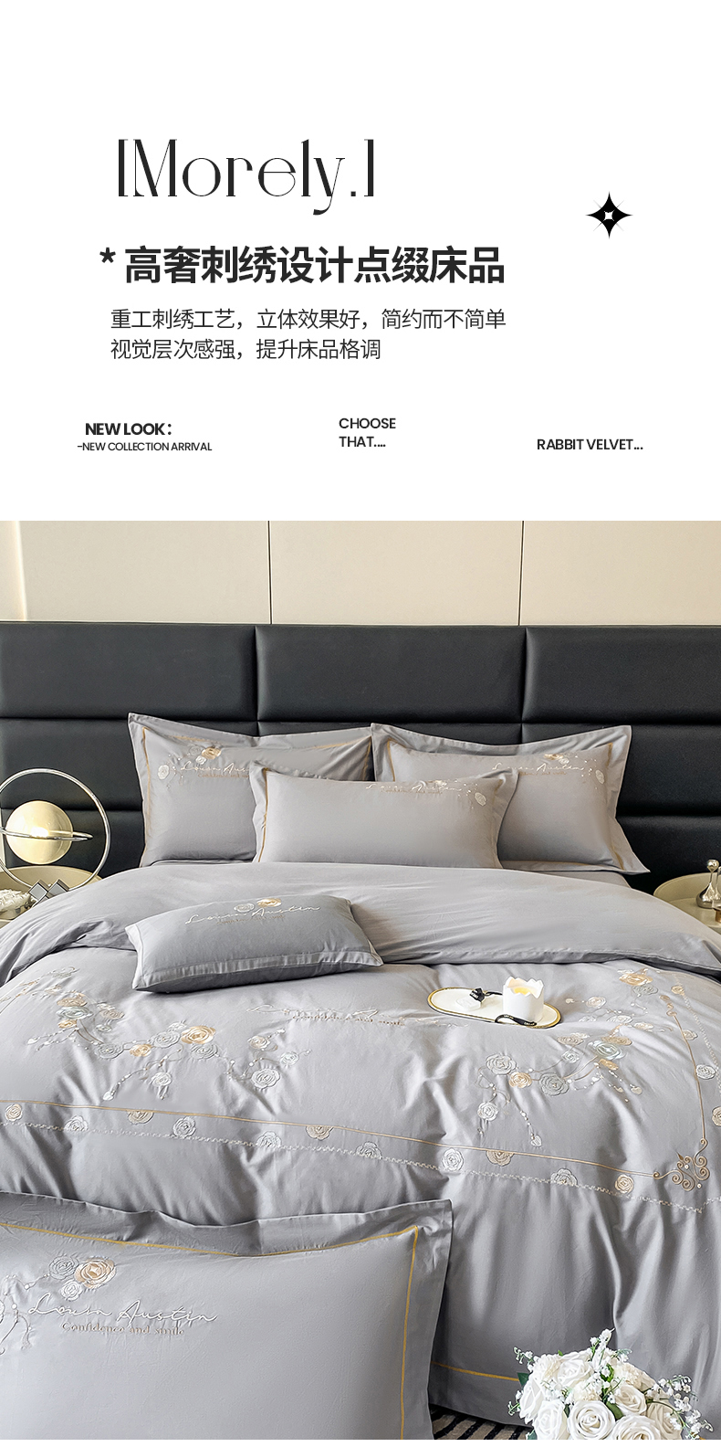 绒世界2024新款全棉刺绣烟雨系列四件套 一袭烟雨-高级灰