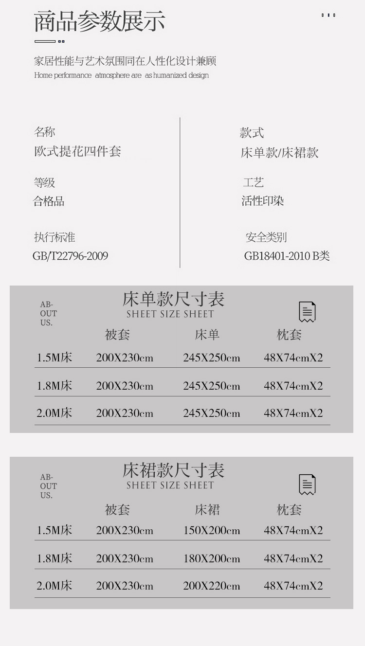 (1.8米床适用):被套200x230,床裙*180x200,枕套48*74