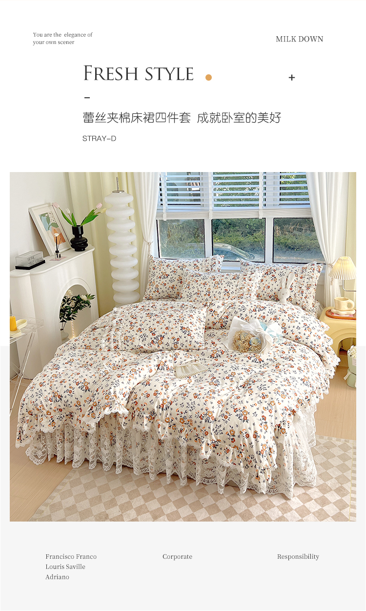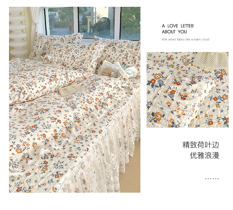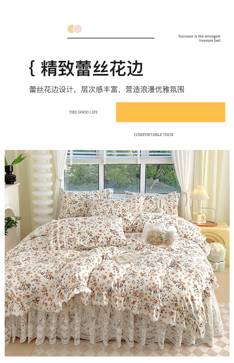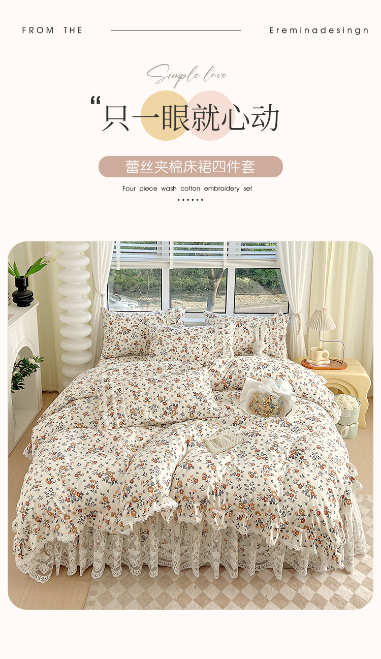 当前位置: 91家纺网 > 商品网购 > 床品套件 > 四件套 > 化纤普通四件套 > 罗艺轩 2024新款法式风蕾丝夹棉床裙款四件套 花想容-森之语