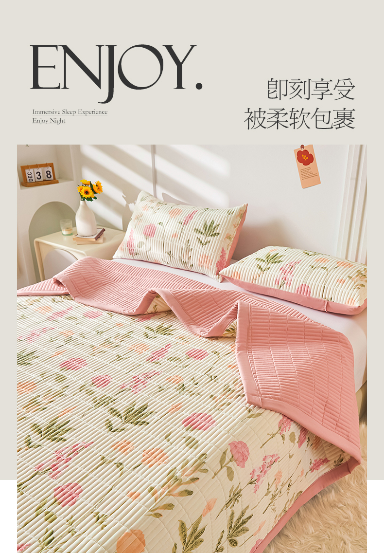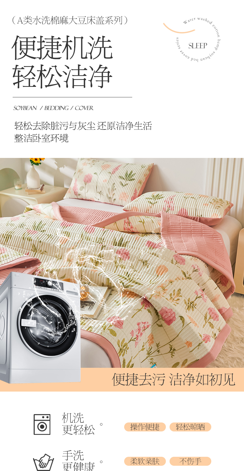 圣比熊水洗棉麻床盖大豆纤维夹棉加厚宿舍铺盖两用床单床裙保护垫 繁花似锦