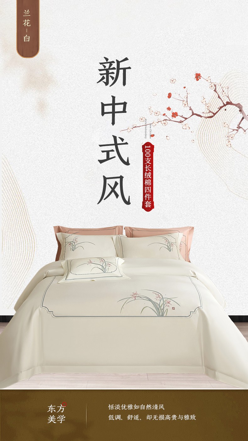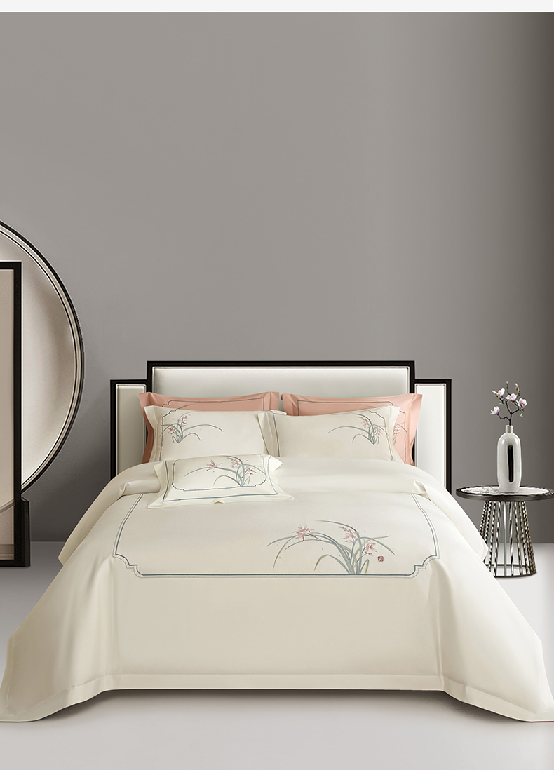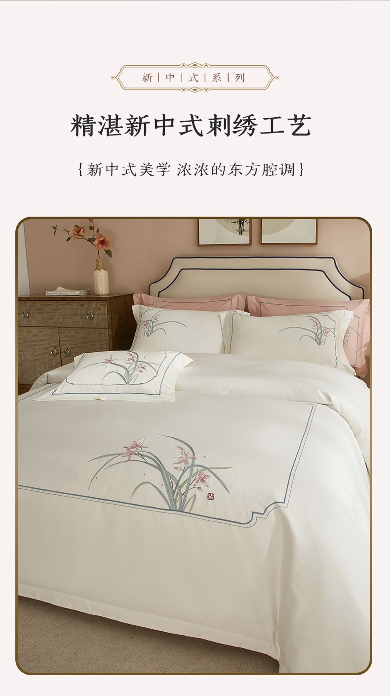 50S50支澳棉刺绣长绒棉四件套全棉新中式花卉直播爆款线下批发 兰花白