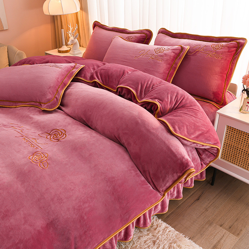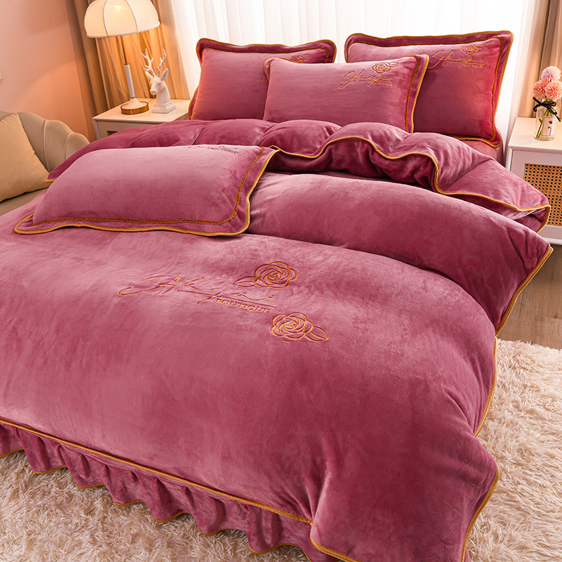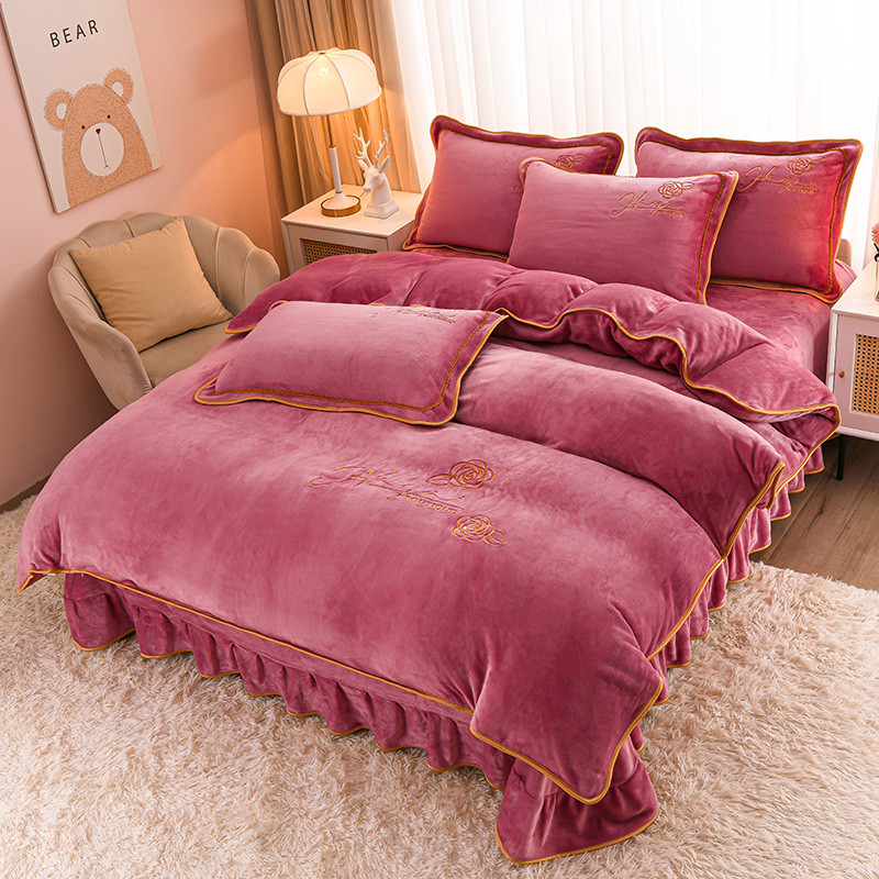 (总)博兰蒂 2025秋冬新款高克重纯色牛奶绒床裙款四件套,豆沙,粉玉,红色,灰色,橘色,咖色,蓝色,苹果绿,浅绿,紫色,墨紫