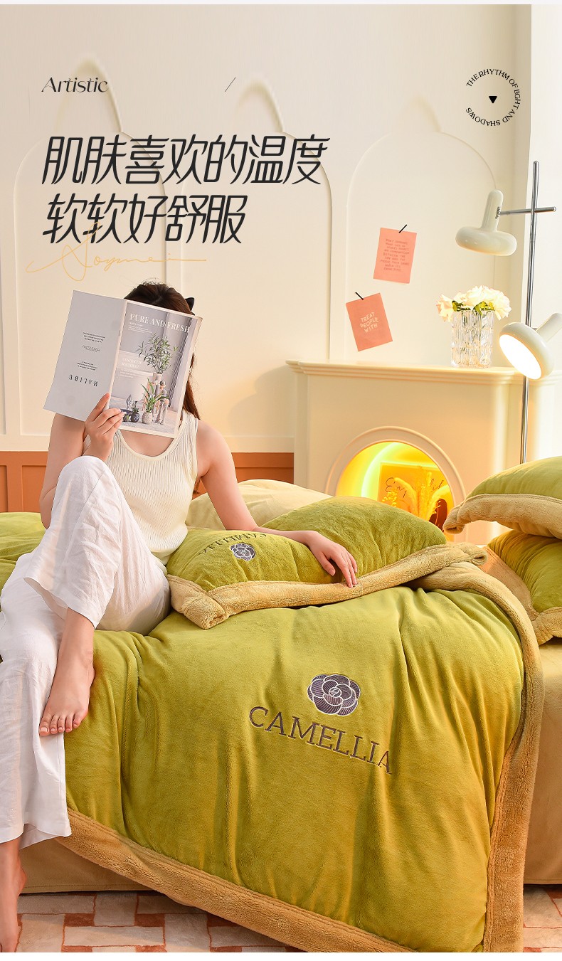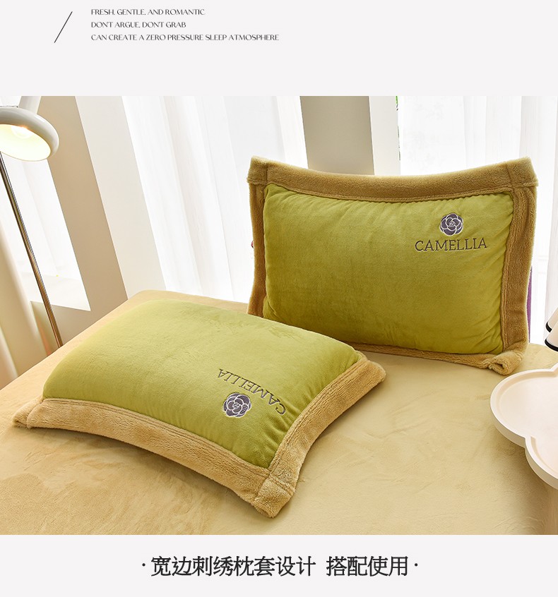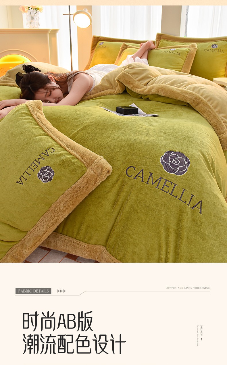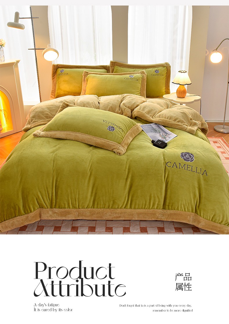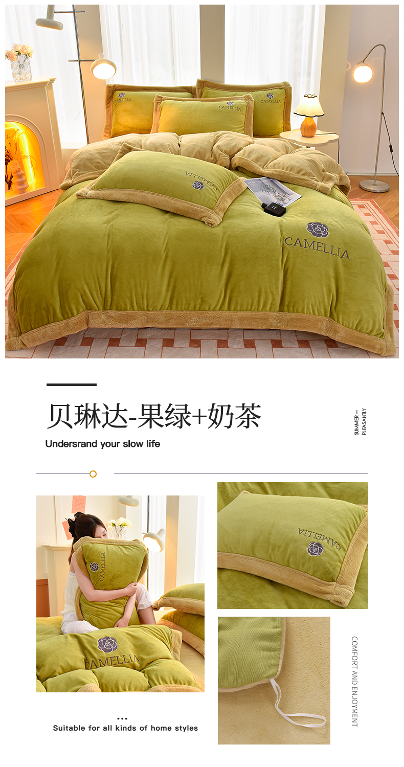 笙意 新款加厚牛奶绒刺绣四件套-贝琳达系列 贝琳达-果绿+奶茶