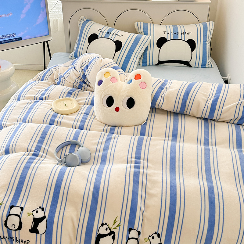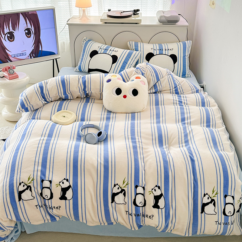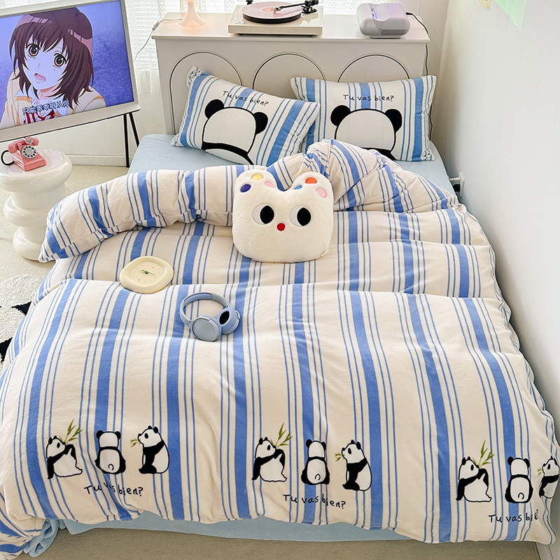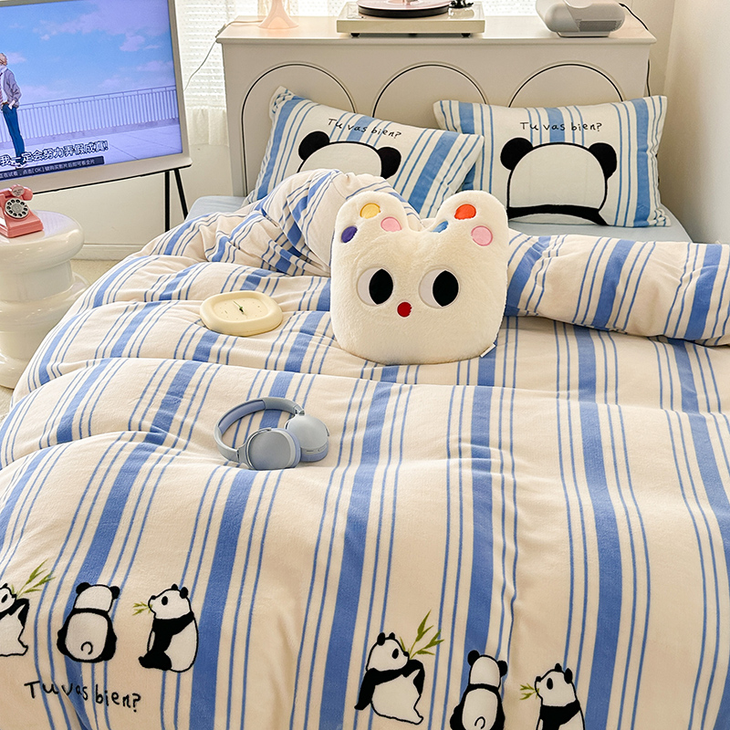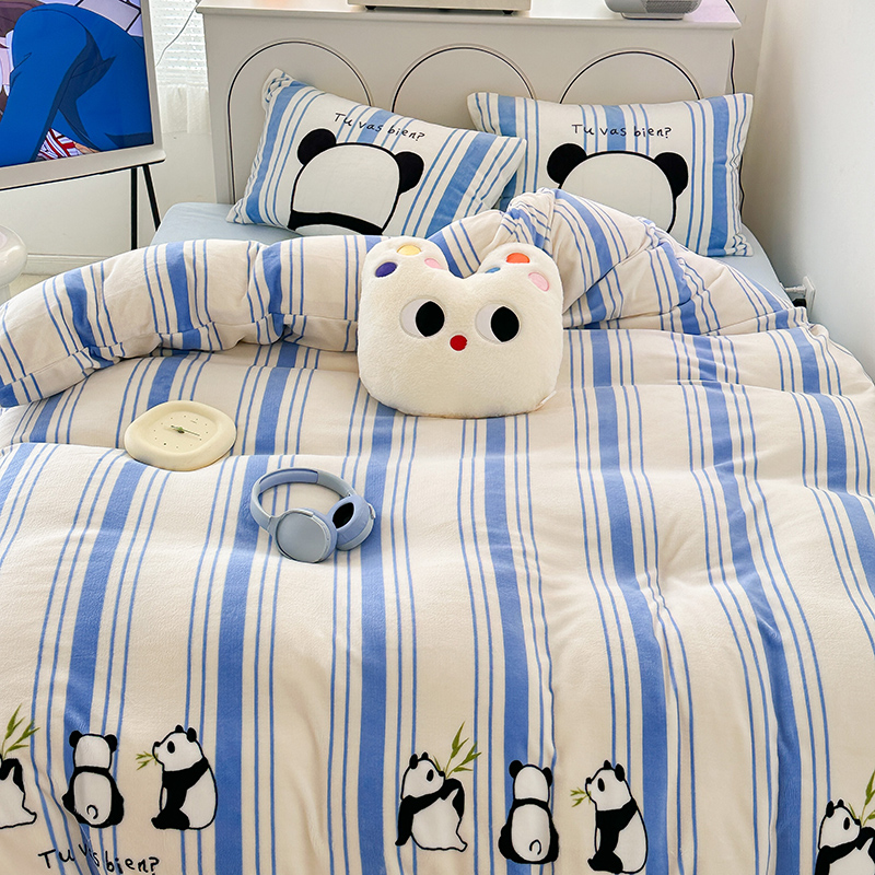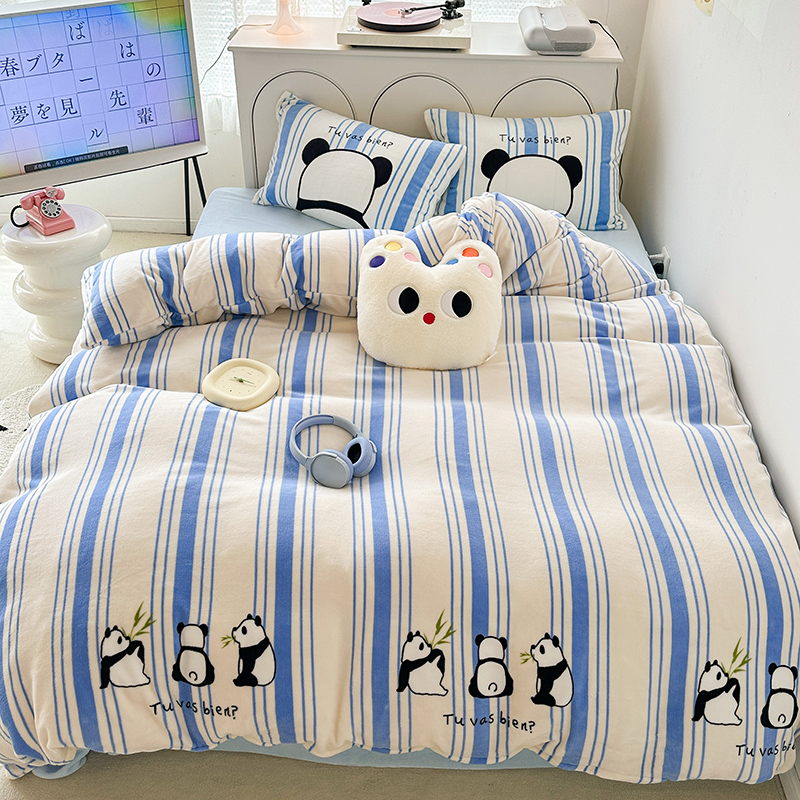 商品名称:昔可家纺 2023新款大版印花枕套牛奶绒系列四件套 竖条熊猫