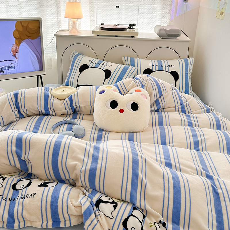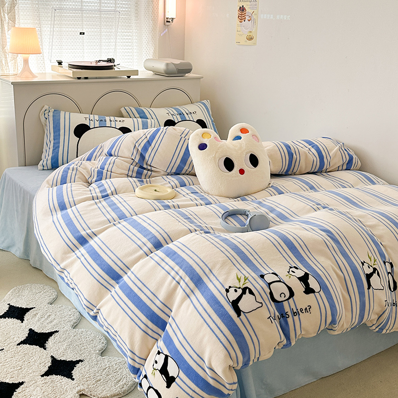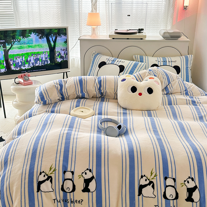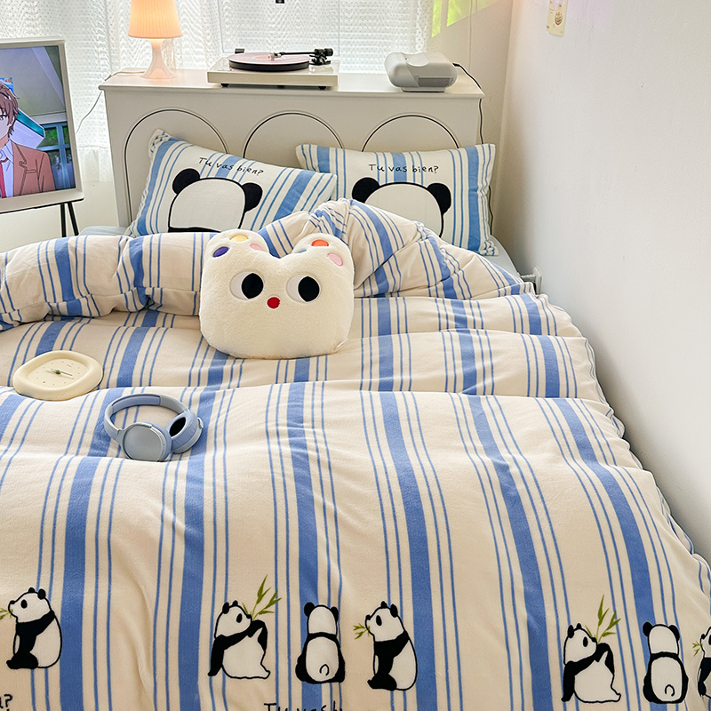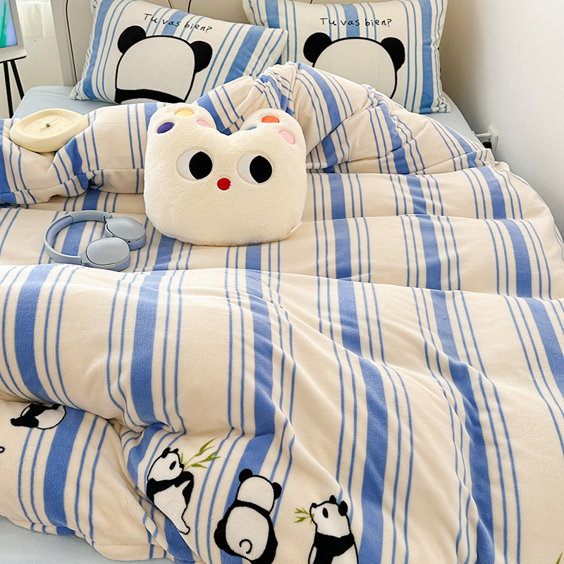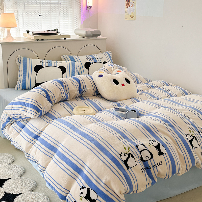 商品名称:昔可家纺 2023新款大版印花枕套牛奶绒系列四件套 竖条熊猫