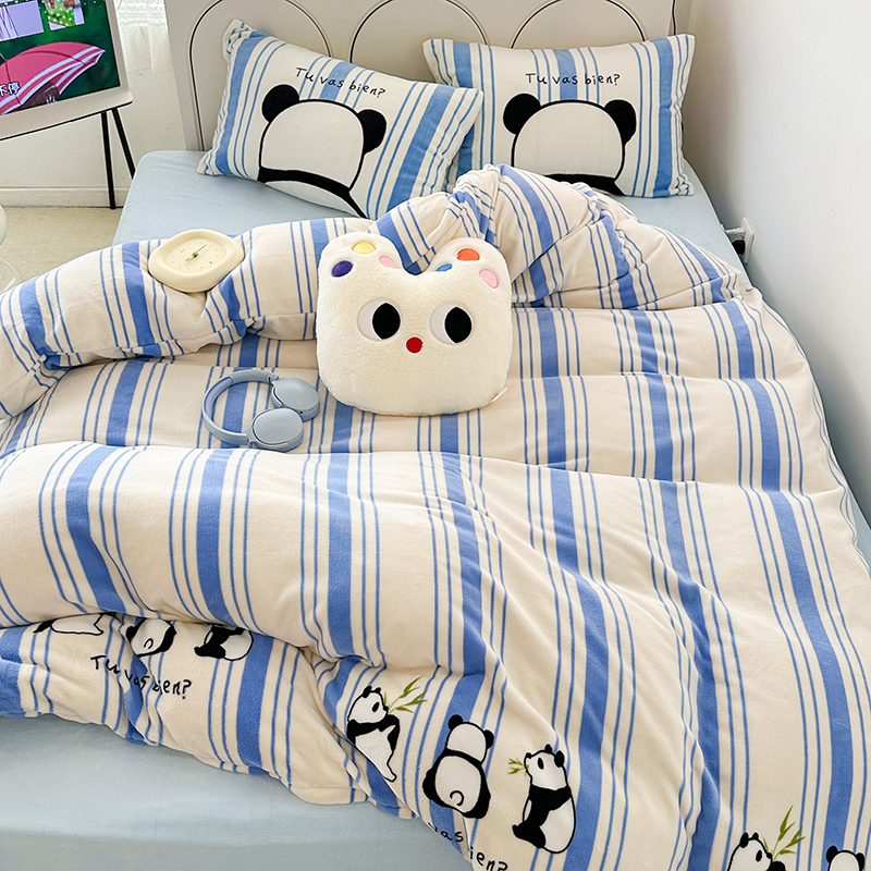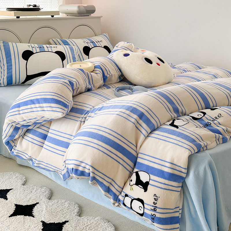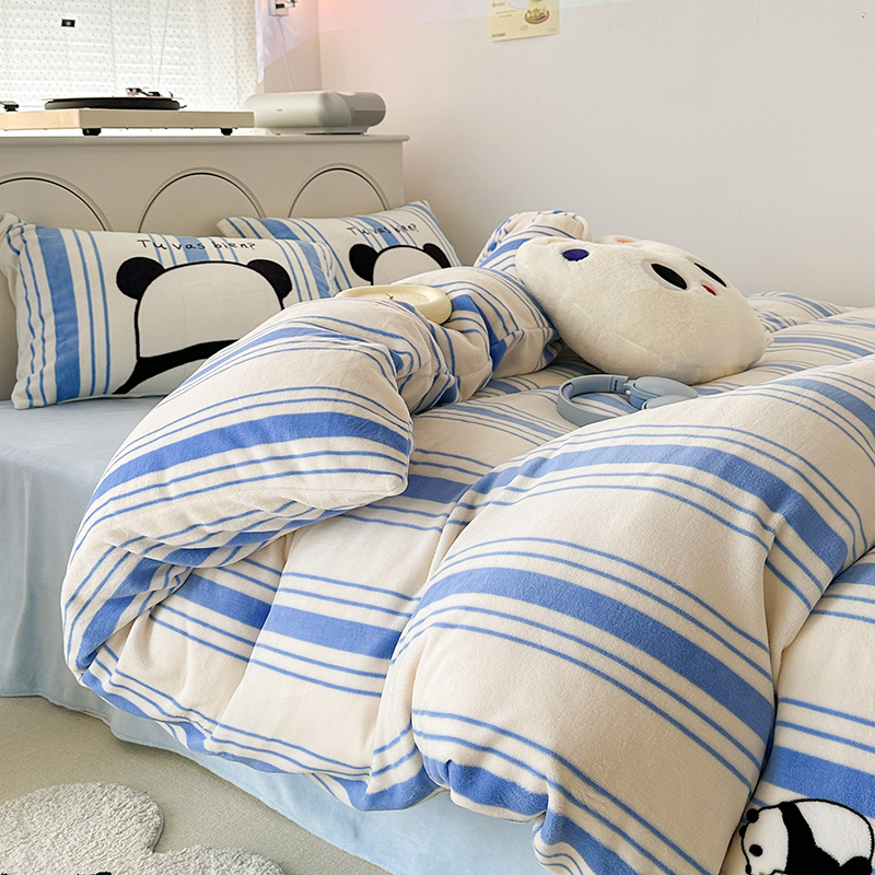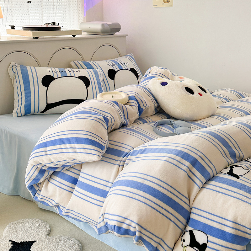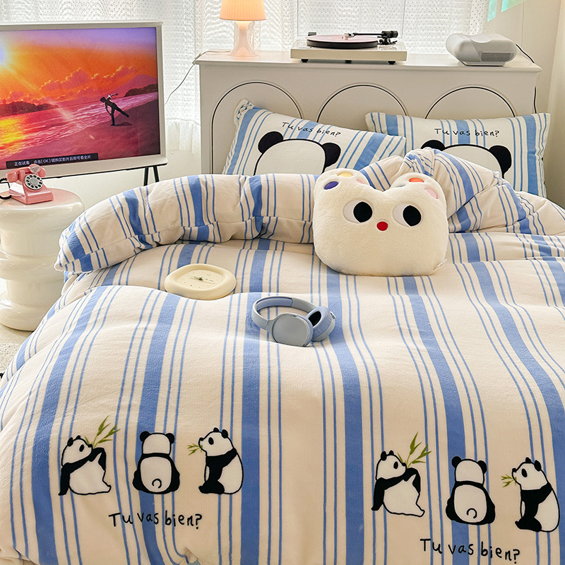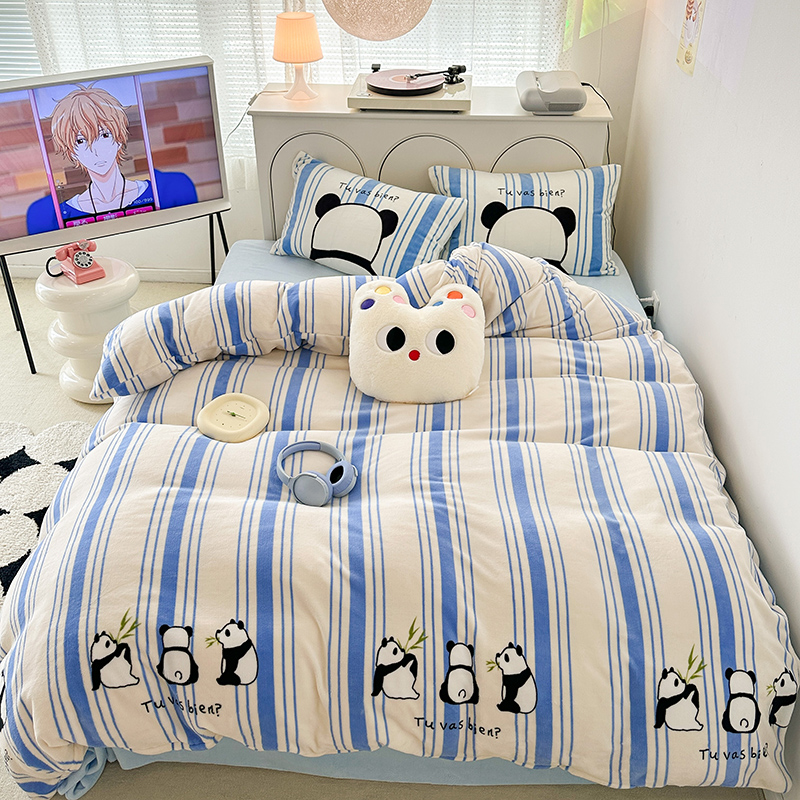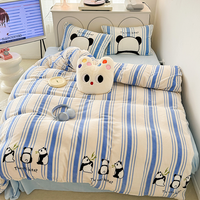 昔可家纺 2023新款大版印花枕套牛奶绒系列四件套 竖条熊猫