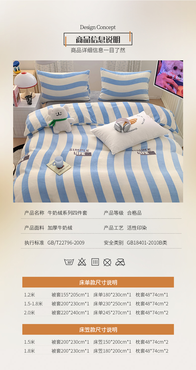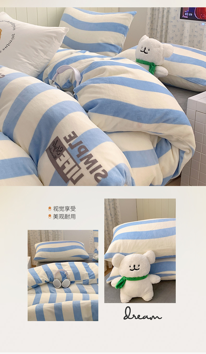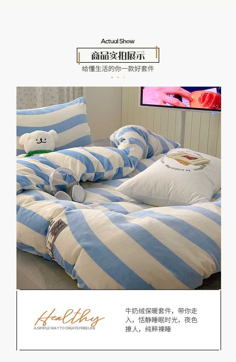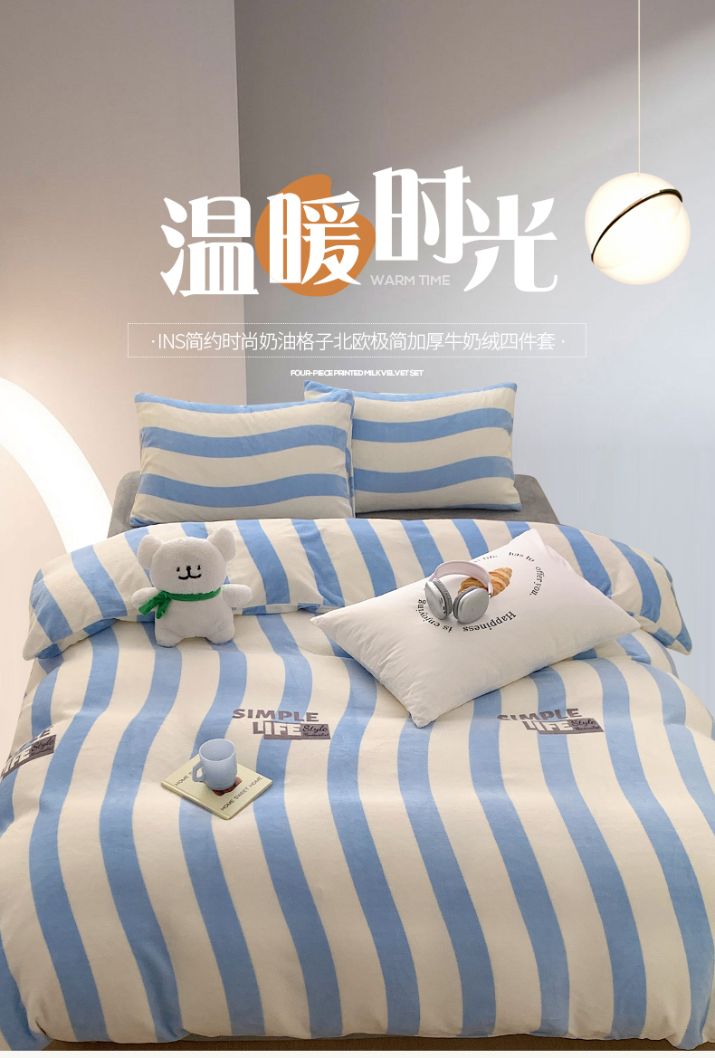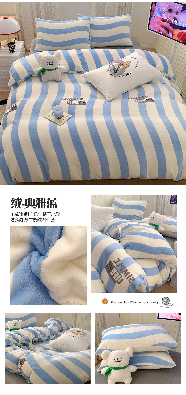商品名称:桃子家居 2023新款ins简约时尚奶油格子北欧极简加厚牛奶绒四件套 典雅蓝