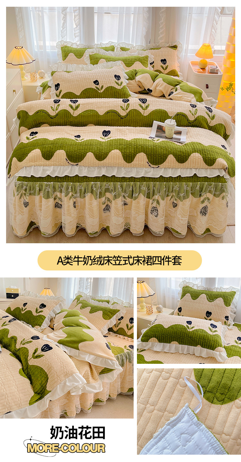 当前位置: 91家纺网 > 商品网购 > 床品套件 > 四件套 > 牛奶绒四件套 > 宜凡家纺 2023新款牛奶绒印花夹棉被套床笠式床裙四件套 奶油花田