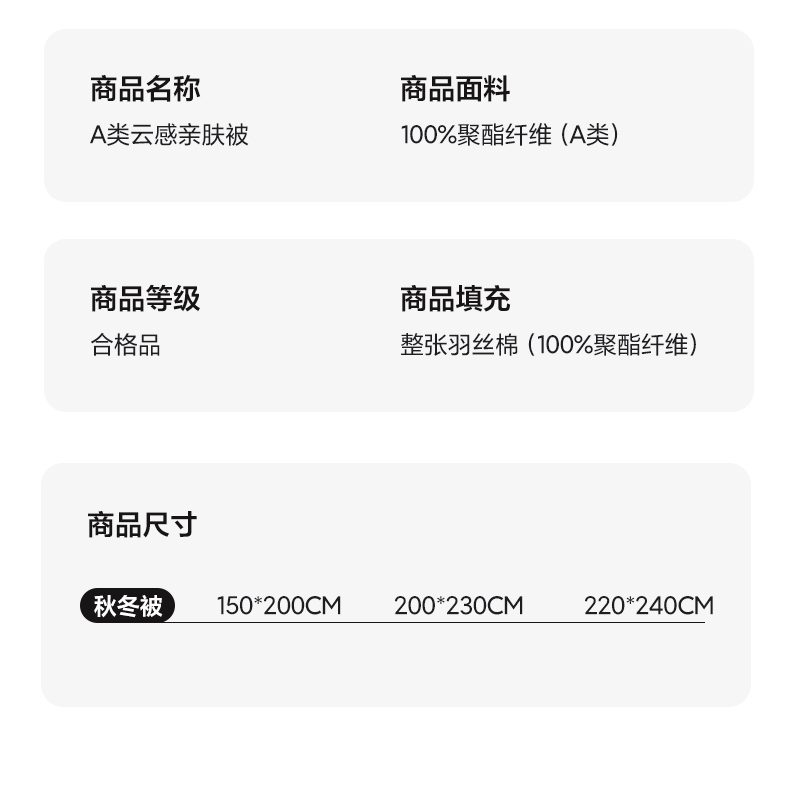[{"sp_id":11,"sp_name":"\u989c\u8272\u5206\u7c7b","sp_format":2,"sp_list":[{"sp_value_id":50,"sp_value_name":"\u8336\u854a\u5154\uff08\u8c46\u853b\u7c89\uff09","sp_value_image":{"id":999,"path":"https:\/\/img3.91jf.com\/ghelp\/2023\/20230918\/49627c89-35ce-420e-bcfc-0eeccb6f4c5520230918150729618.jpg_30_30.jpg"},"sp_value_video":{"id":0,"img":"","path":"","time":0,"download_num":0,"play_num":0},"price":"90.00","storage":300,"weight":"2.250","is_check_weight":0,"plus_price":"","sp_sort":189279094}]},{"sp_id":27,"sp_name":"\u5c3a\u5bf8","sp_format":1,"sp_list":[{"sp_value_id":306,"sp_value_name":"150x200cm \u7ea64.5\u65a4","sp_value_image":{"id":0,"path":""},"sp_value_video":{"id":0,"img":"","path":"","time":0,"download_num":0,"play_num":0},"price":"90.00","storage":100,"weight":"2.250","is_check_weight":0,"plus_price":"","sp_sort":189279094},{"sp_value_id":307,"sp_value_name":"200X230cm \u7ea66\u65a4","sp_value_image":{"id":0,"path":""},"sp_value_video":{"id":0,"img":"","path":"","time":0,"download_num":0,"play_num":0},"price":"105.00","storage":100,"weight":"3.000","is_check_weight":0,"plus_price":"","sp_sort":189279095},{"sp_value_id":308,"sp_value_name":"220x240cm \u7ea67\u65a4","sp_value_image":{"id":0,"path":""},"sp_value_video":{"id":0,"img":"","path":"","time":0,"download_num":0,"play_num":0},"price":"120.00","storage":100,"weight":"3.500","is_check_weight":0,"plus_price":"","sp_sort":189279096}]}]