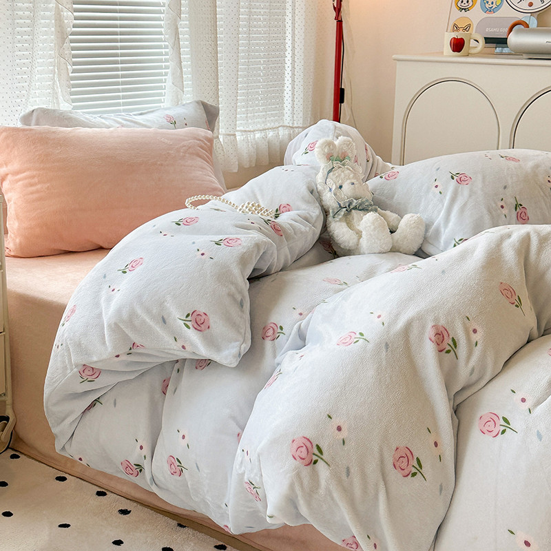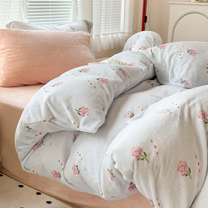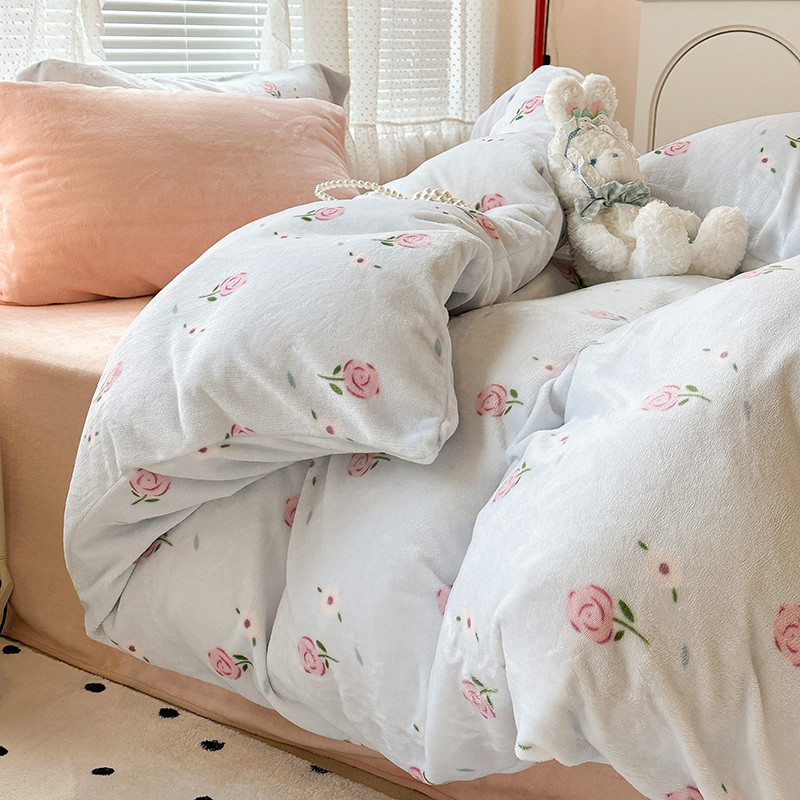 昔可 2023新款柔软舒适混搭牛奶绒四件套 蓝色甜美玫瑰