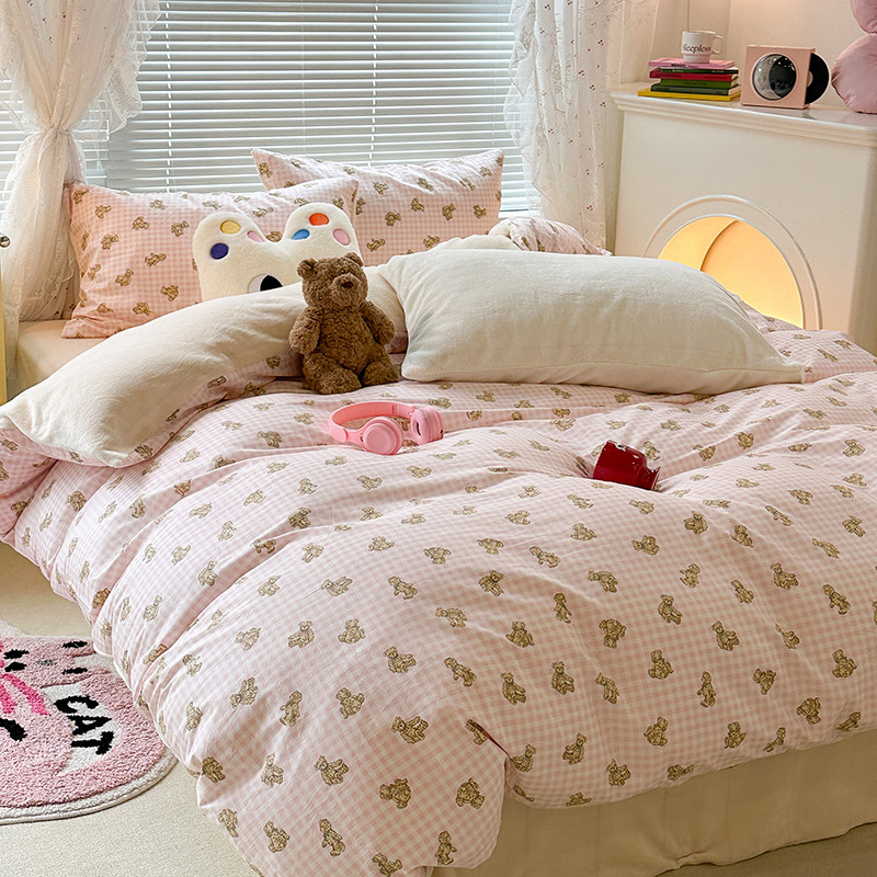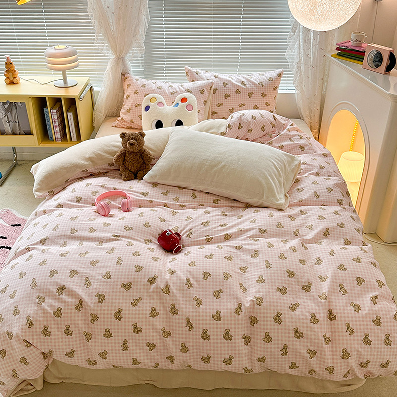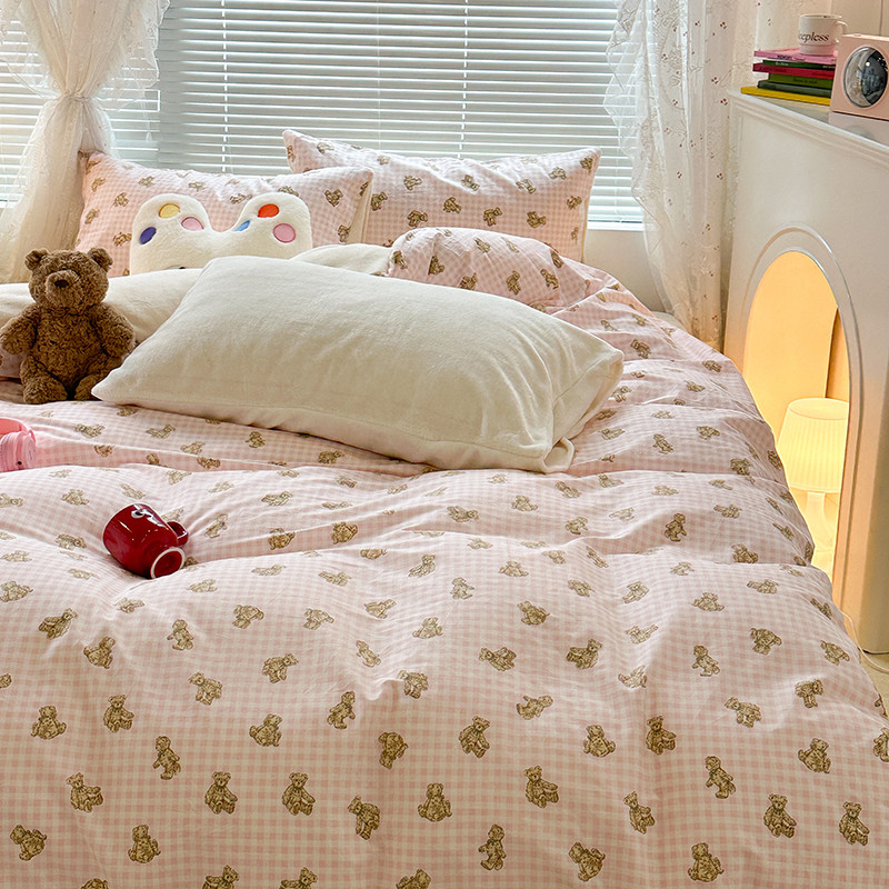 昔可 2023新款亲肤柔软棉加绒四件套 粉格小熊