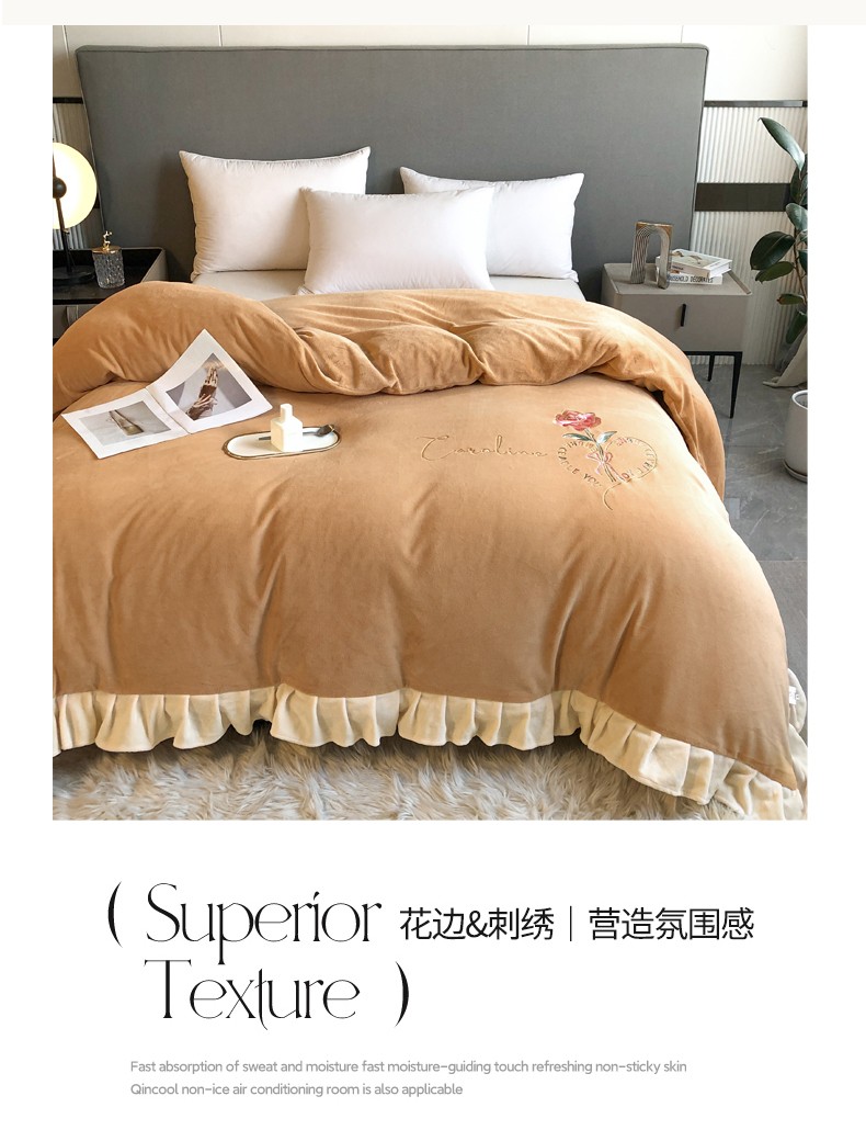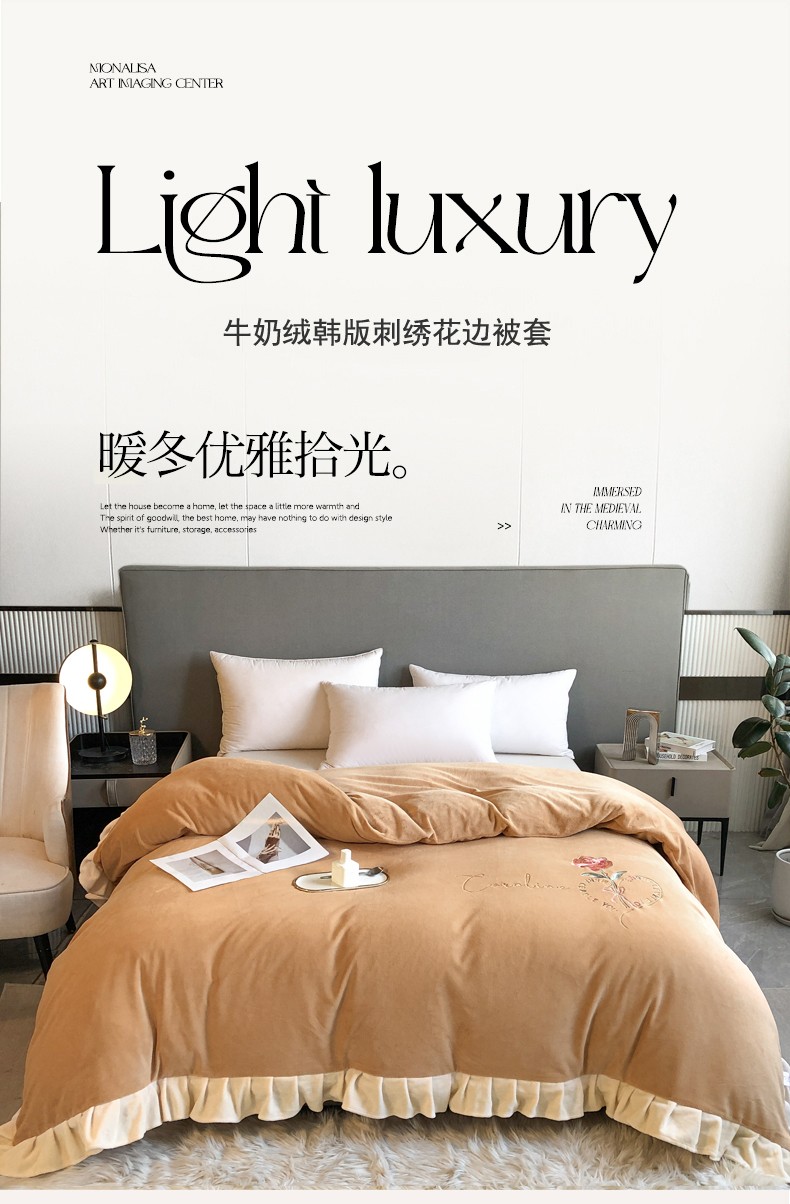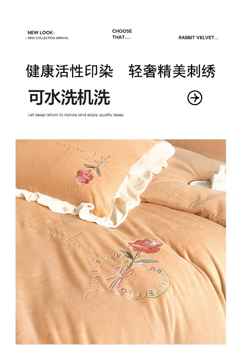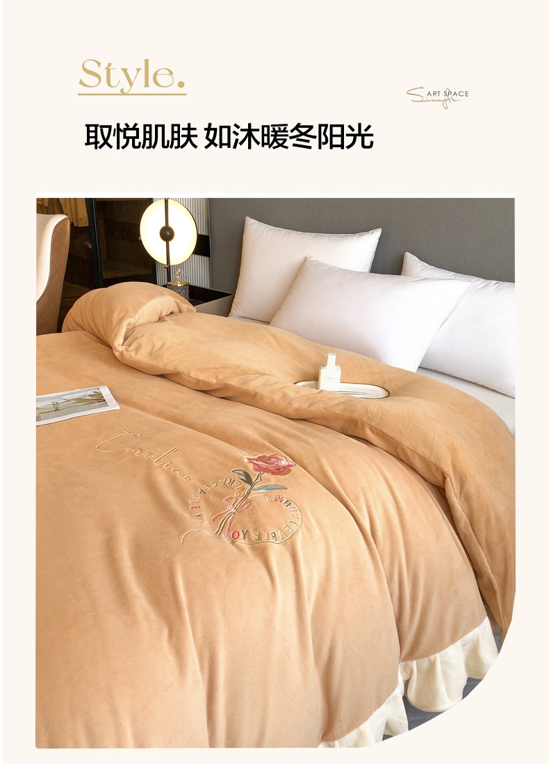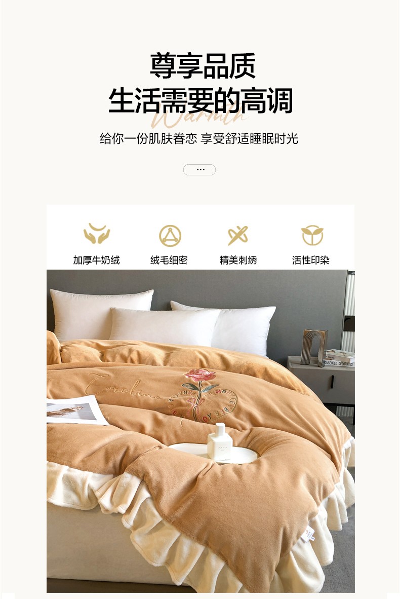 商品名称:7v 2023新款牛奶绒韩版花边刺绣被套法兰绒宝宝绒兔绒单被套 偏爱-浅驼