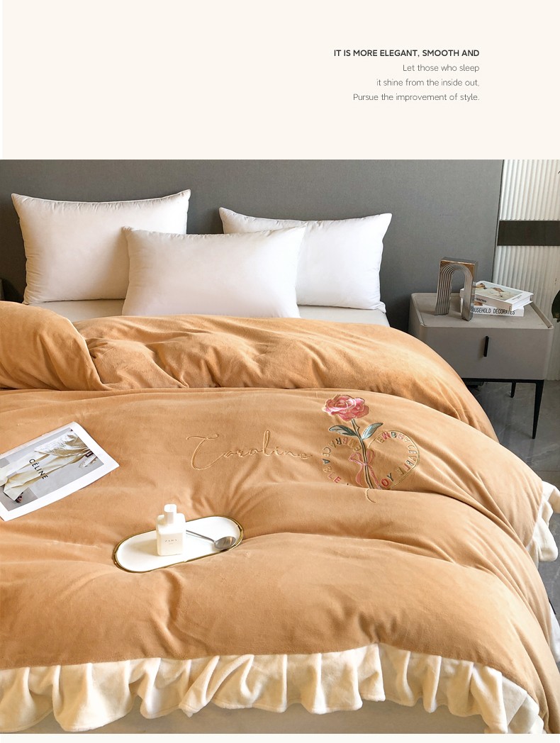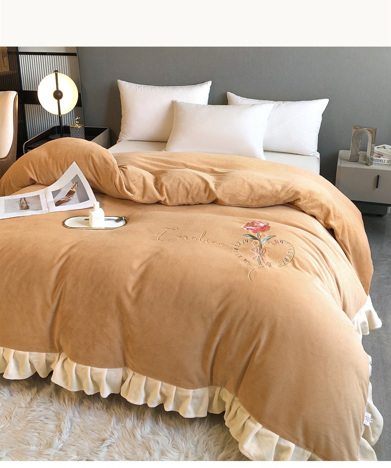 7v 2023新款牛奶绒韩版花边刺绣被套法兰绒宝宝绒兔绒单被套 偏爱-浅驼