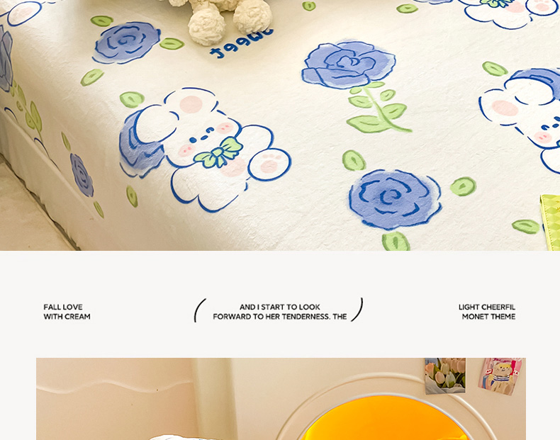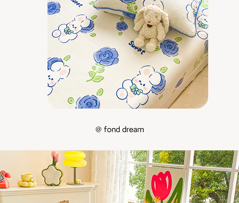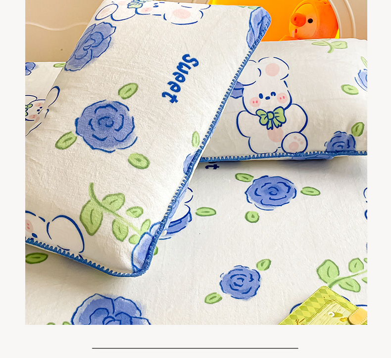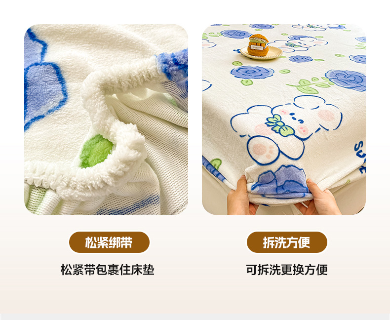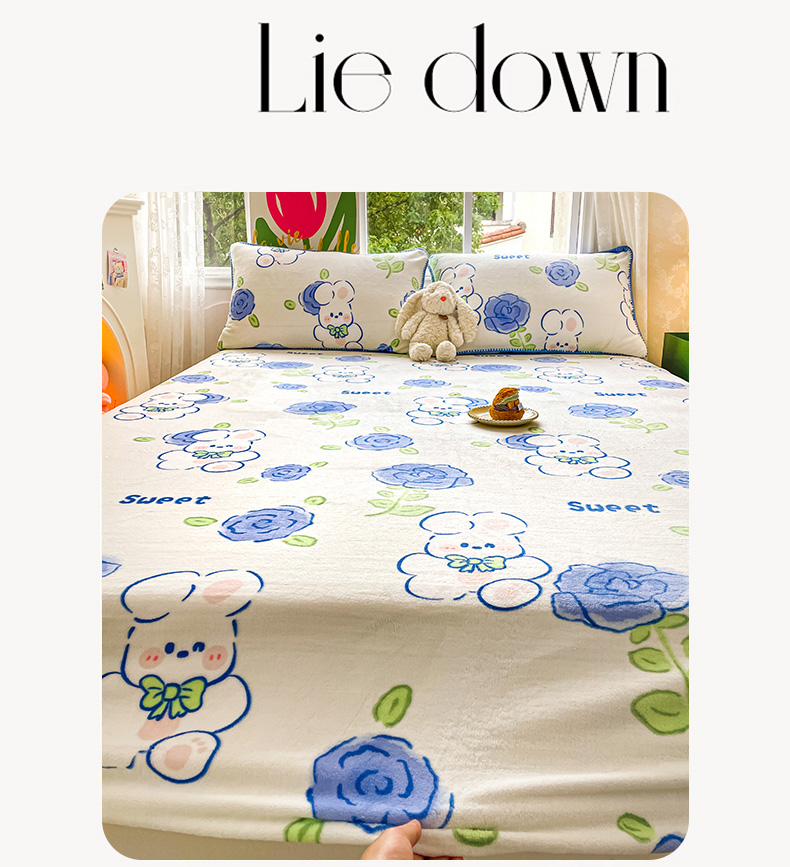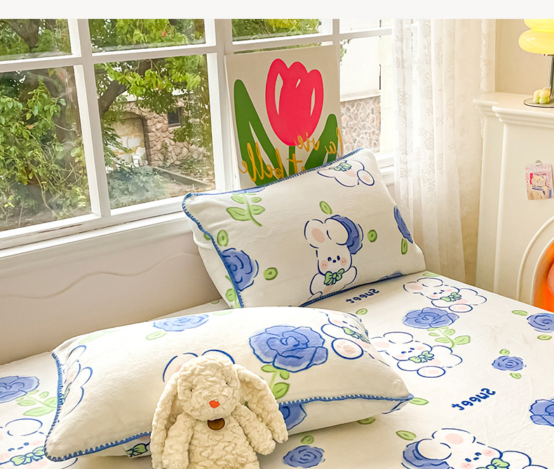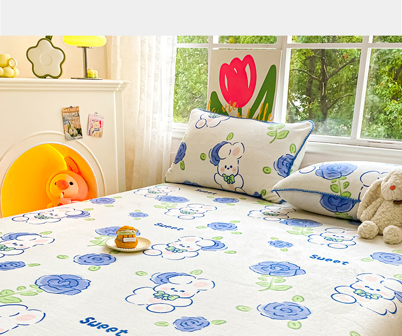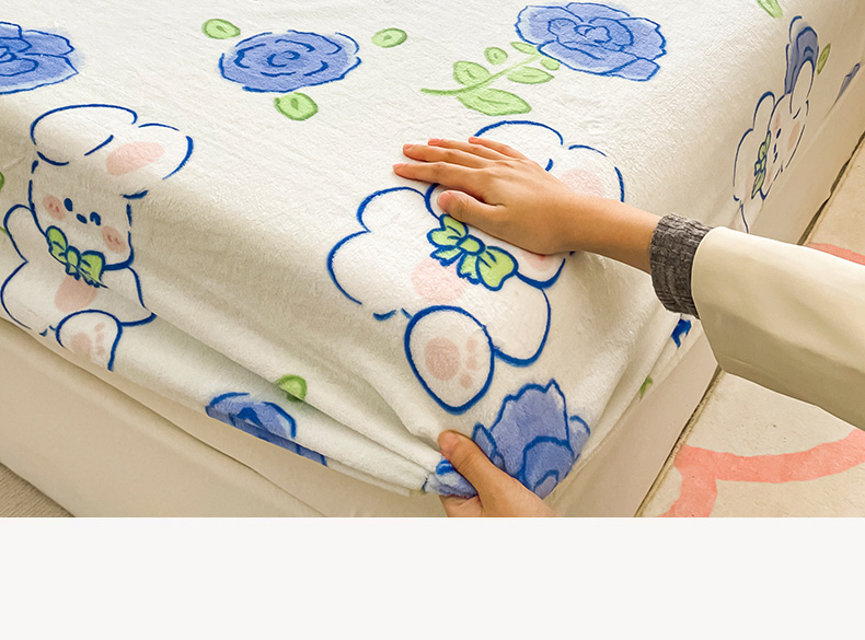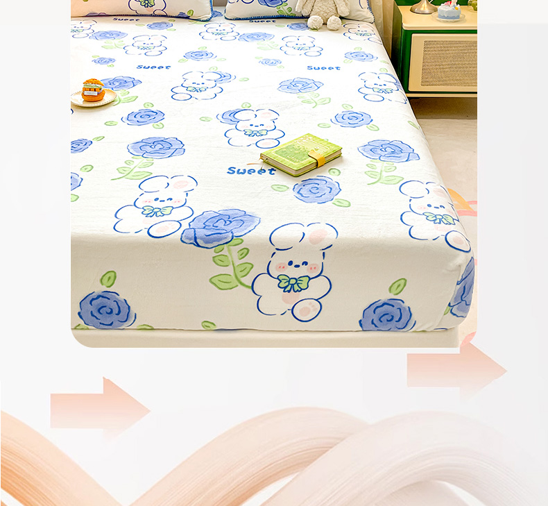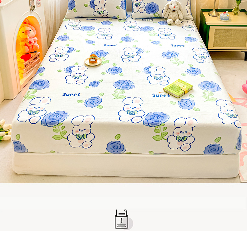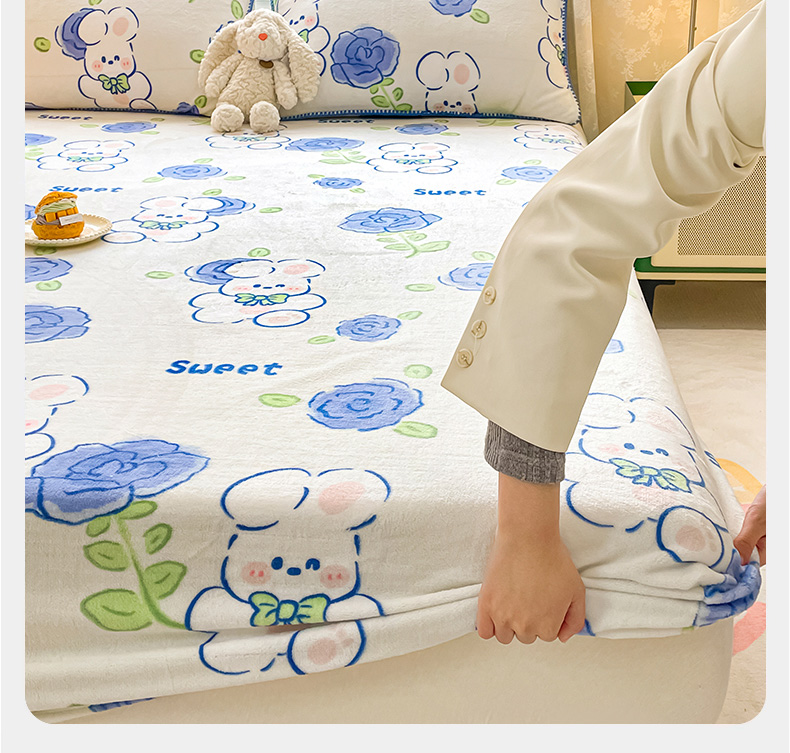 商品名称:安哆啦家纺 2024新款高克重牛奶绒印花单床笠 蓝色小兔