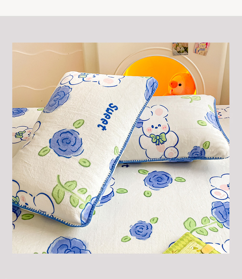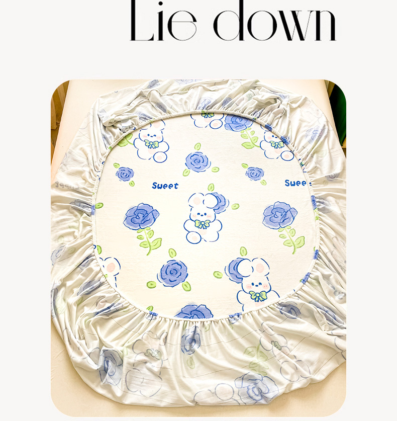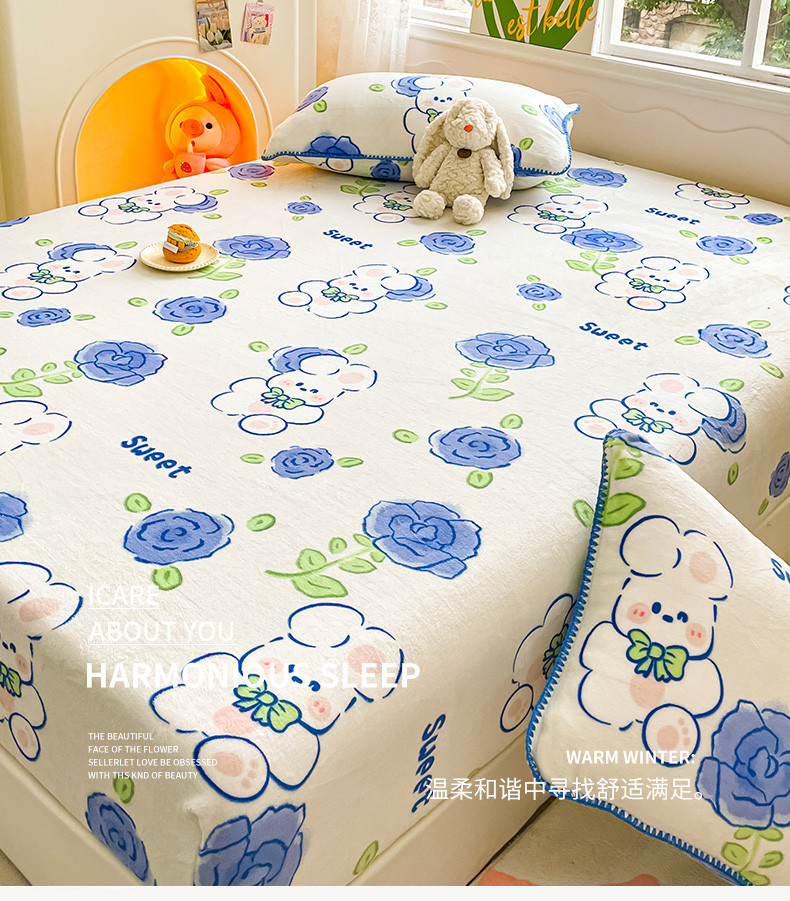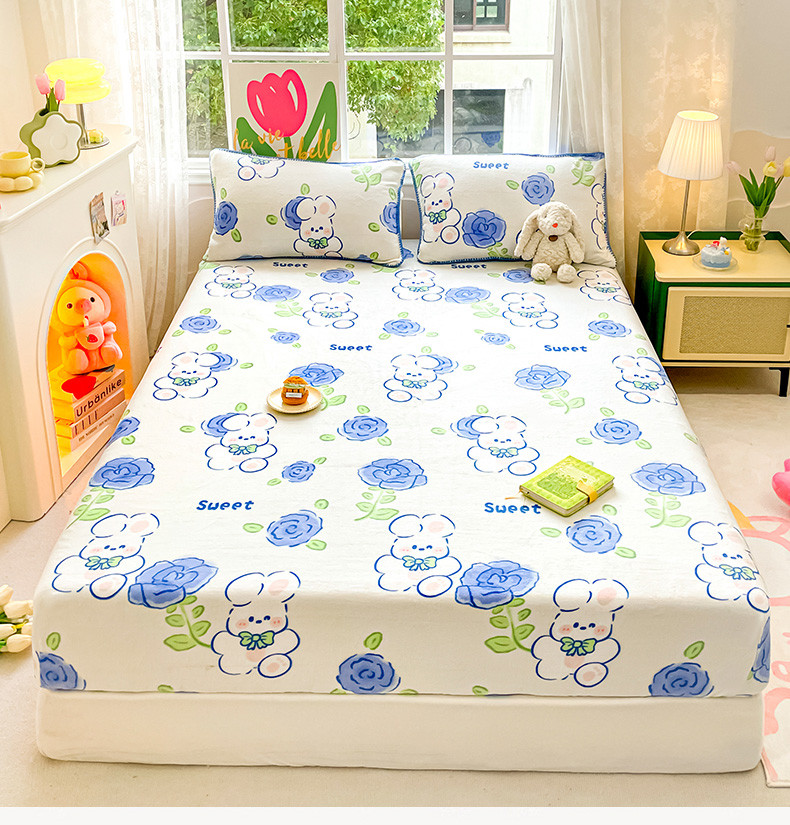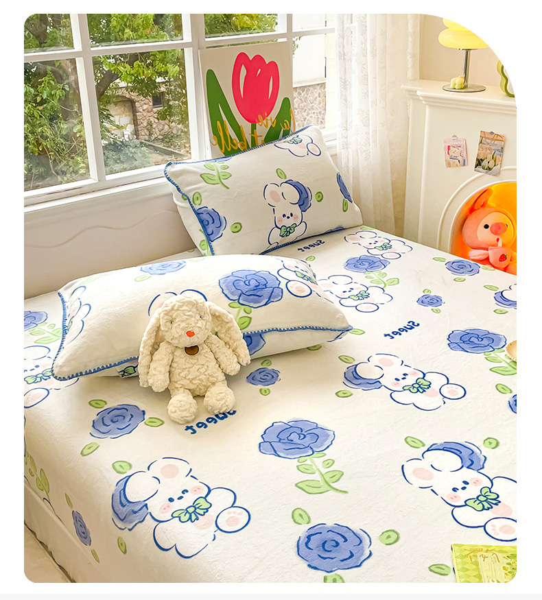 安哆啦家纺 2024新款高克重牛奶绒印花单床笠 蓝色小兔