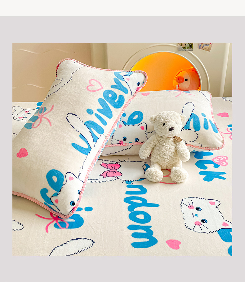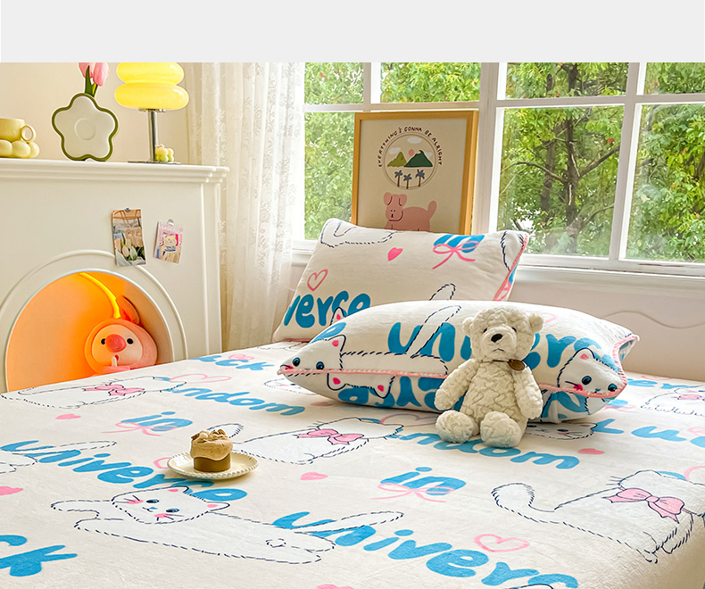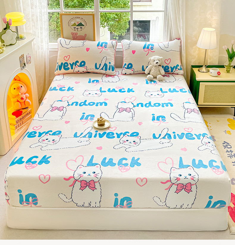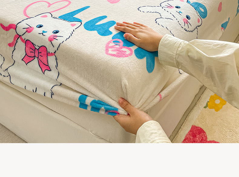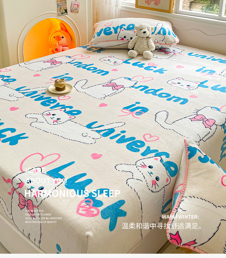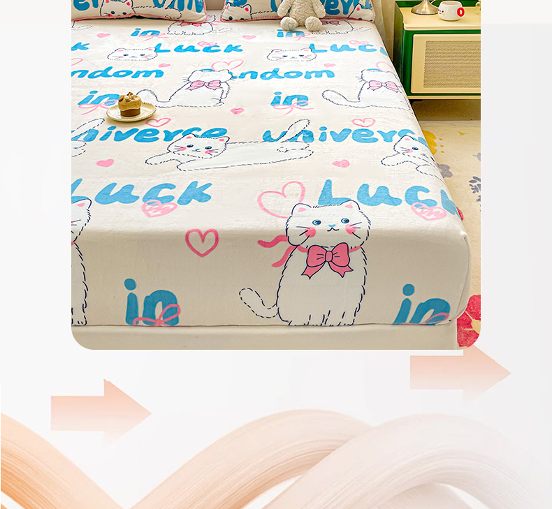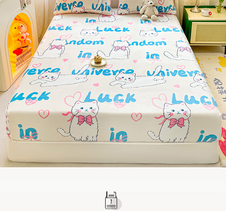 安哆啦家纺 2024新款高克重牛奶绒印花单床笠 英文猫咪