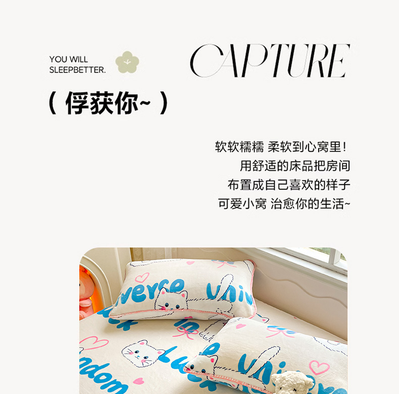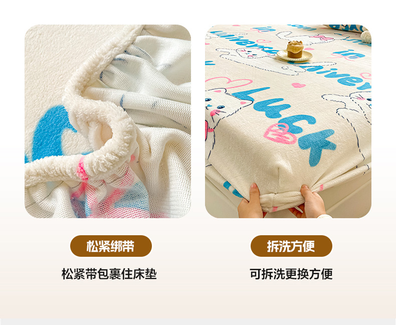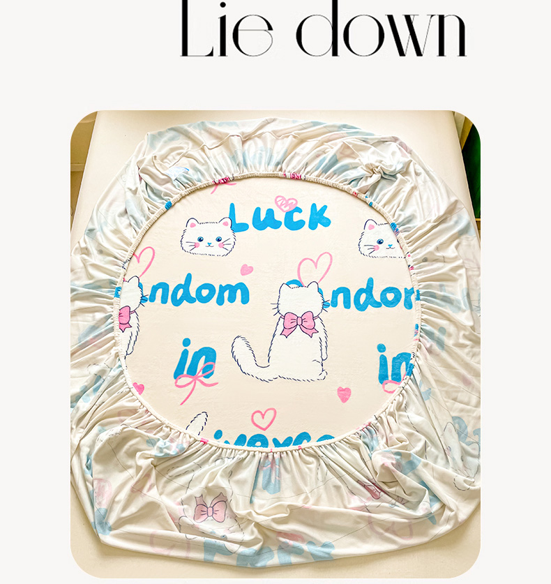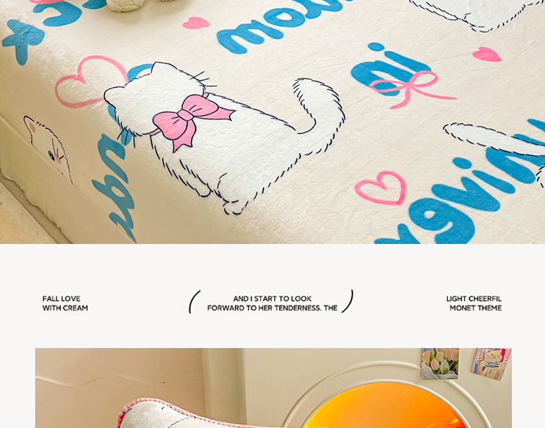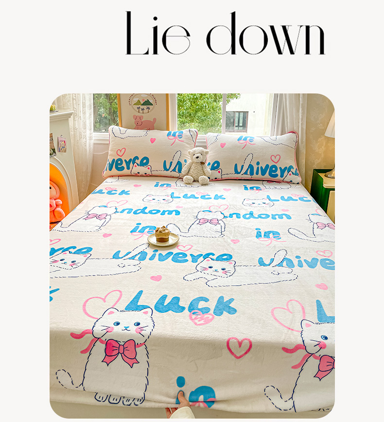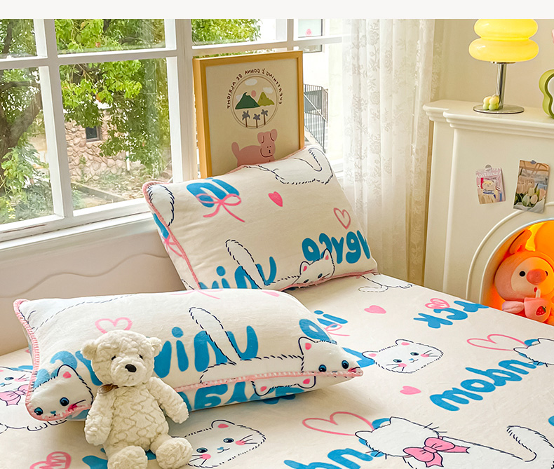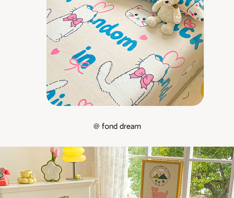 安哆啦家纺 2024新款高克重牛奶绒印花单床笠 英文猫咪