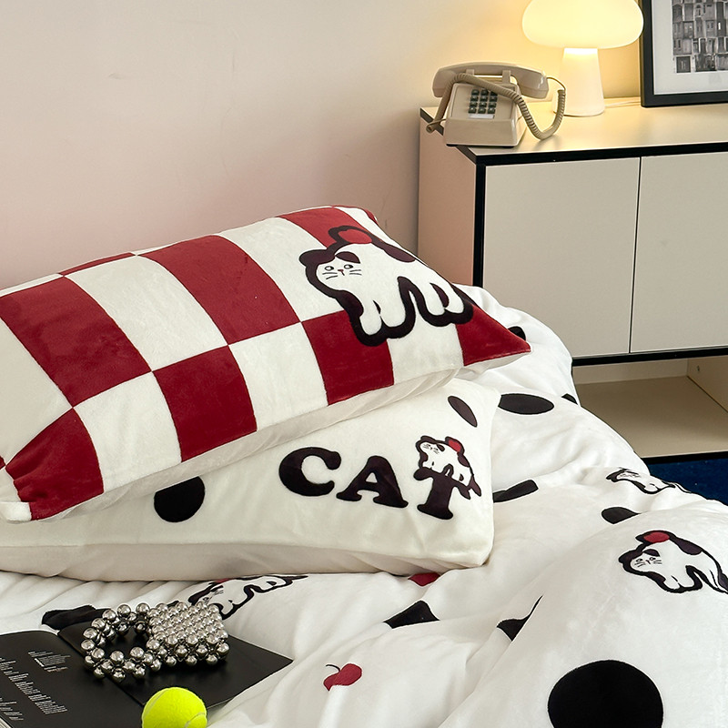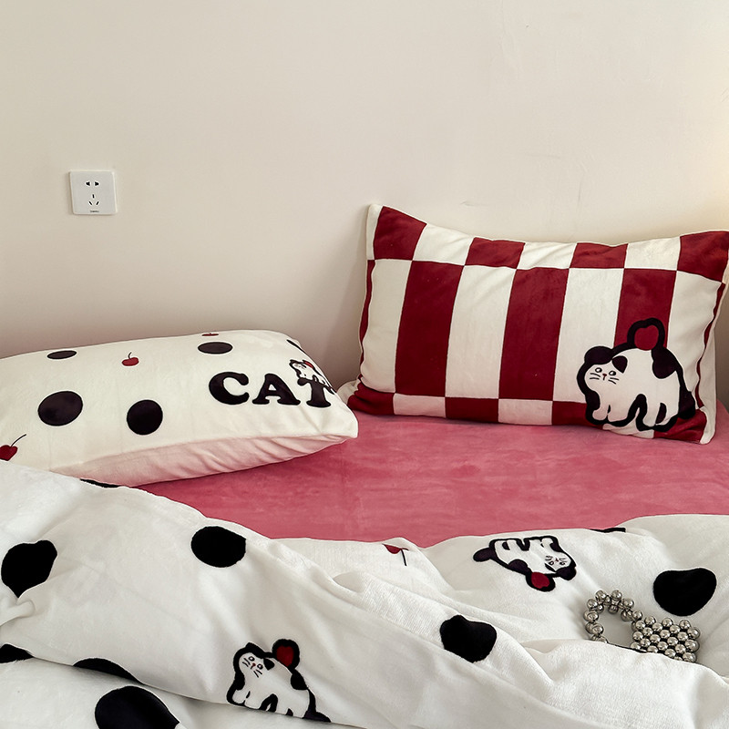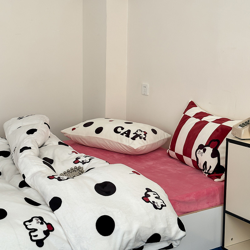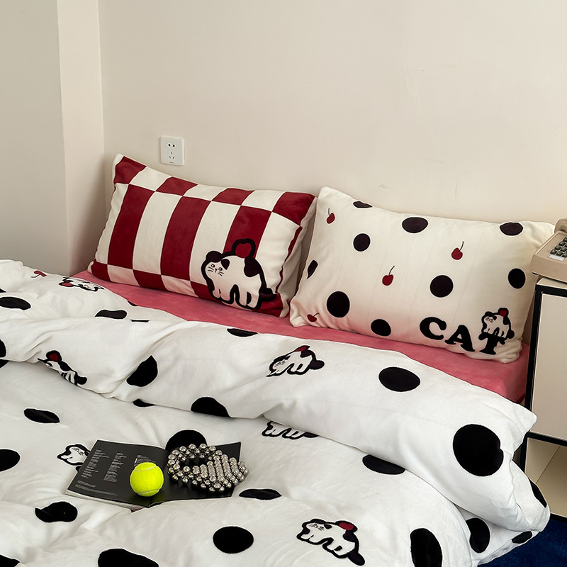 昔可 2023新款大版印花枕套牛奶绒系列四件套-模特图 波点猫