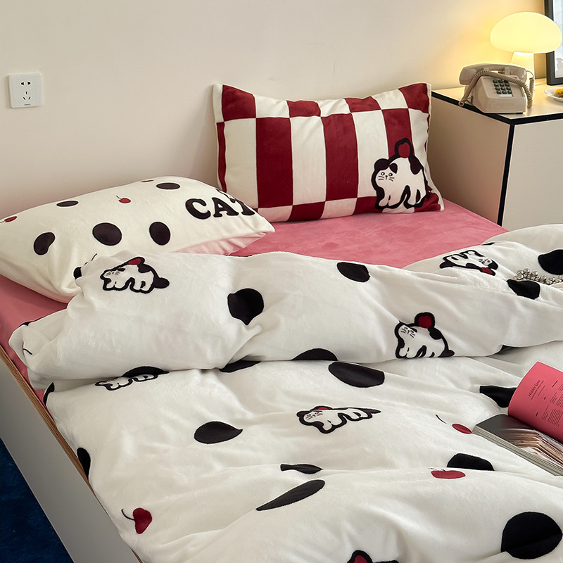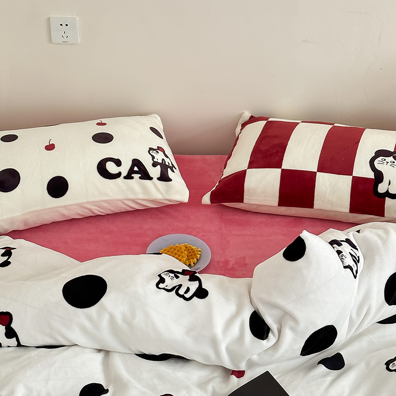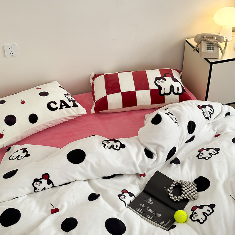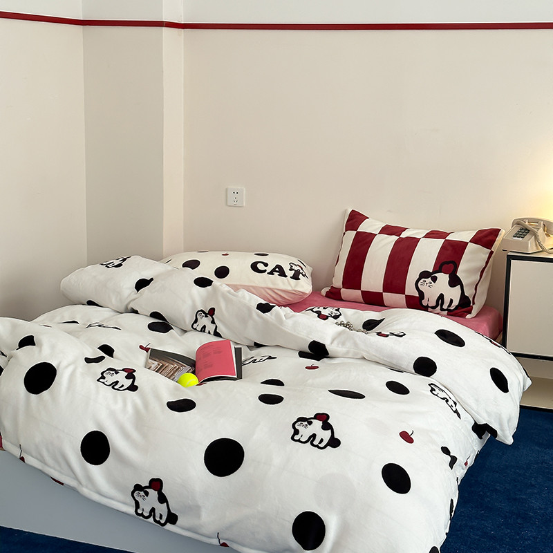 商品名称:昔可 2023新款大版印花枕套牛奶绒系列四件套-模特图 波点猫