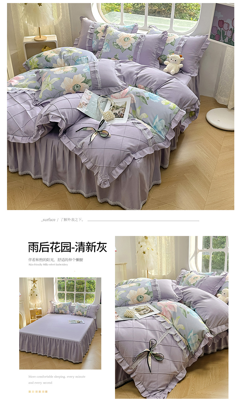 商品名称:金米诺 2024新款蝴蝶结韩版蕾丝花边床裙四件套 雨后花园-清新灰