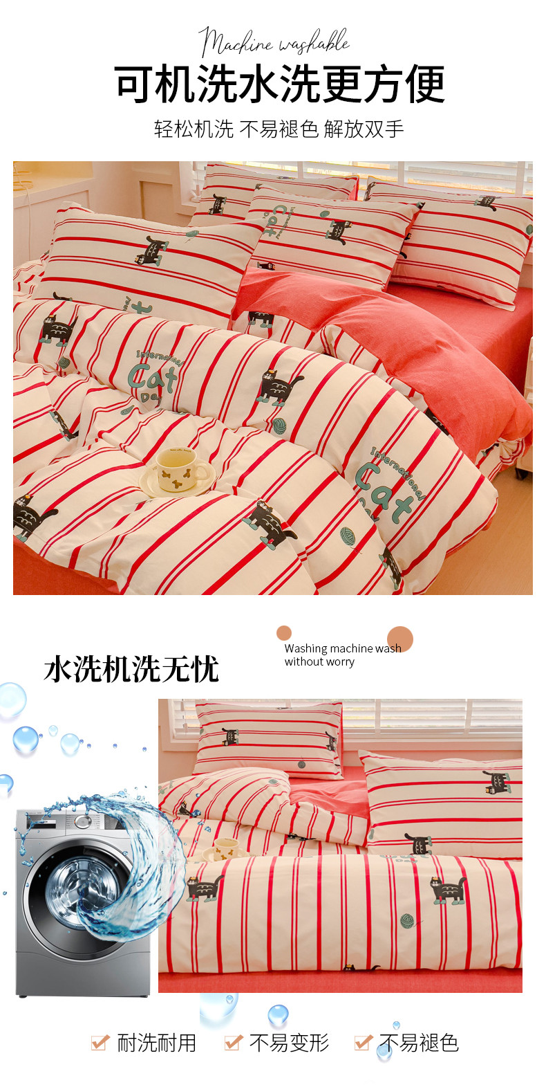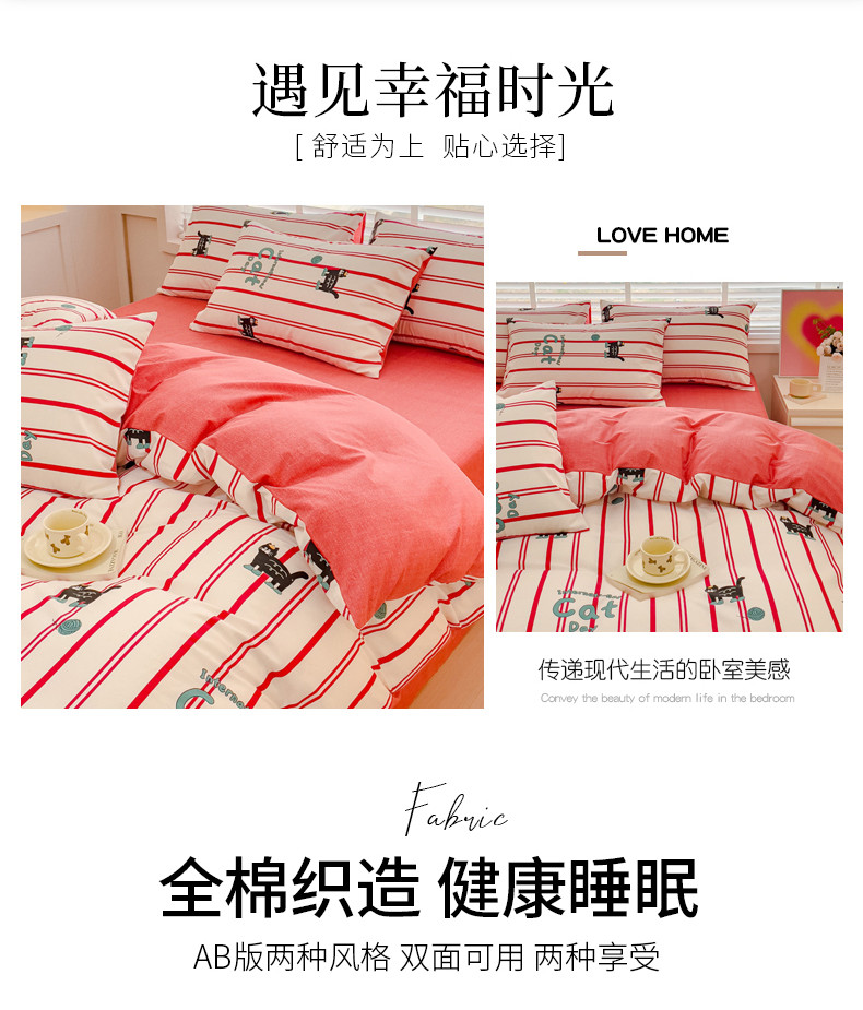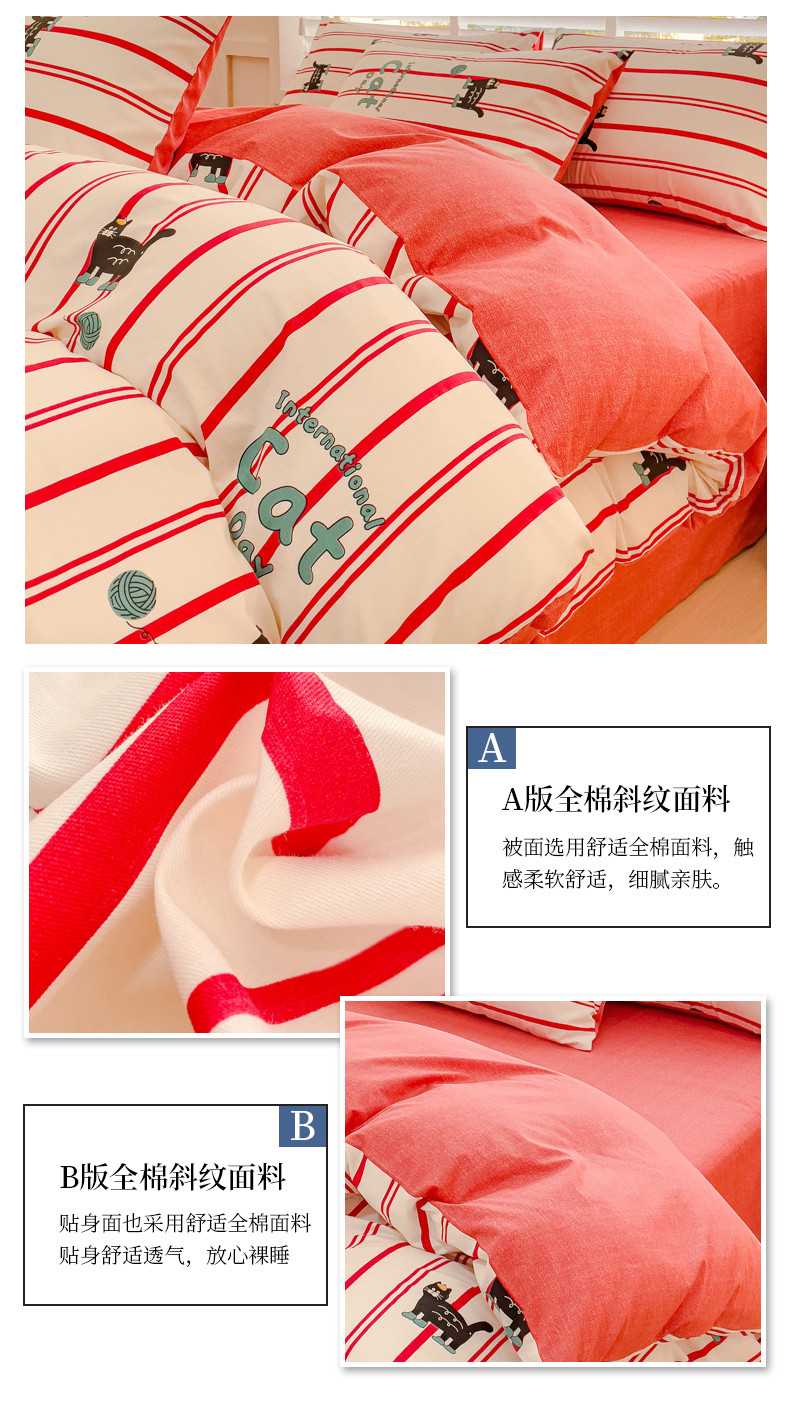 当前位置: 91家纺网 > 商品网购 > 床品套件 > 四件套 > 全棉普通四件套 > 金丝鸟 2023新款全棉可爱卡通印花小清新四件套-第一批 条纹猫咪-红