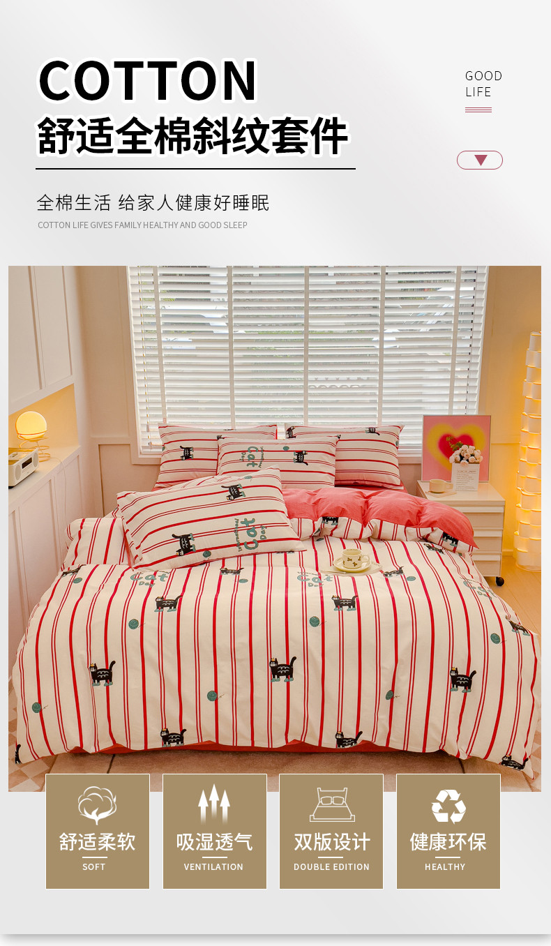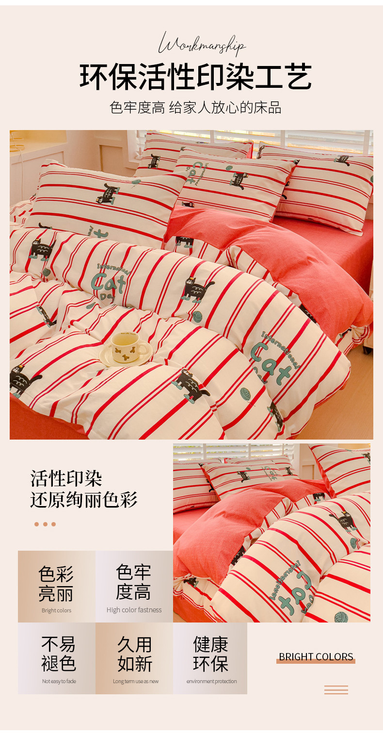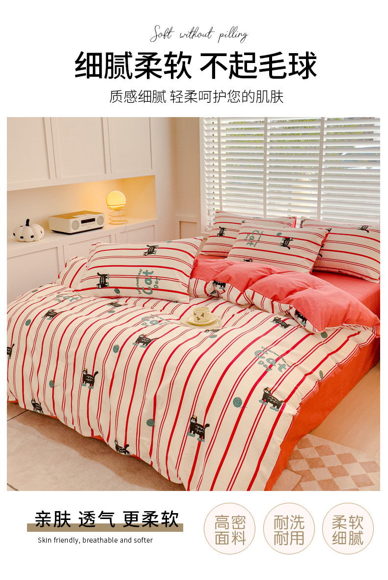 当前位置: 91家纺网 > 商品网购 > 床品套件 > 四件套 > 全棉普通四件套 > 金丝鸟 2023新款全棉可爱卡通印花小清新四件套-第一批 条纹猫咪-红
